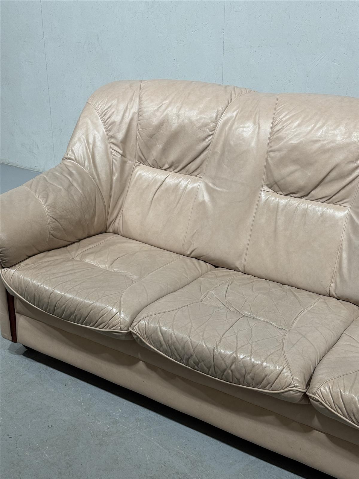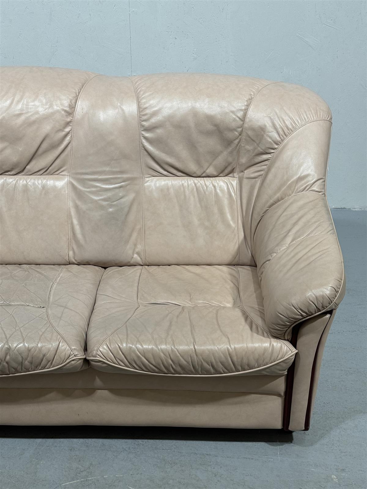 Kolmen istuttava beige nahkasohva, jossa on pehmeät tyynyt ja kaarevat käsinojat.
