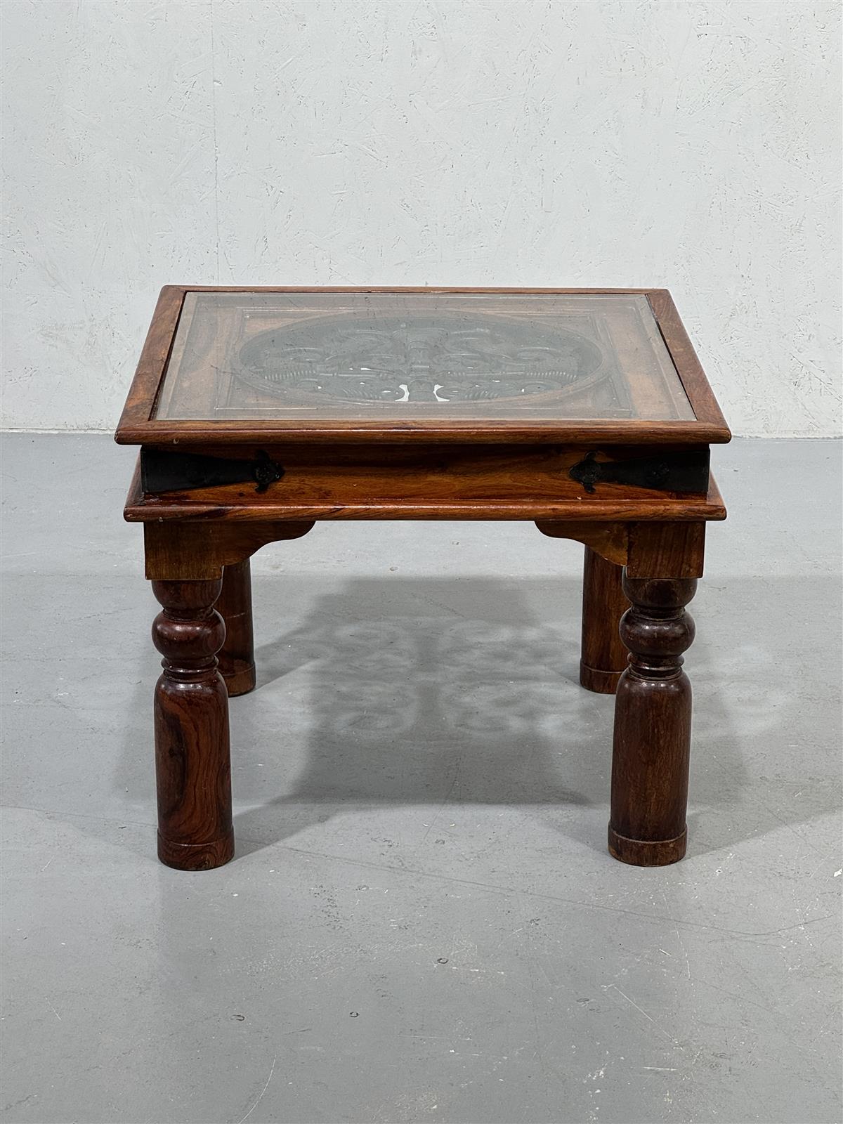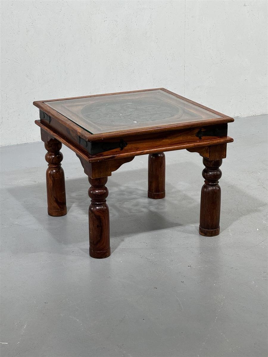 Pieni Aasialainen puupöytä, jossa on lasikansi ja koristeellinen puuhun kaiverrettu koristus sekä metallinen yksityiskohta reunoissa ja keskellä. Pöydän jalat ovat pyöreät ja tukevat, ja siinä on metalliset kulmavahvikkeet, jotka lisäävät sen kestävyyttä. Kaunis!