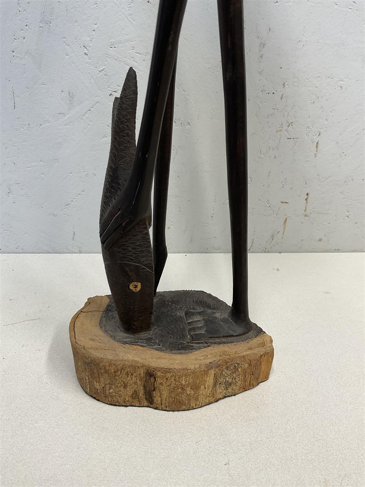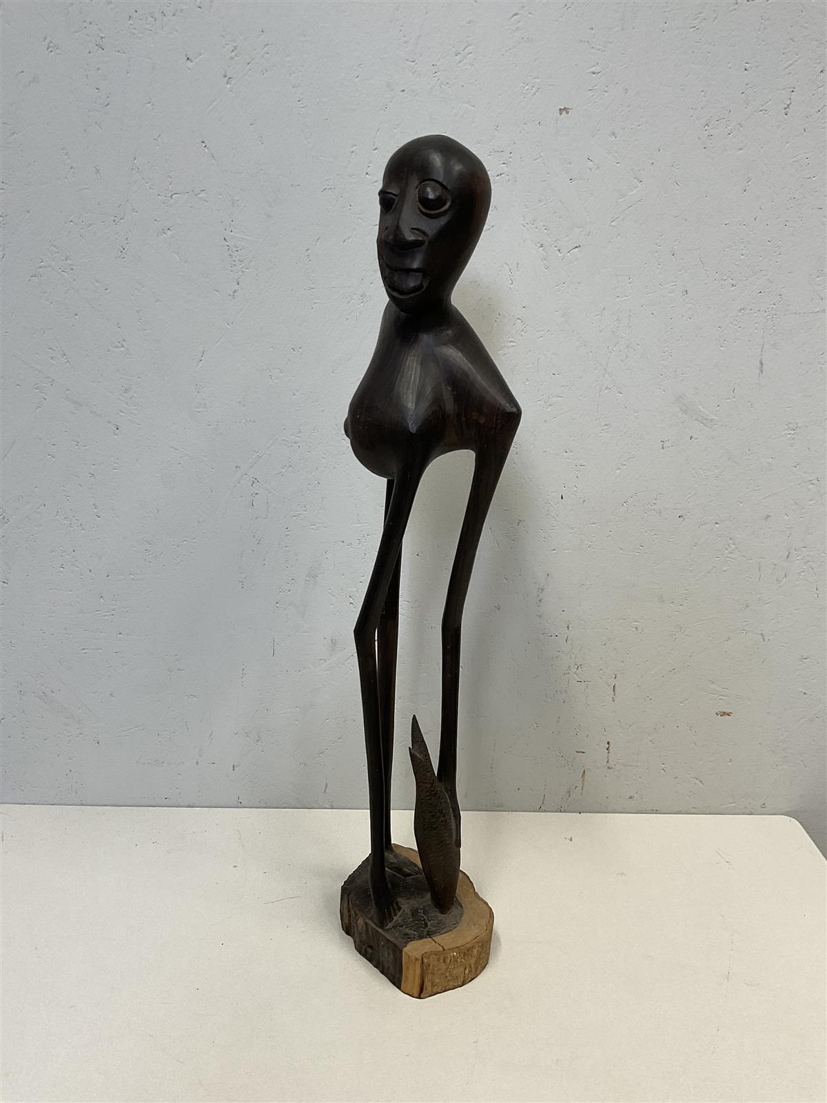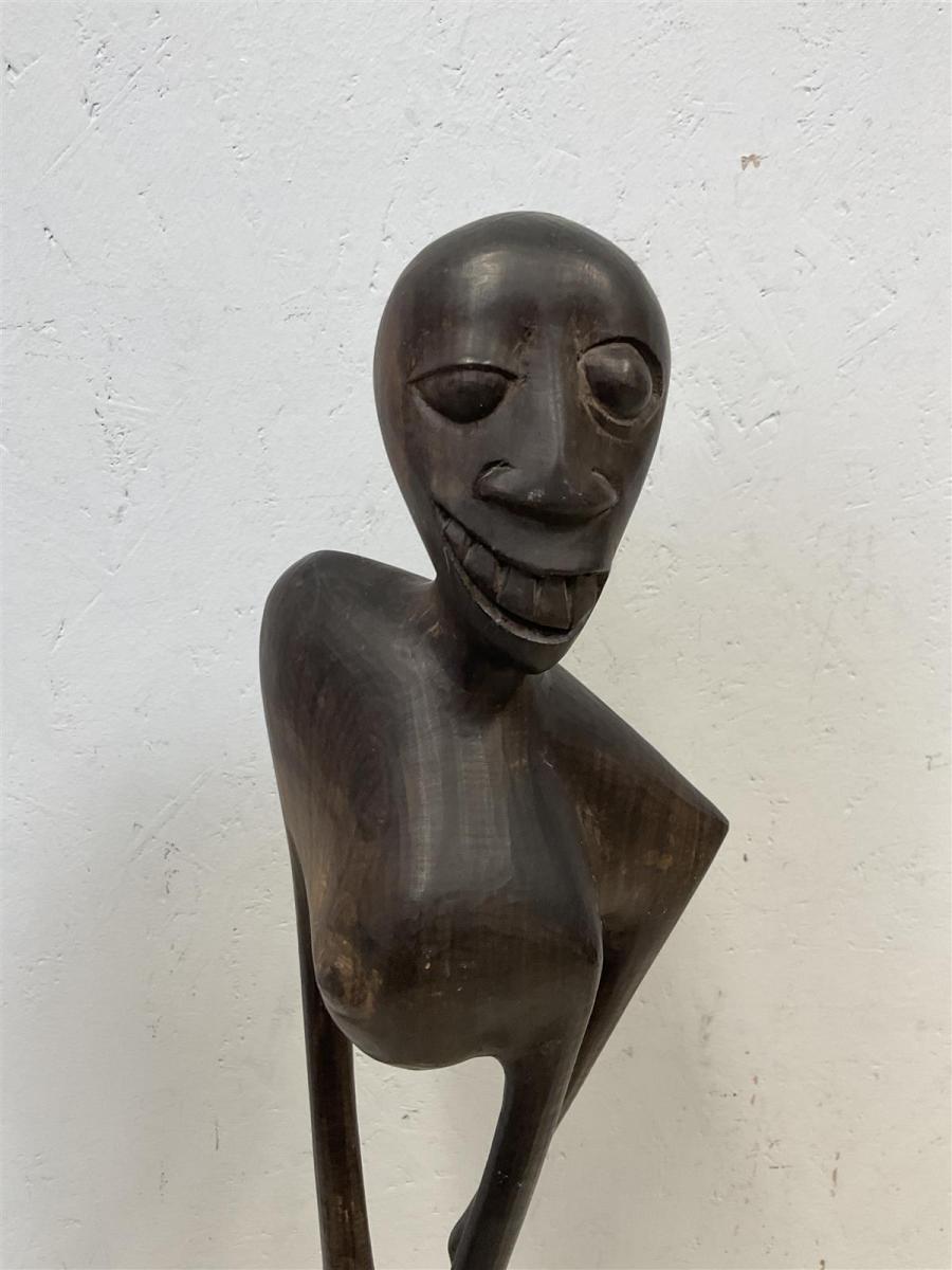 Abstrakti käsintehty puuveistos. Veistos on tummaa puuta ja siinä on yksinkertaiset, mutta ilmeikkäät piirteet. Hahmo seisoo puisella jalustalla.