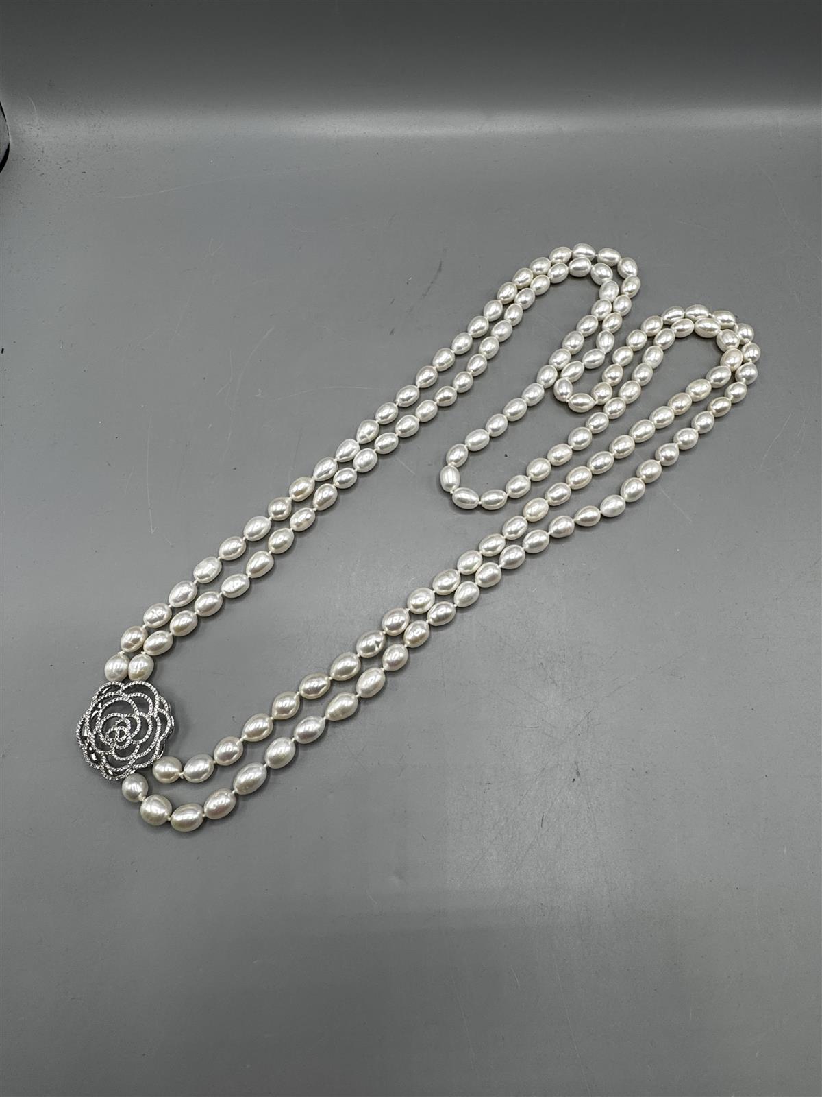 Kaksinkertainen aito helminauha, jossa on koristeellinen kukkakuvio koristeena. Helmet ovat valkoisia ja kiiltäviä.