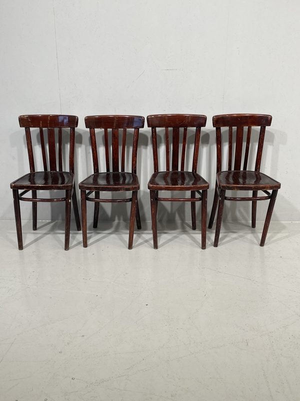 Nämä Thonet-tuolit ovat aidot arviolta 1920-luvun sodan jälkeiset mallit, jossa yhdistyvät tyylikäs viimeistely ja funktionaalisuus. Tuolit on valmistettu taivutetusta puusta ja niiden selkänojissa on tunnusomainen kaarevuus sekä pystysuuntaiset selkärimat. Tuolien pinnassa näkyy selvää kulumaa, naarmuja, maalien kulumista ja mahdollisesti pieniä puukuituja tai liitosten löystymistä voi esiintyä. Alla aito leima.