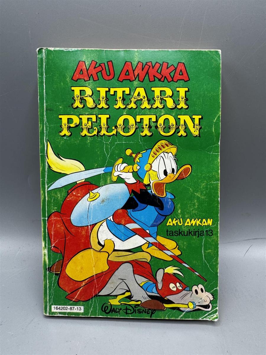 Aku Ankan taskukirja numero 13, Aku Ankka Ritari Peloton, neljäs painos. Sarjakuva hyvässä ikäisekseen kunnossa pinnoiltaan.