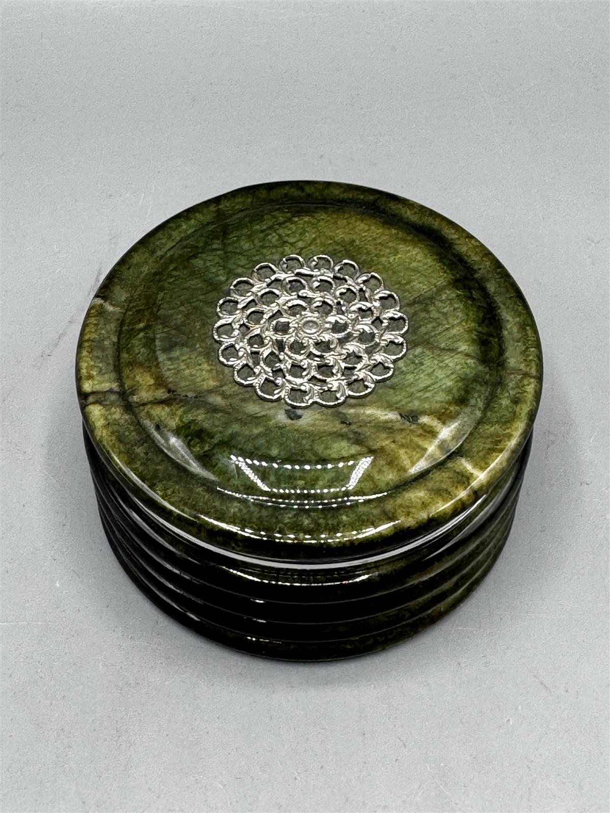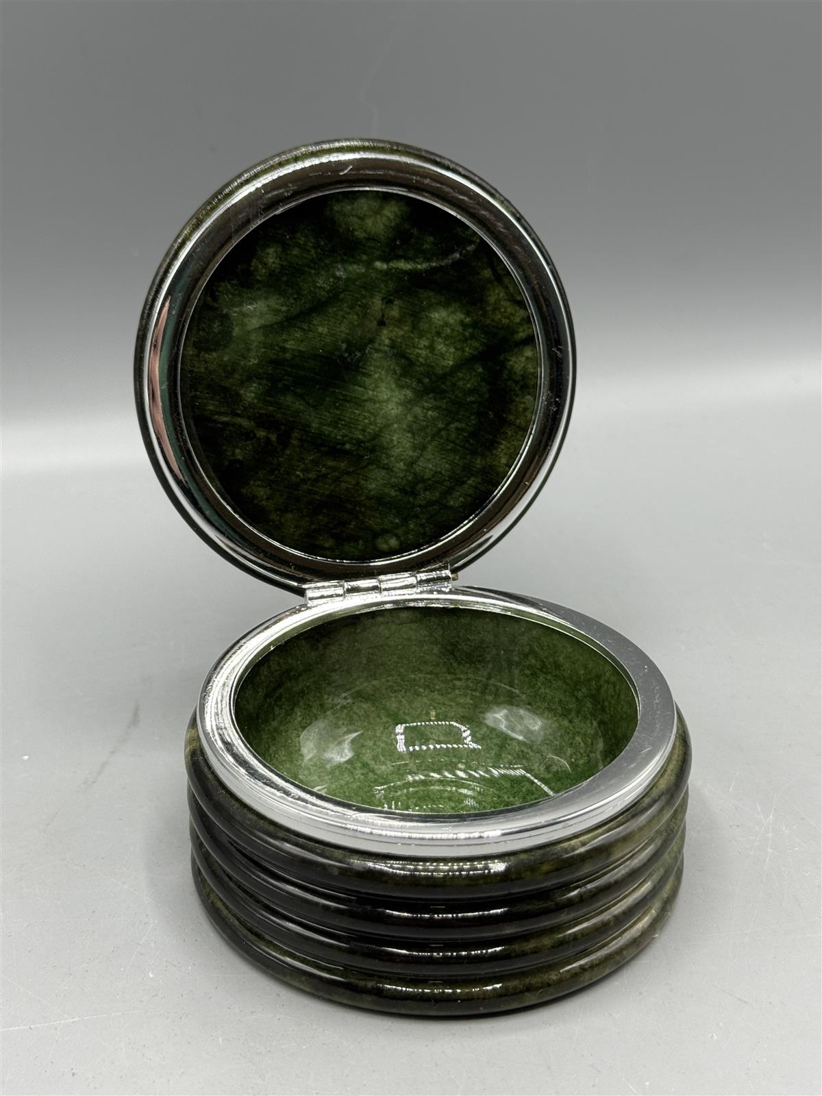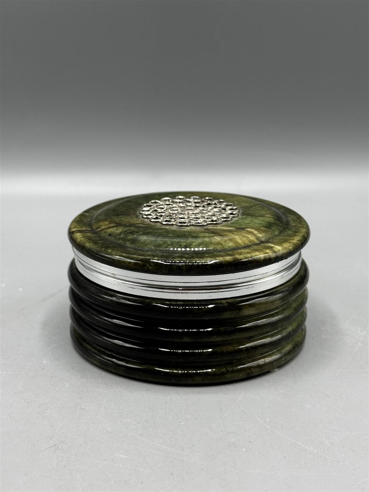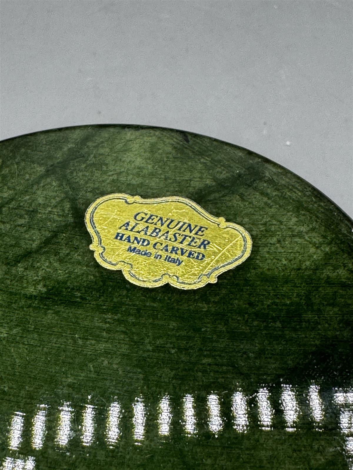 Vihreä alabasterirasia, jossa on koristeellinen metallinen yksityiskohta kannessa. Valmistettu Italiassa, käsin kaiverrettu.