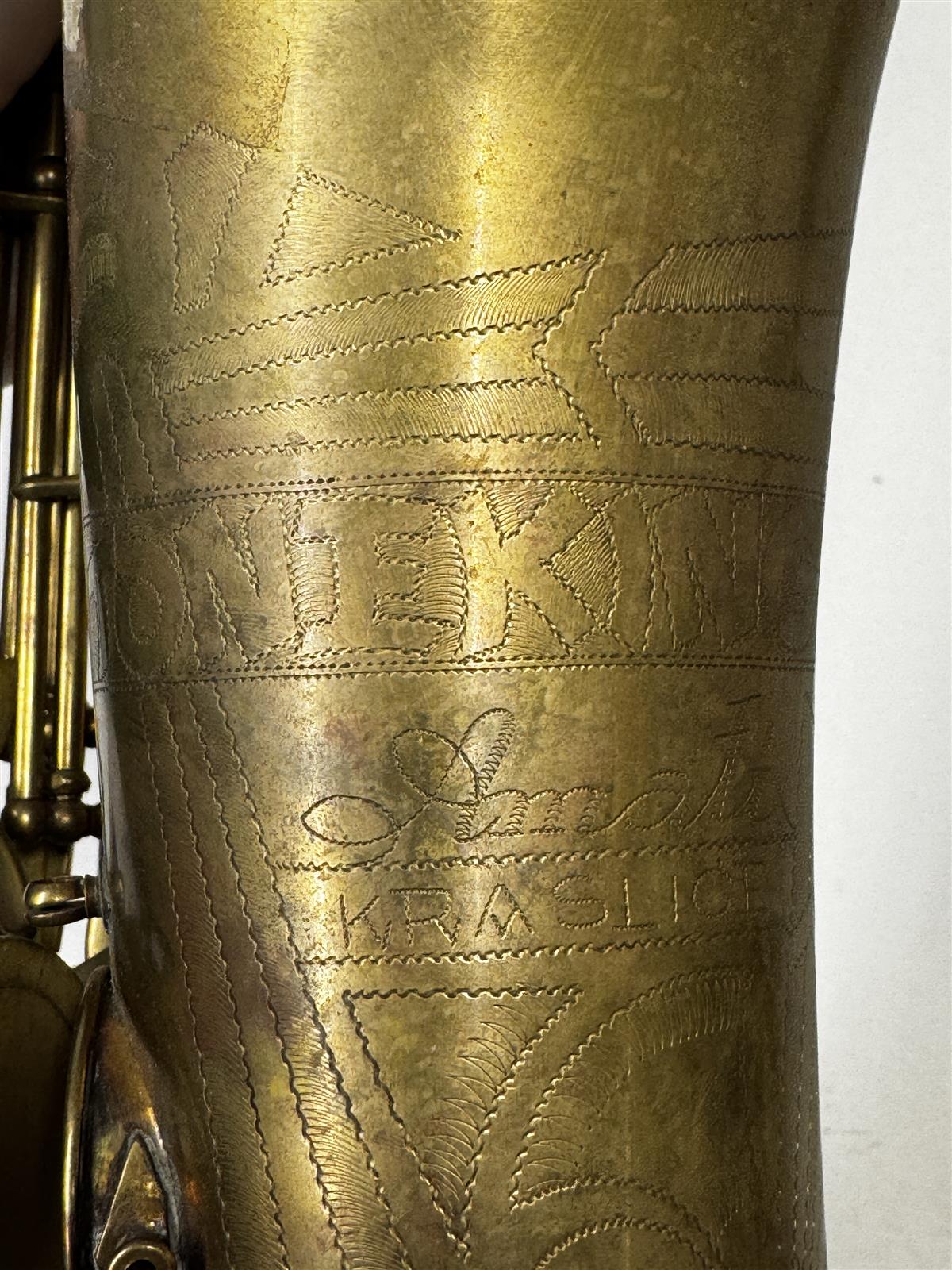 Vintage Amati Kraslice Toneking saksofoni, valmistettu Tsekkoslovakiassa numerolla 24217 eli arviolta 60 lukua. Tämä soitin on valmistettu messingistä ja siinä on kauniit kaiverrukset rungossa. Suukappale on myös messinkiä (Made in France).