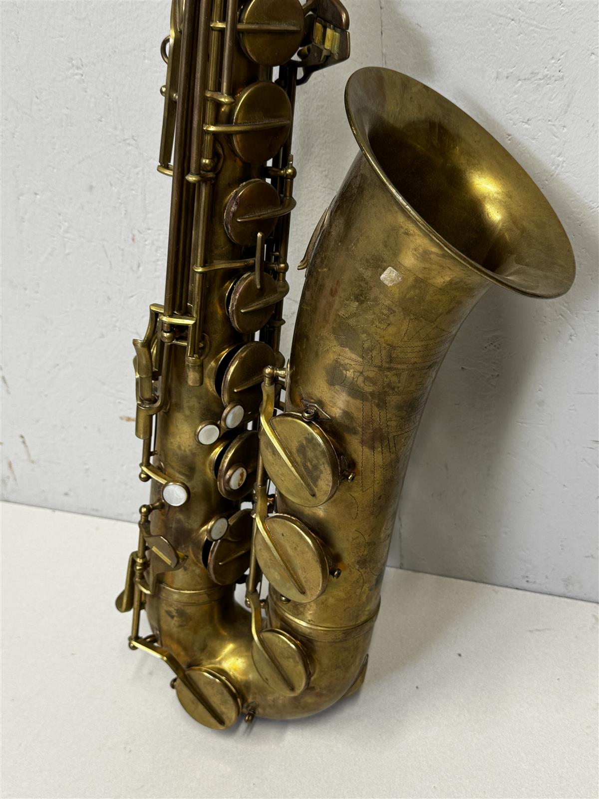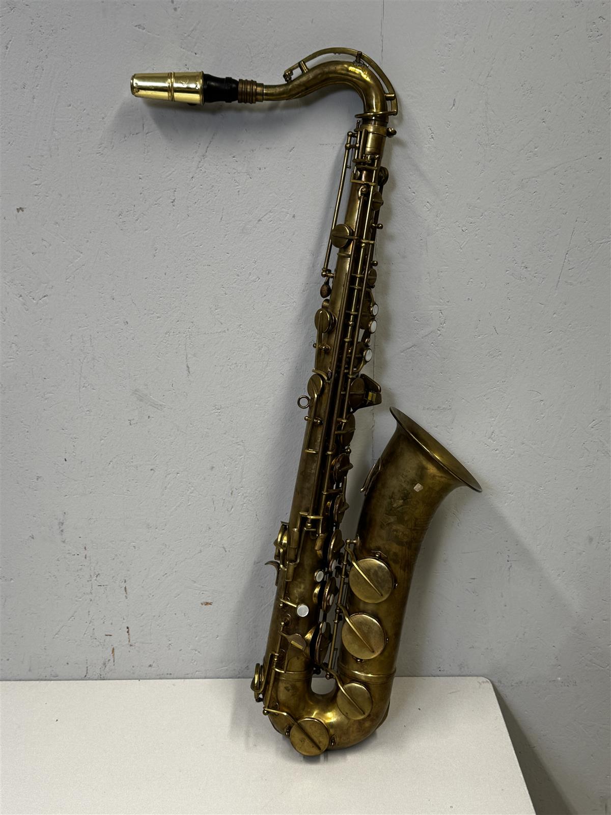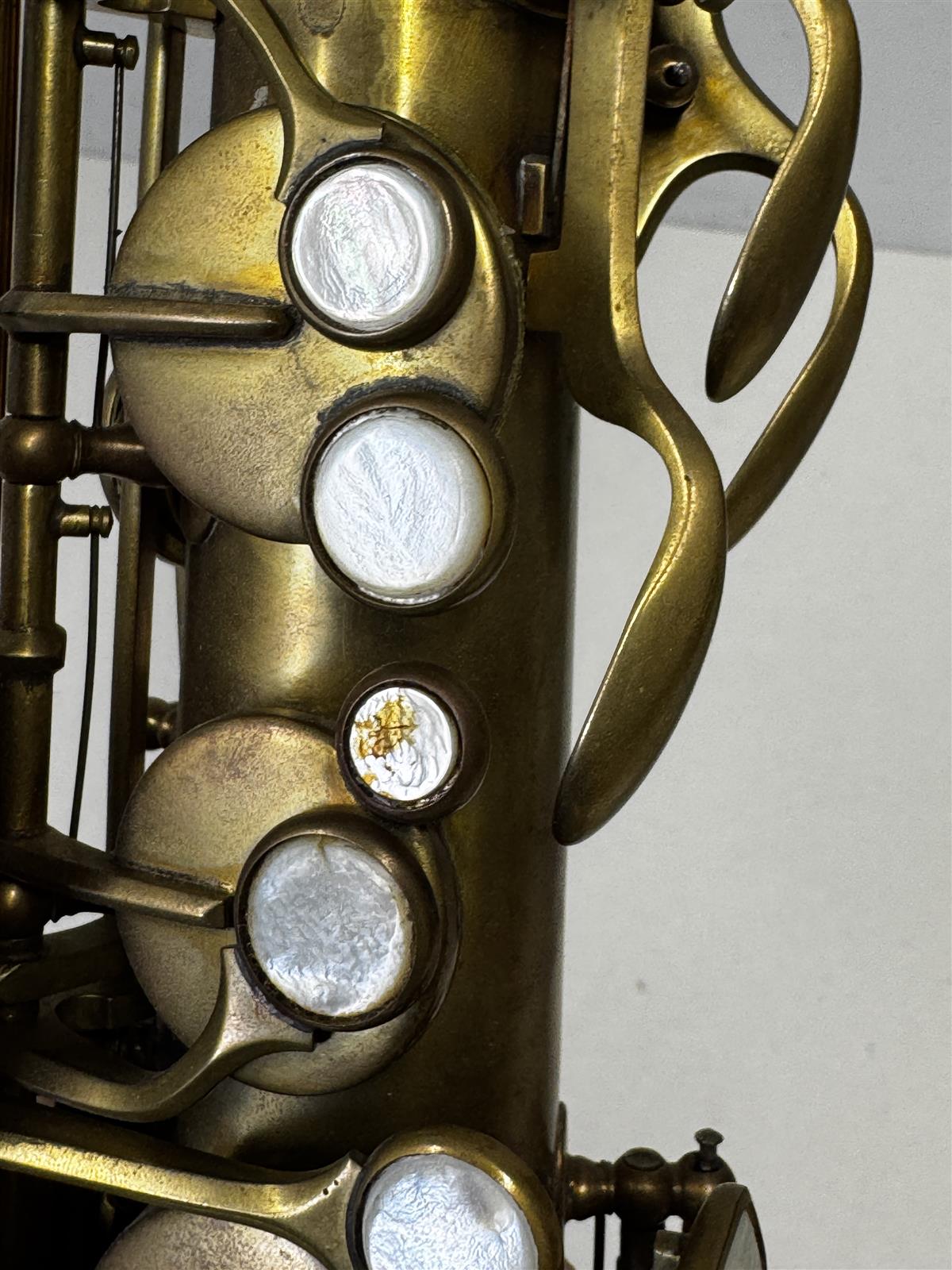 Saksofonissa on selkeitä käytön jälkiä, kuten naarmuja ja patinaa. Näppäimet ovat kuluneet. Yleisilmeeltään soitin on vanha ja kaipaa huoltoa, mutta se on silti vaikuttava esine. Ei testattu toimintoja, myydään sellaisenaan.