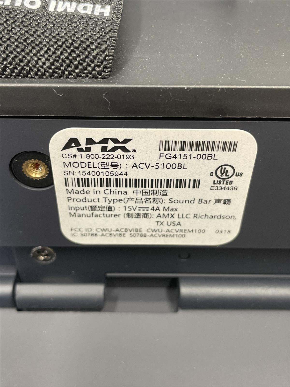 AMX ACV-5100BL videoneuvottelu soundbar Full HD kameralla, jossa on useita liitäntämahdollisuuksia, kuten HDMI, USB ja optinen audio. Laitteessa on myös RS-232 liitäntä.