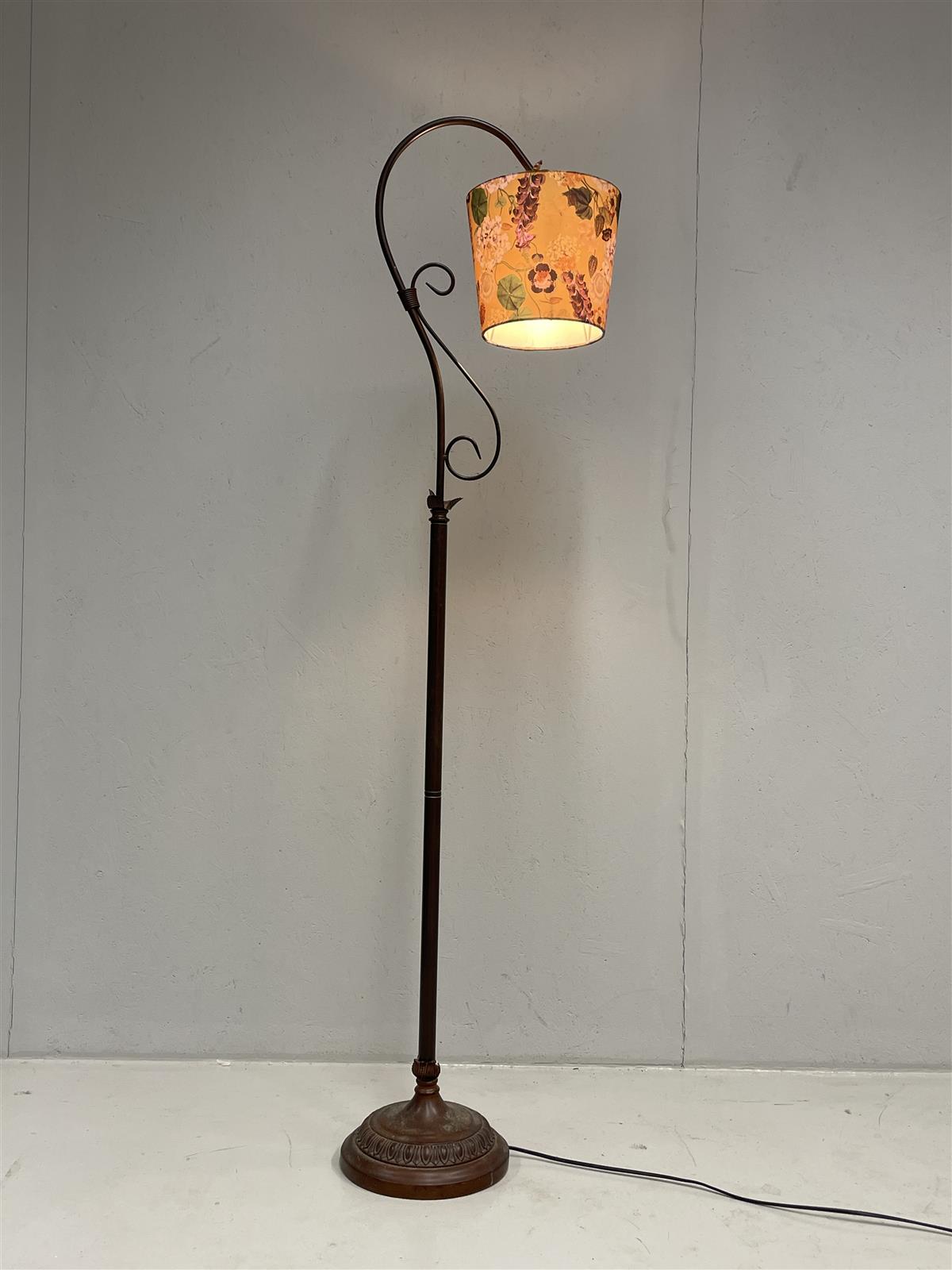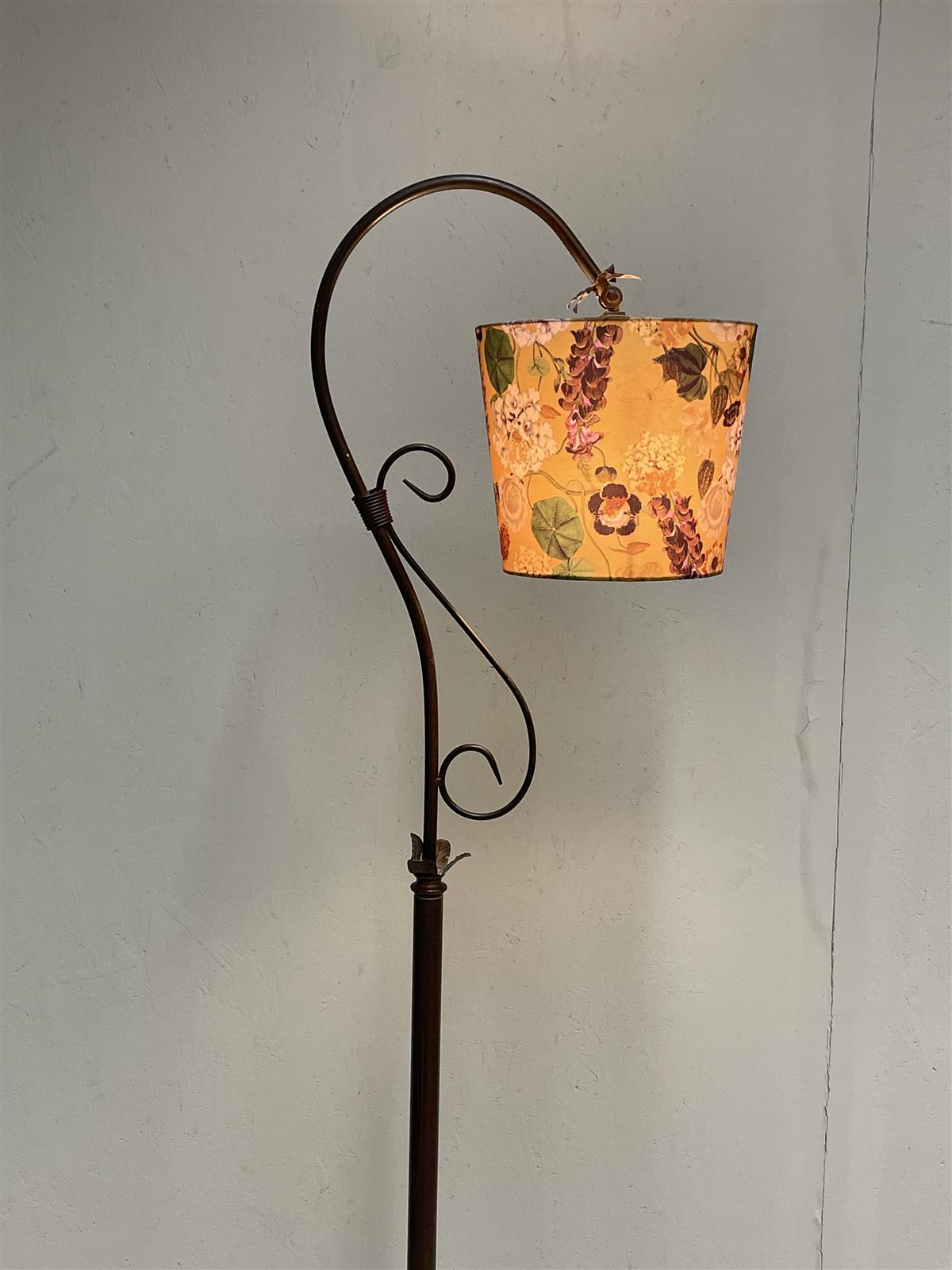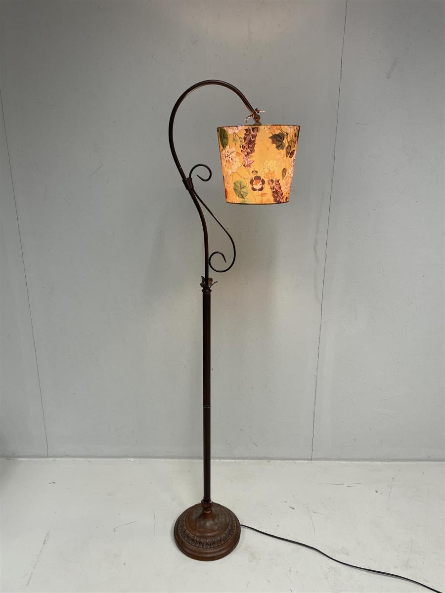 Aneta Country lattiavalaisin, jossa on kukkakuvioinen varjostin. Valaisimen metallinen runko on koristeellinen ja siinä on kaareva muotoilu.