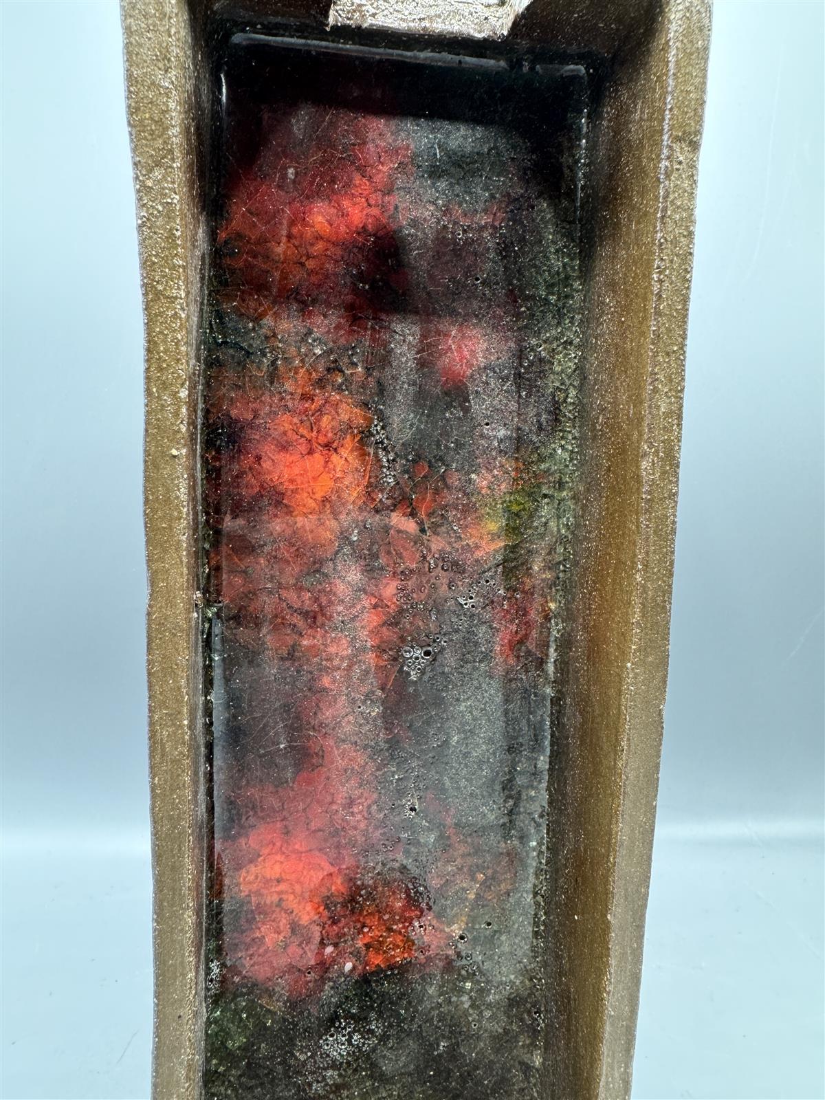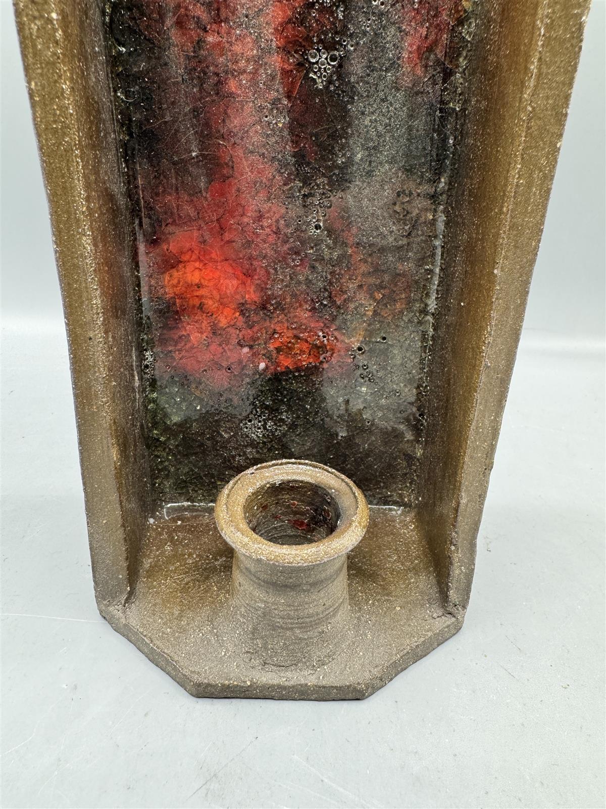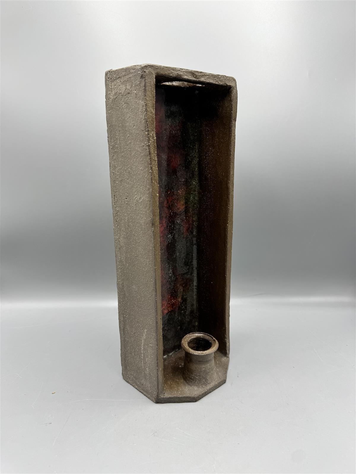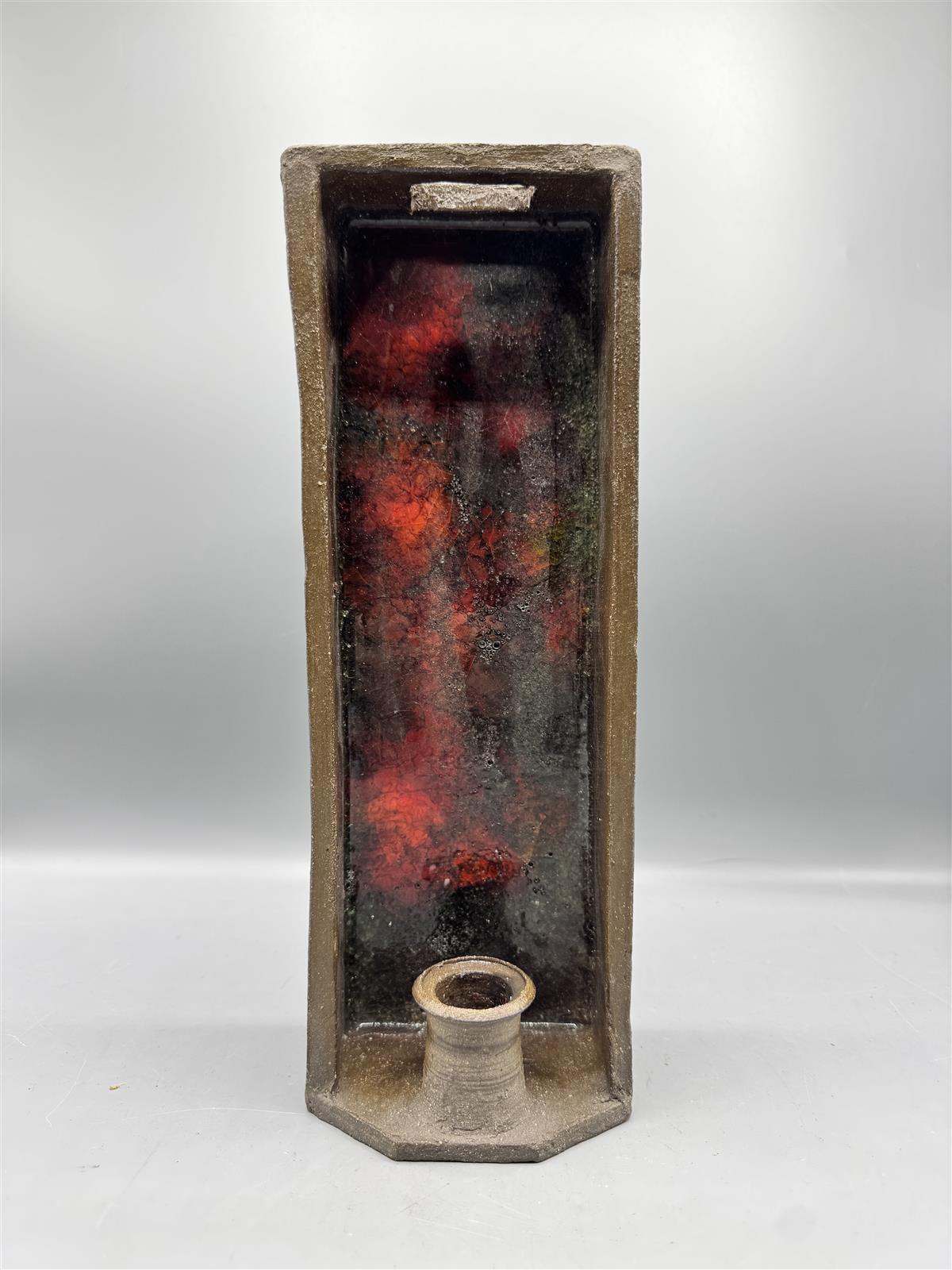 Korkea ja kapea kynttilänjalka, jossa on syvä, punertava lasitus sisäpuolella. Kynttilänjalka on valmistettu keraamisesta materiaalista ja siinä on selkeä, suoraviivainen muotoilu. Pohjassa on taiteilija signeeraus ’Anita Schulman Finland’.