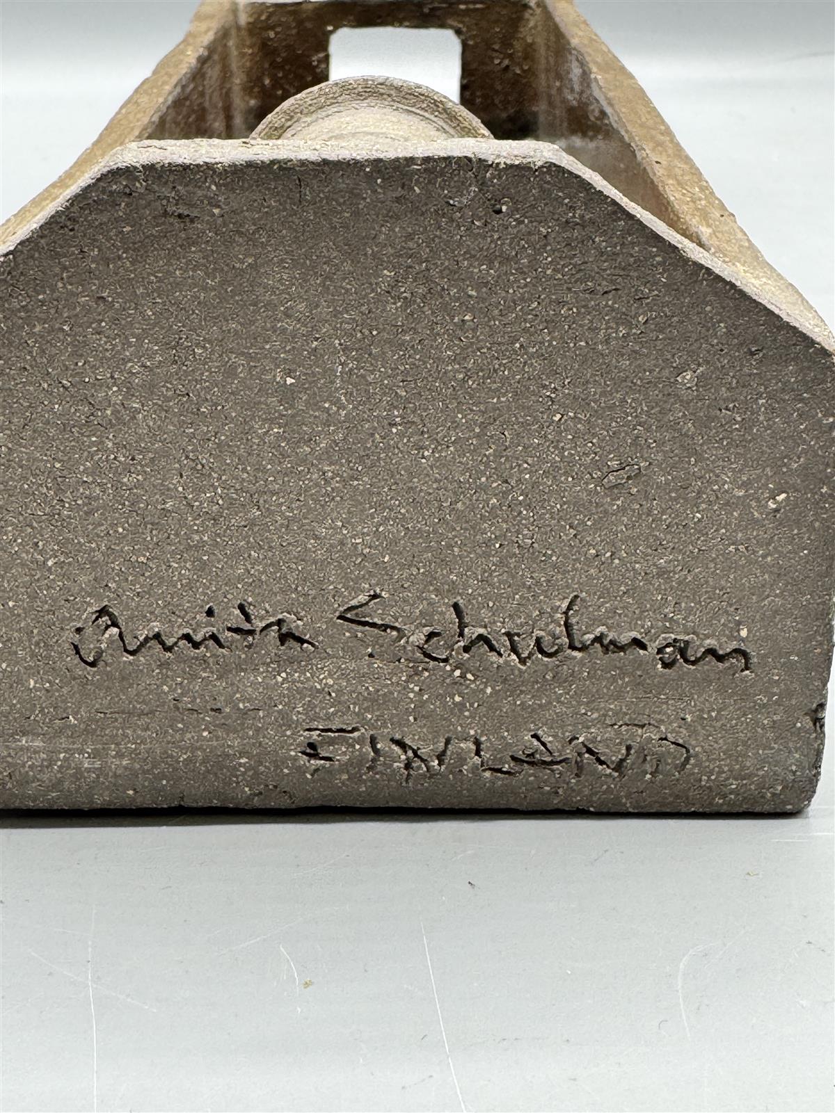 Tämä kynttilänjalka edustaa modernia suomalaista keramiikkataidetta. Anita Schulman on suomalainen keramiikkataiteilija, ja hänen teoksensa ovat arvostettuja sekä kotimaassa että kansainvälisesti.