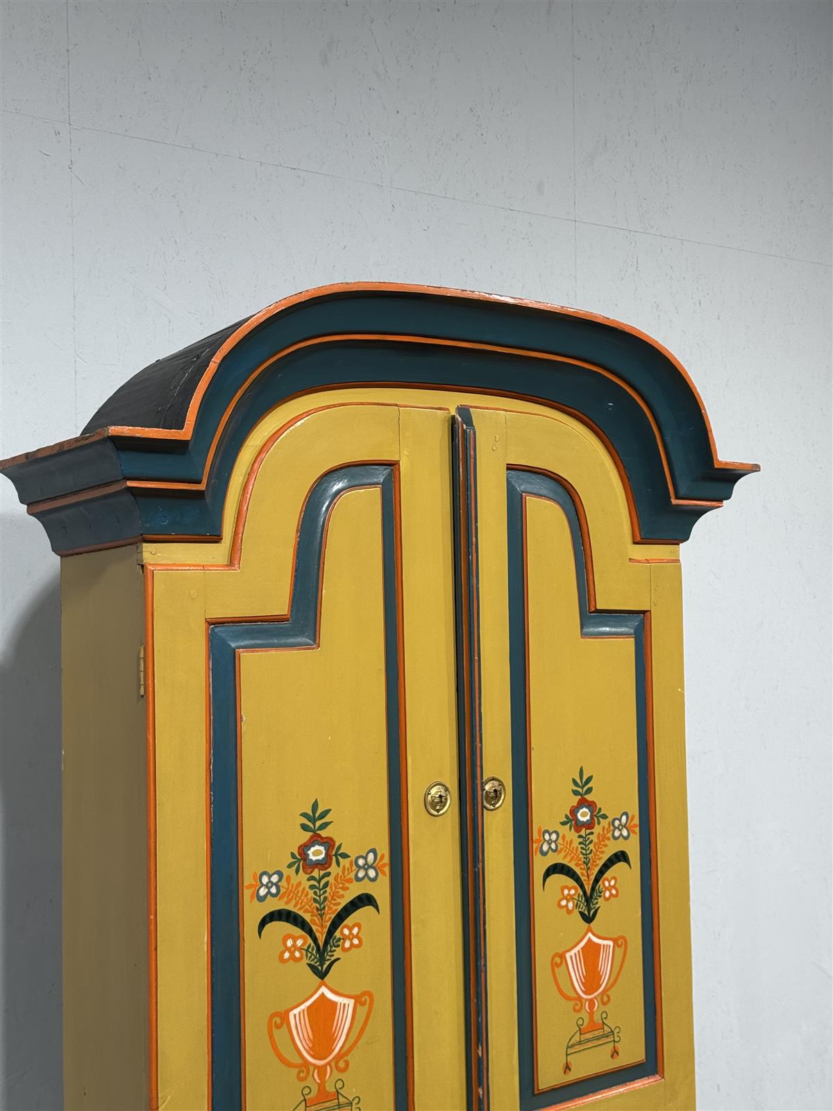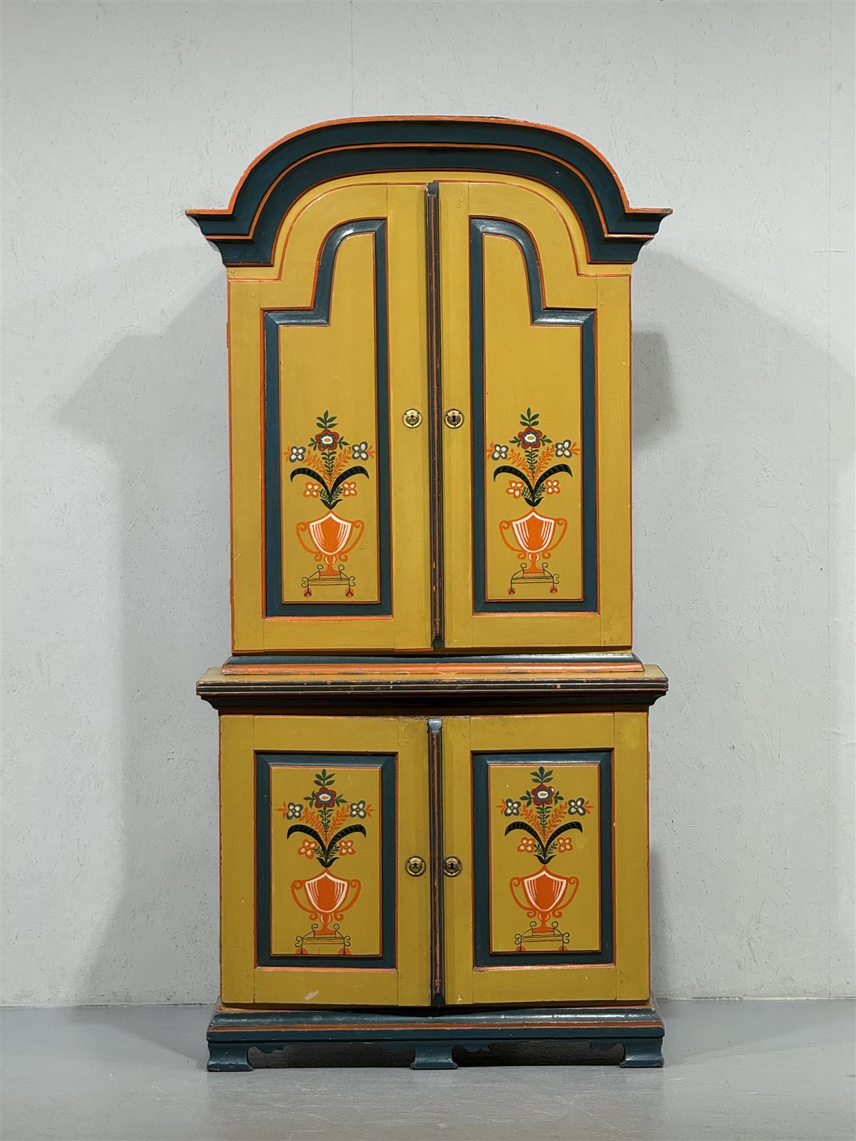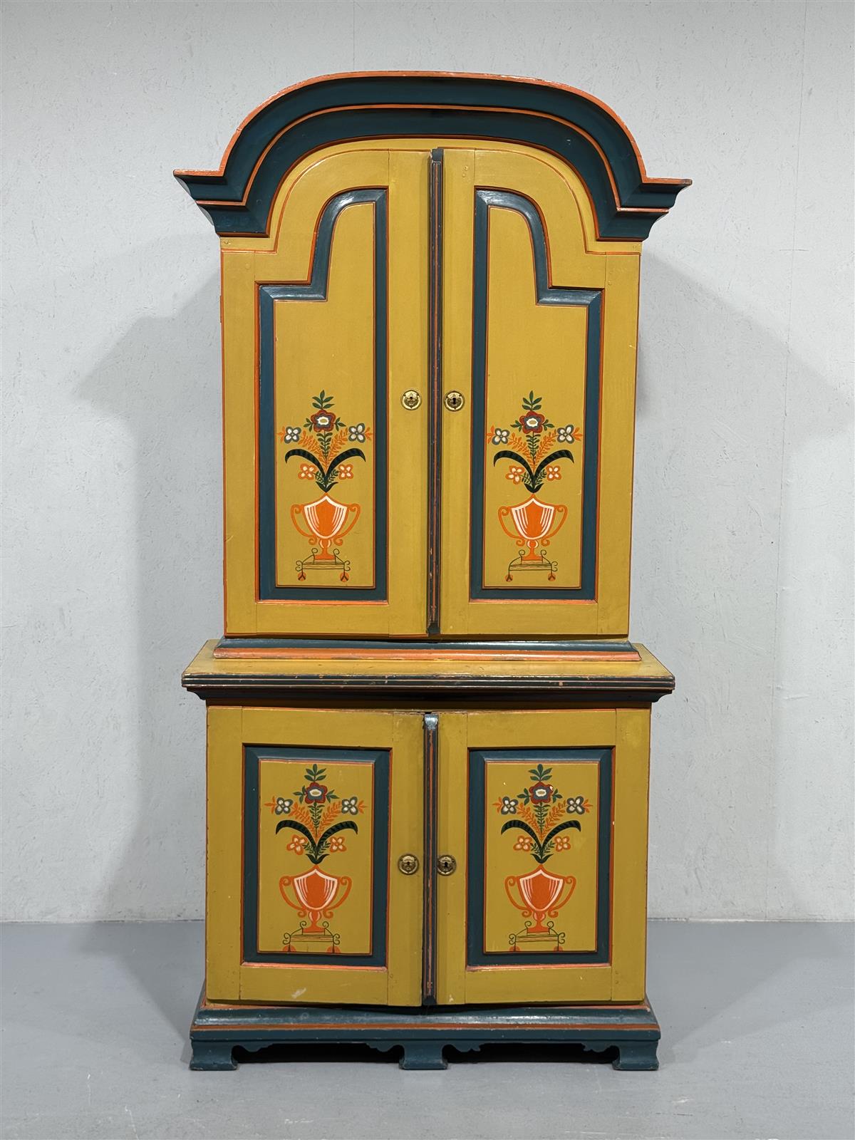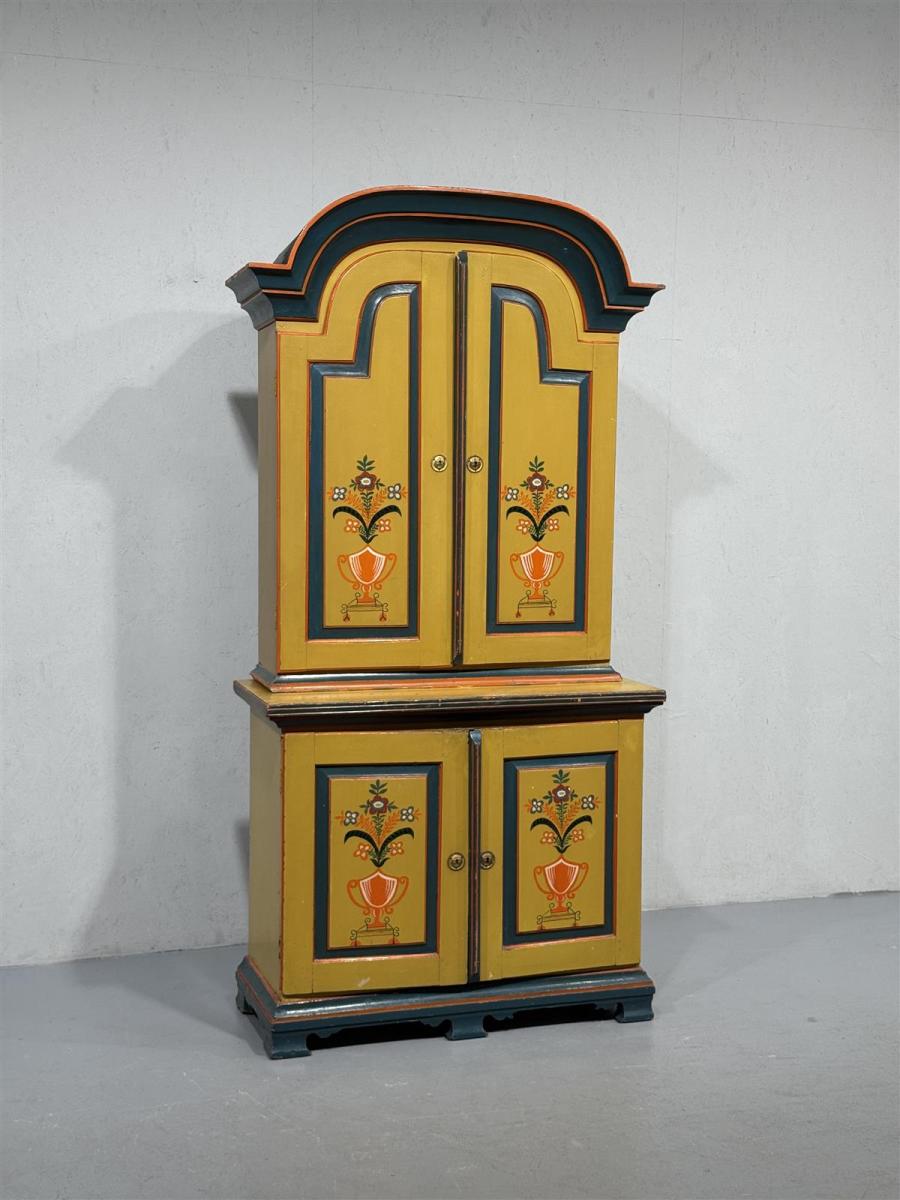 Värikäs talonpoikaistyyliä edustava astiakaappi, jossa on koristeelliset kukkamaalaukset ovissa. Kaapissa on kaksi ylä- ja alakaappia, jotka tarjoavat runsaasti säilytystilaa. Kaapin yläosa on kaareva ja korostaa sen perinteistä muotoilua.