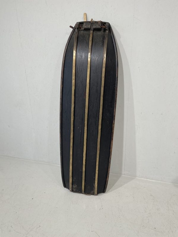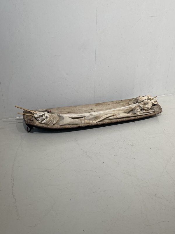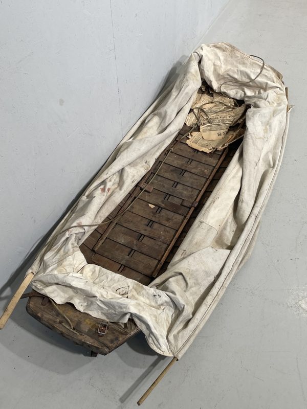 YLE tuotannoissa käytetty antiikkinen kelkka tai ahkio. Puiseen runkoon on kiinnitetty kangassuoja, ja alla metalliset tuet. Sisältä löytyy myös vanhojen sanomalehtien osia – mikähän tuotanto tätä on viimeksi YLEllä käyttänyt?