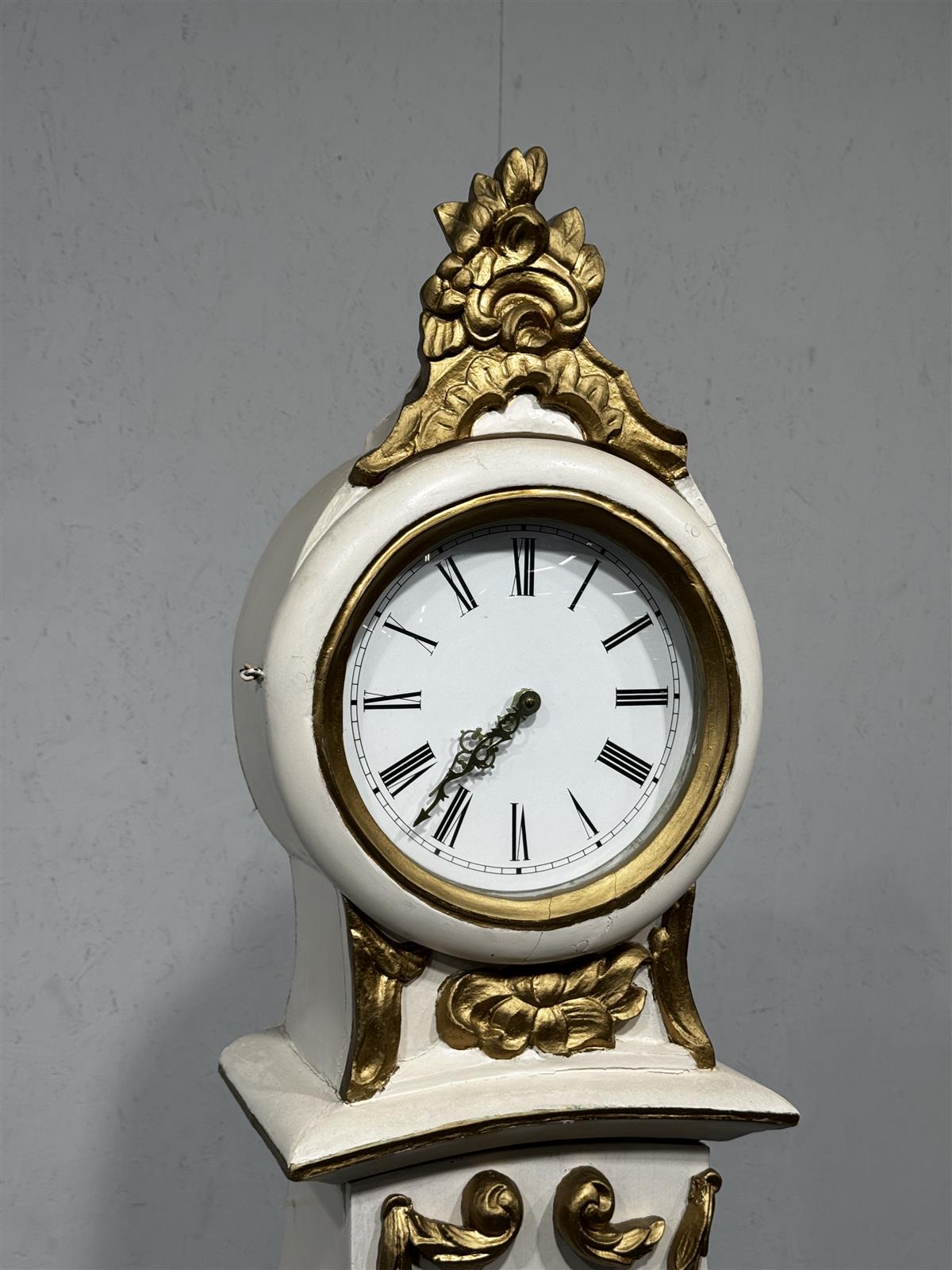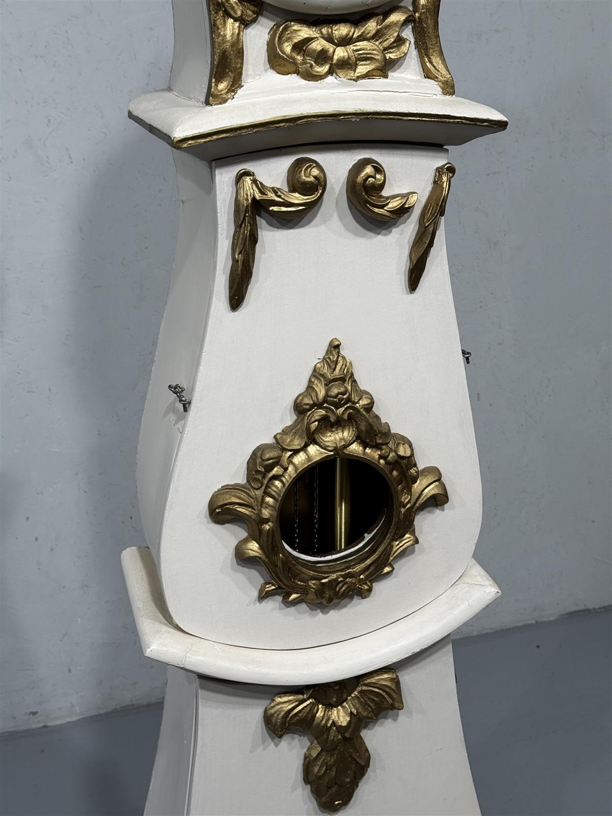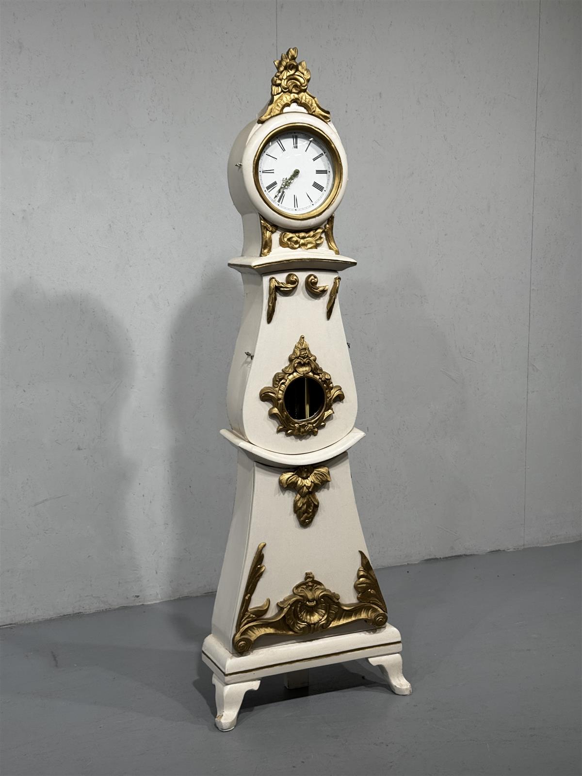 Antiikkinen lattiakello, jossa on koristeellisia kultaisia yksityiskohtia. Kellotaulu on valkoinen ja siinä on roomalaiset numerot. Kello toimii painomekanismilla, ja sen sisäosat ovat näkyvissä. Kellon osat vaikuttavat vaihdetuilta, koneisto toimi testissä.