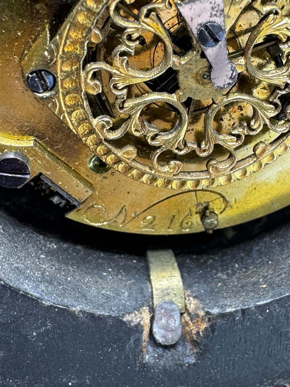 Kellossa on havaittavissa kulumaa ja patinaa, mikä on tyypillistä vanhoille esineille. Kellokoneistossa merkintä No 216