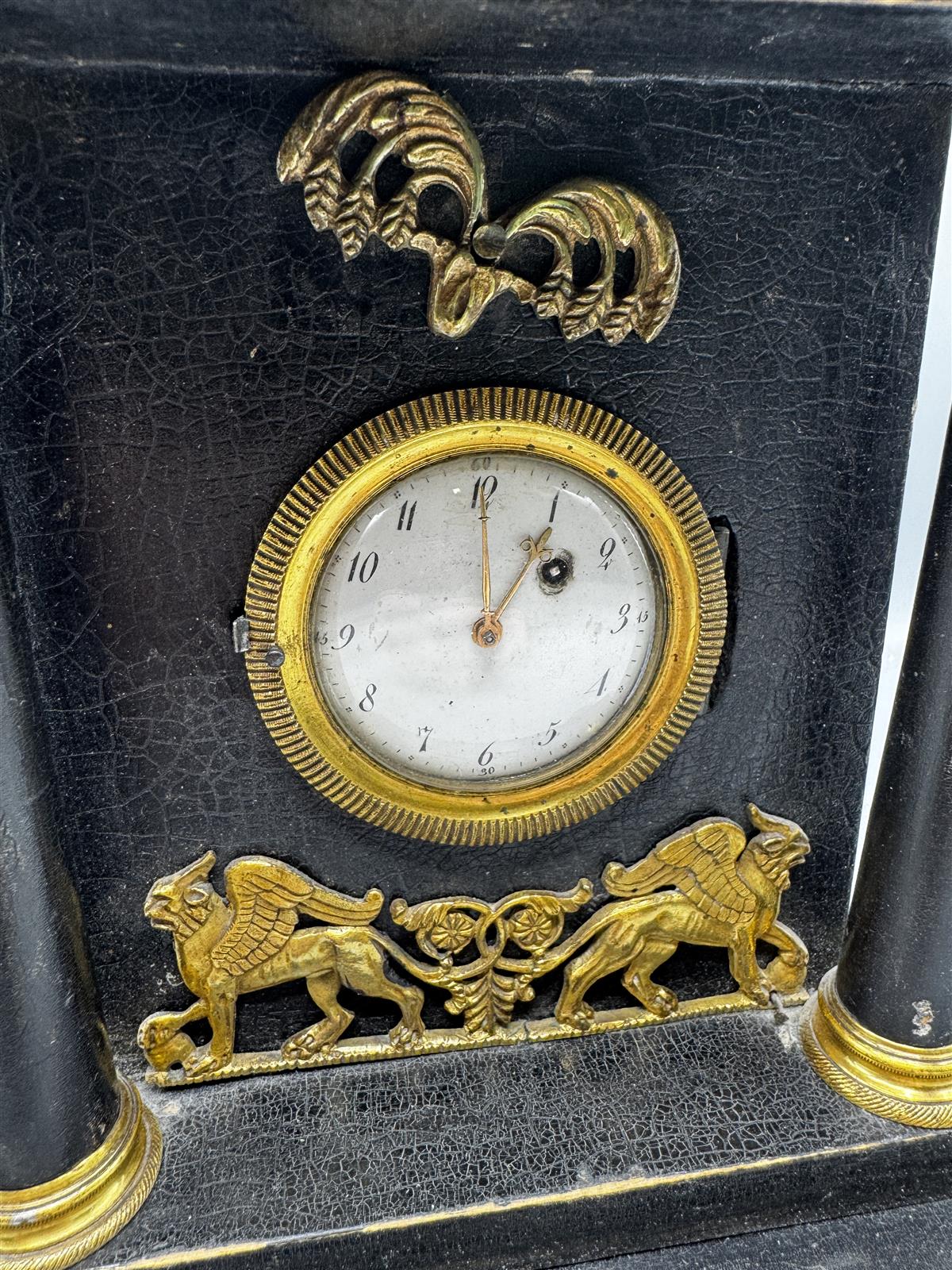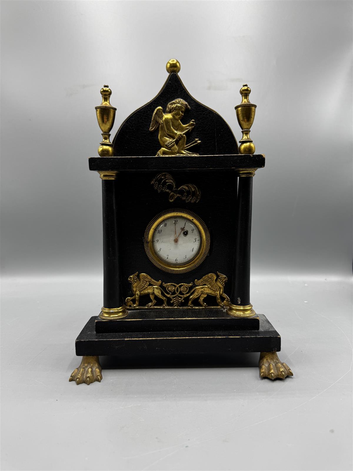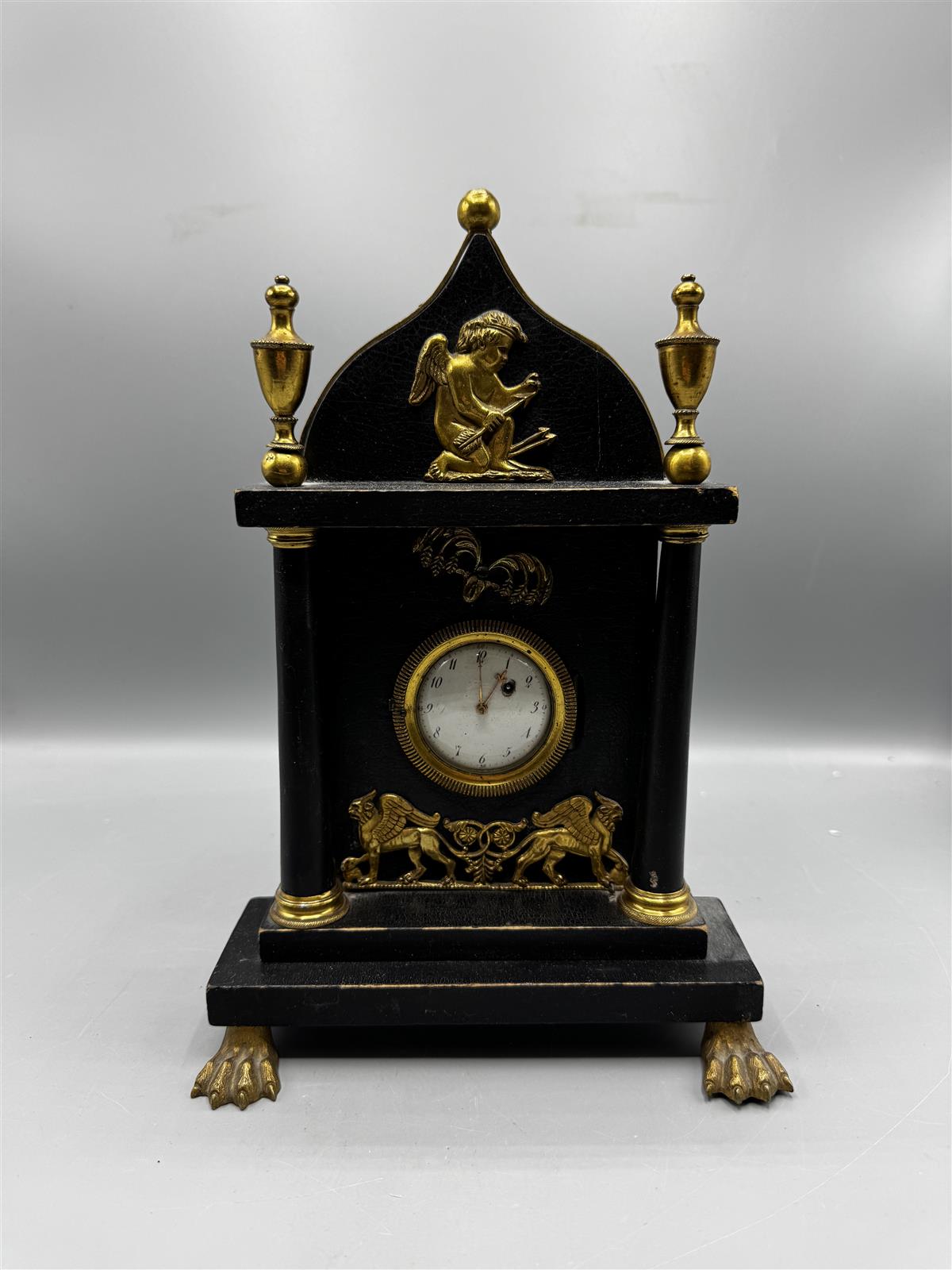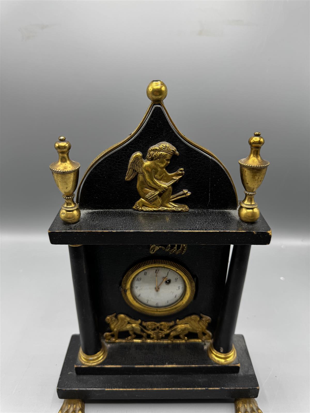 Empire-tyylinen antiikkinen pöytäkello arviolta 1800 lukua, jossa on koristeellisia kultaisia yksityiskohtia ja pieni pyöreä kellotaulu. Kelloa koristavat enkelihahmo ja leijonat.