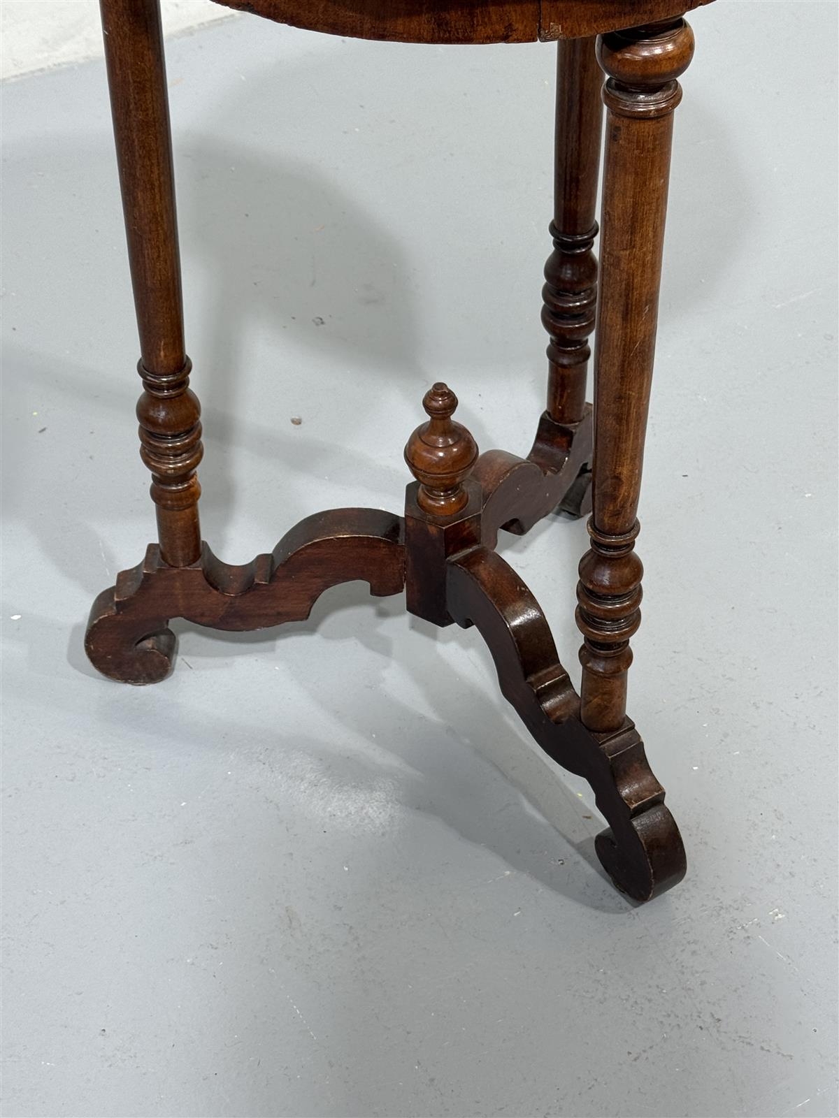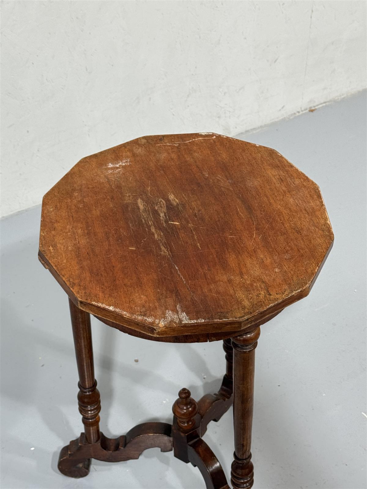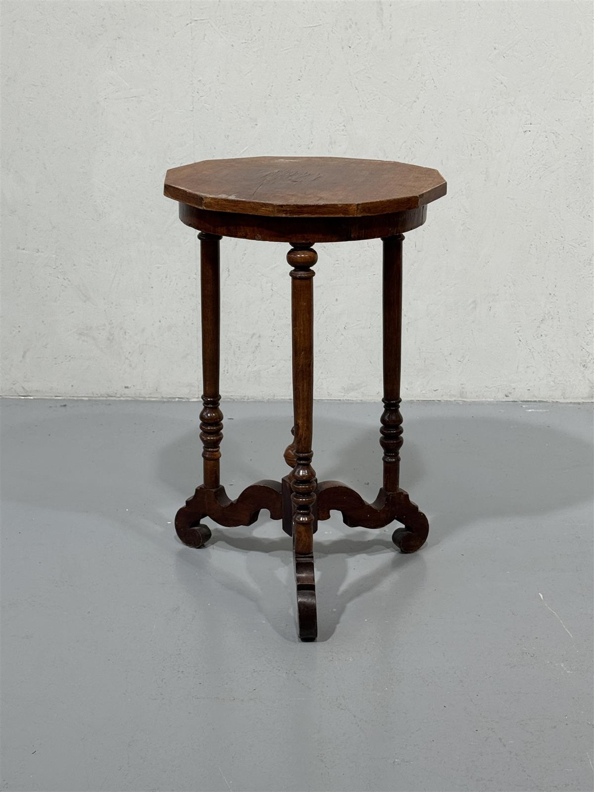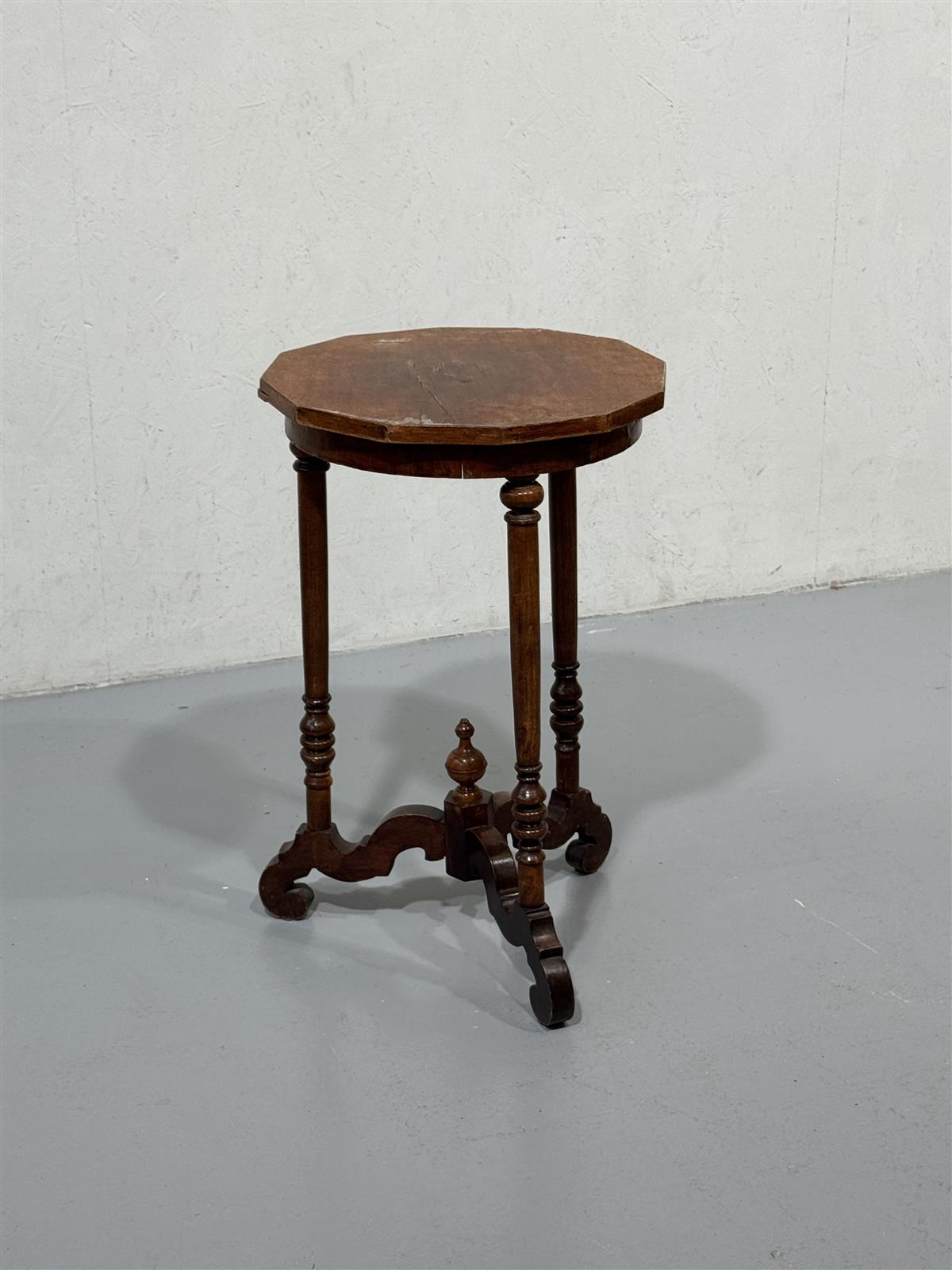 Pieni puinen sivupöytä, jossa on kahdeksankulmainen kansi ja koristeelliset jalat. Pöydän jalat ovat kapeat ja niissä on koristeellisia yksityiskohtia, jotka tuovat esiin käsityön taidon. Pöydän keskellä on koristeellinen puinen yksityiskohta, joka yhdistää jalat toisiinsa. Arviolta 1900 luvun alkupuolta.