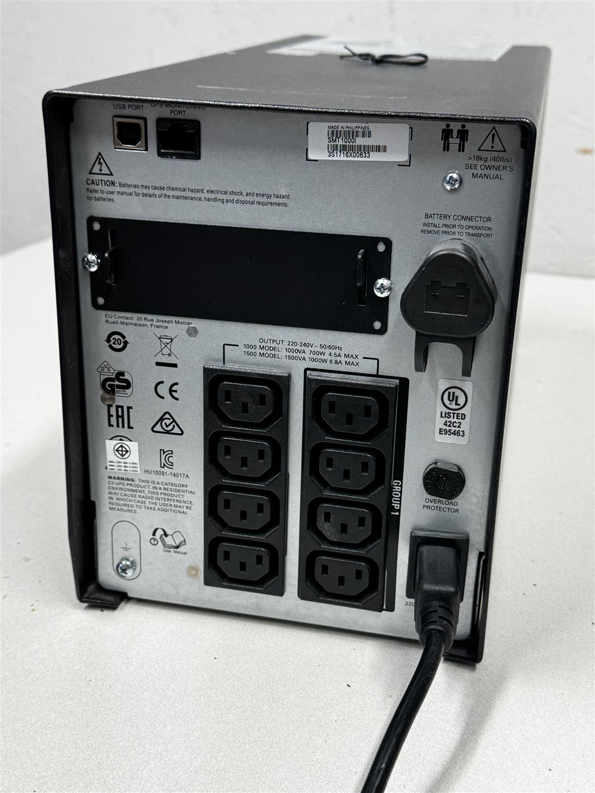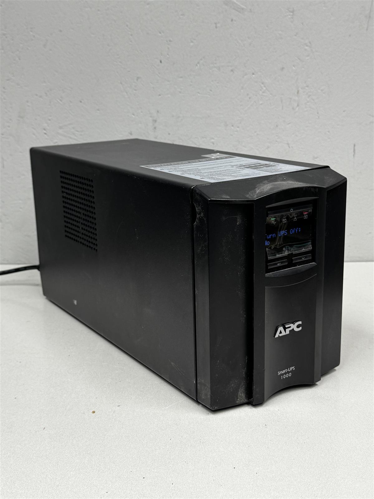 APC Smart-UPS 1000 on varavirtalähde. Laitteessa on useita pistorasioita ja USB-portti. APC Smart-UPS 1000 on keskeytymätön virransyöttöjärjestelmä (UPS).