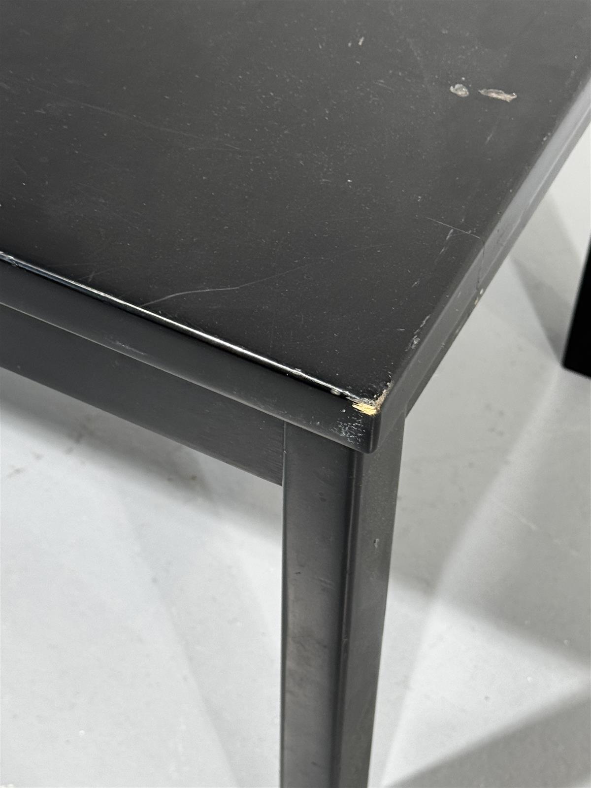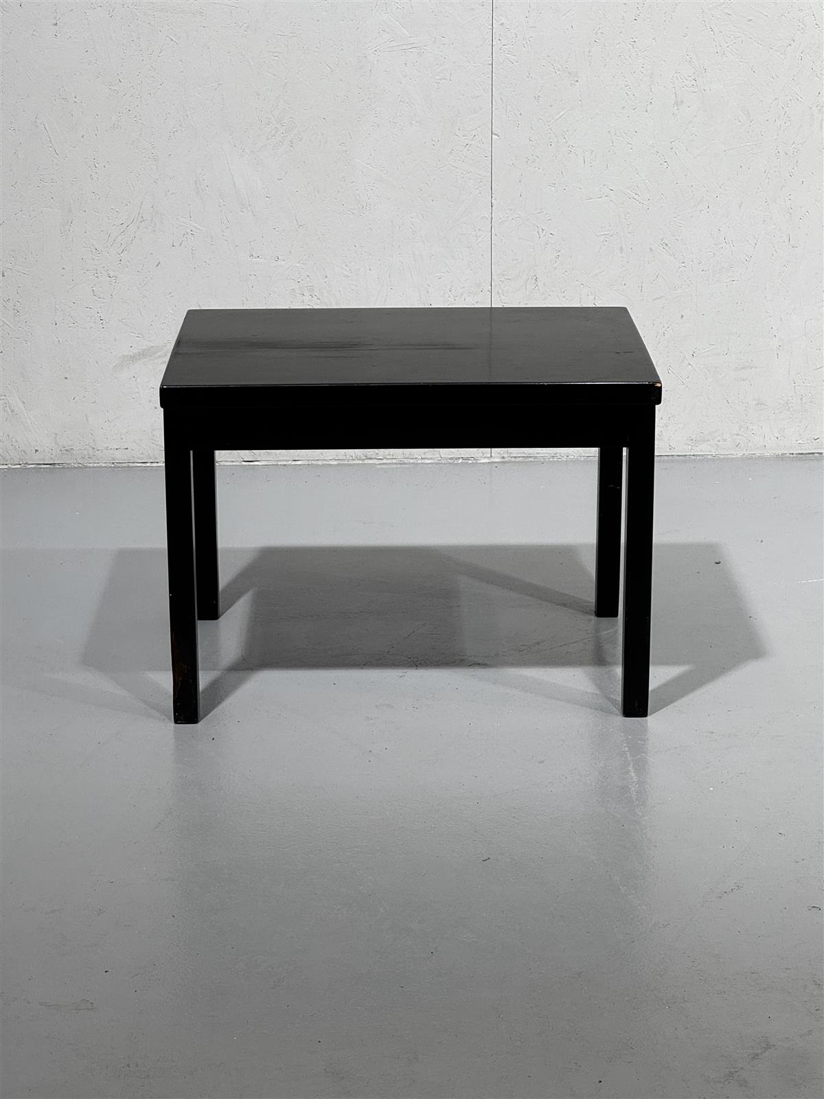 Musta puinen apupöytä, jossa on neljä jalkaa ja suorakulmainen muoto. Pöydän pinta on tasainen ja siinä on havaittavissa kulumaa reunoilla.