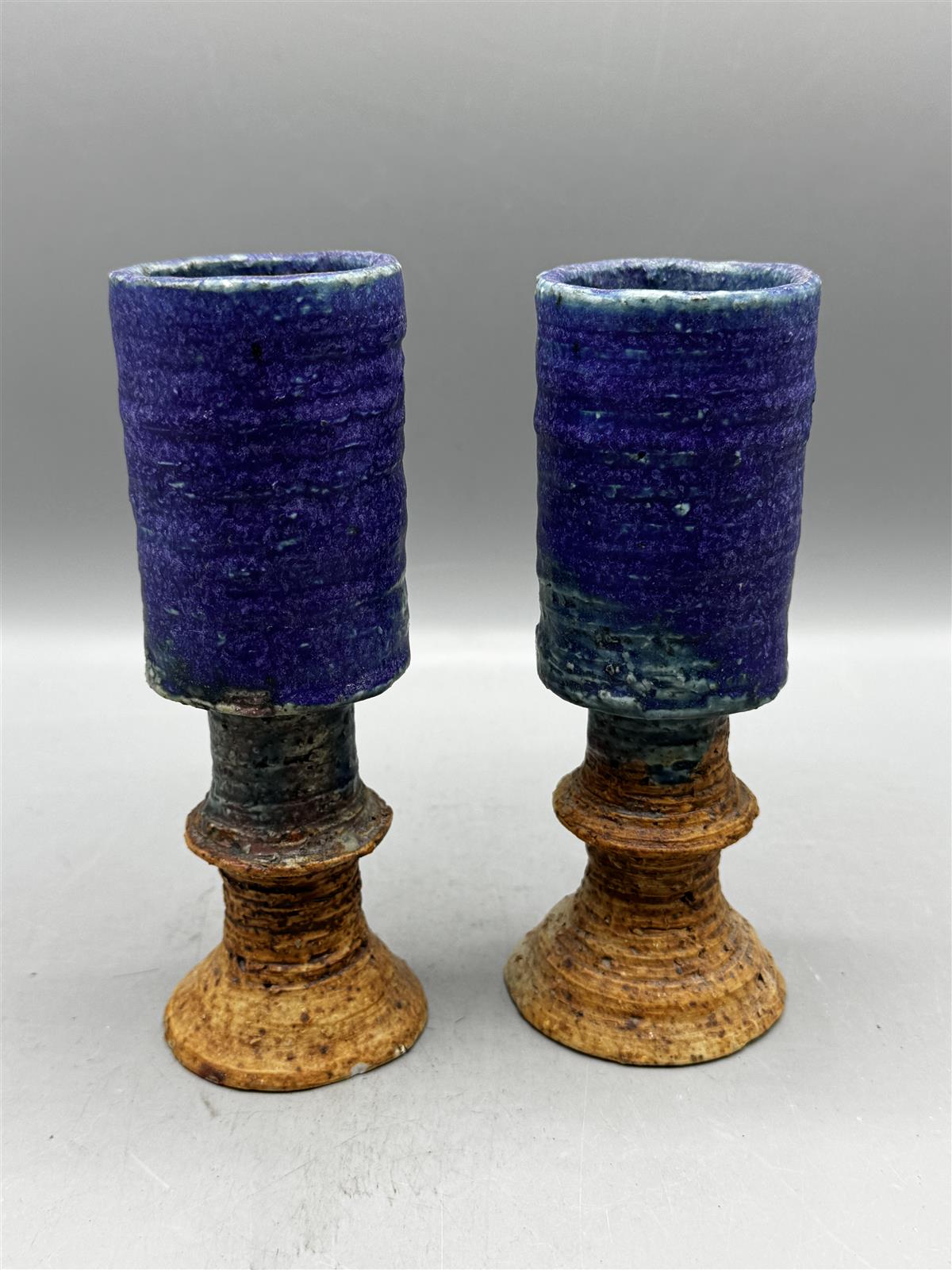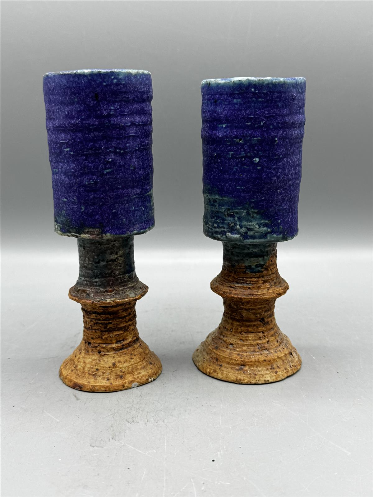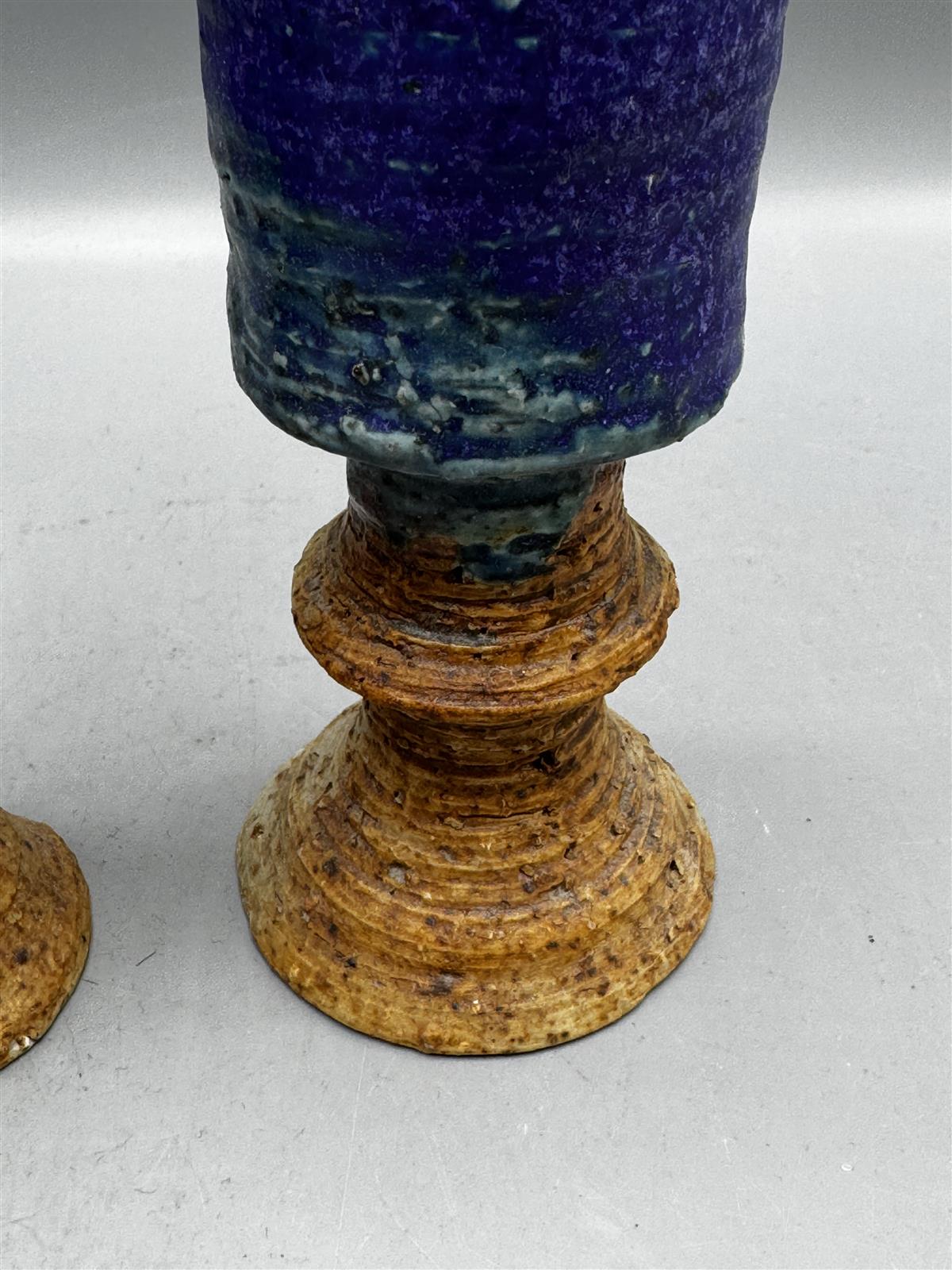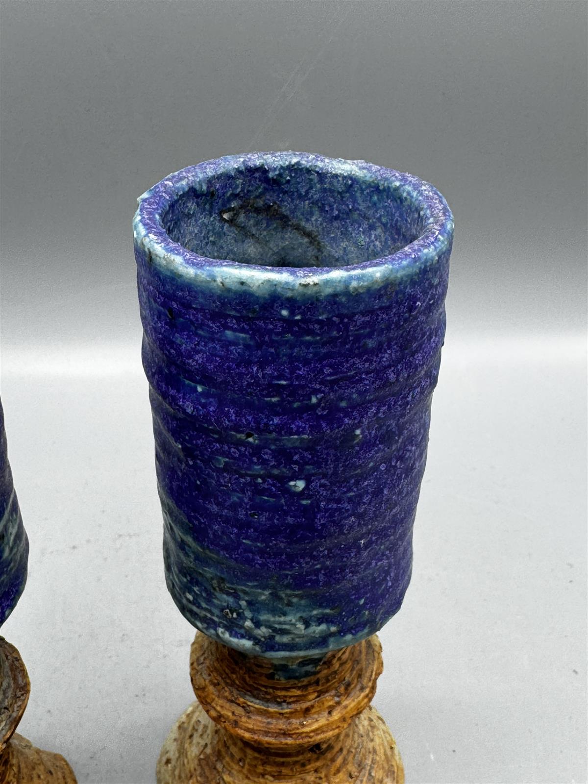 Kaksi kivitavara pikaria tai kynttilänjalkaa, design Annikki Hovisaari Arabian tehtaalla. Kynttilänjaloissa on sininen ja ruskea lasitus, ja ne ovat signeeratut AH Arabia  pohjasta.