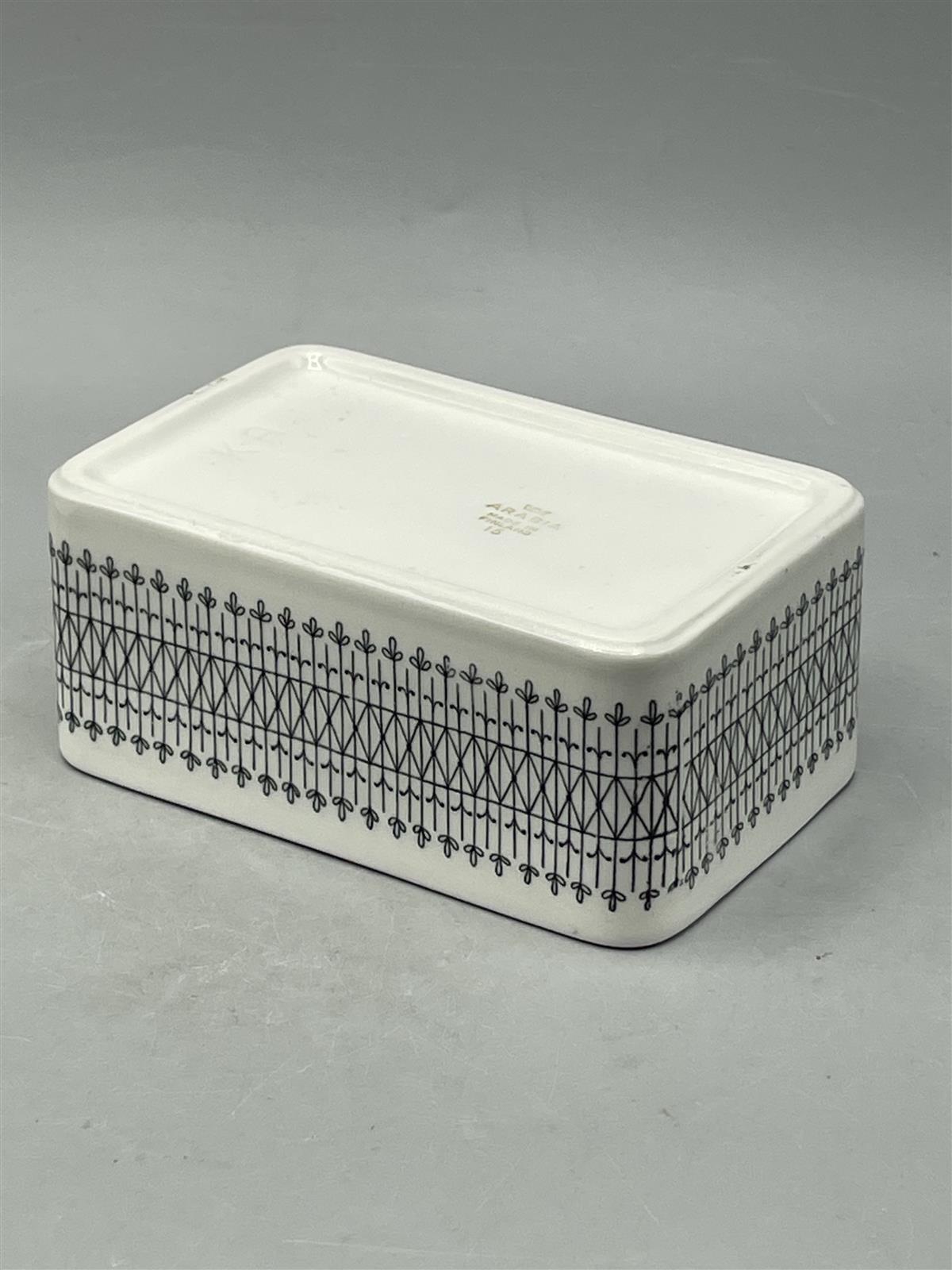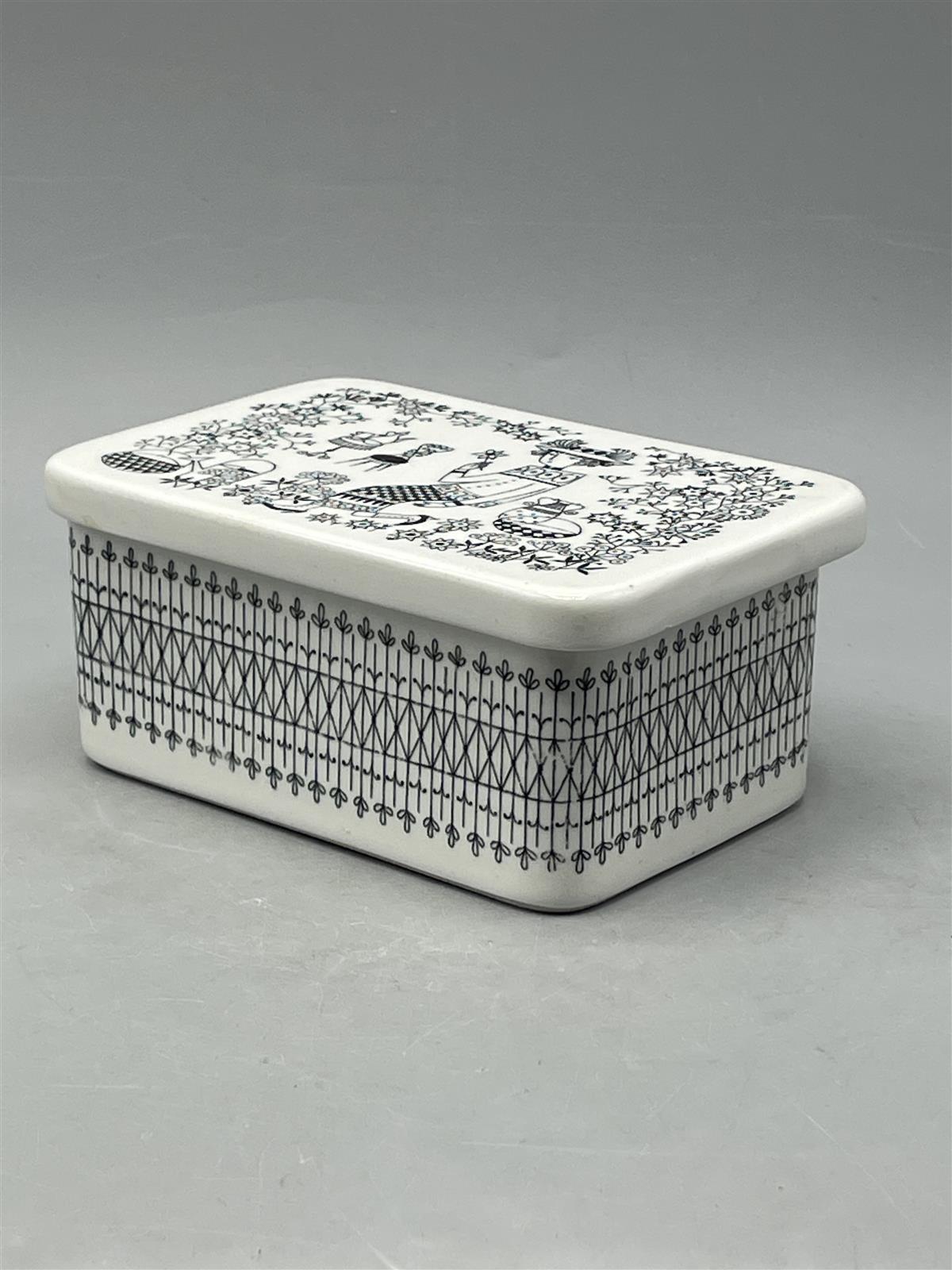 Arabia Emilia voirasia, jossa on mustavalkoinen kuviointi. Kuviointi esittää koristeellisia kasveja ja hahmoja. Rasia on suorakulmainen ja siinä on irrotettava kansi.