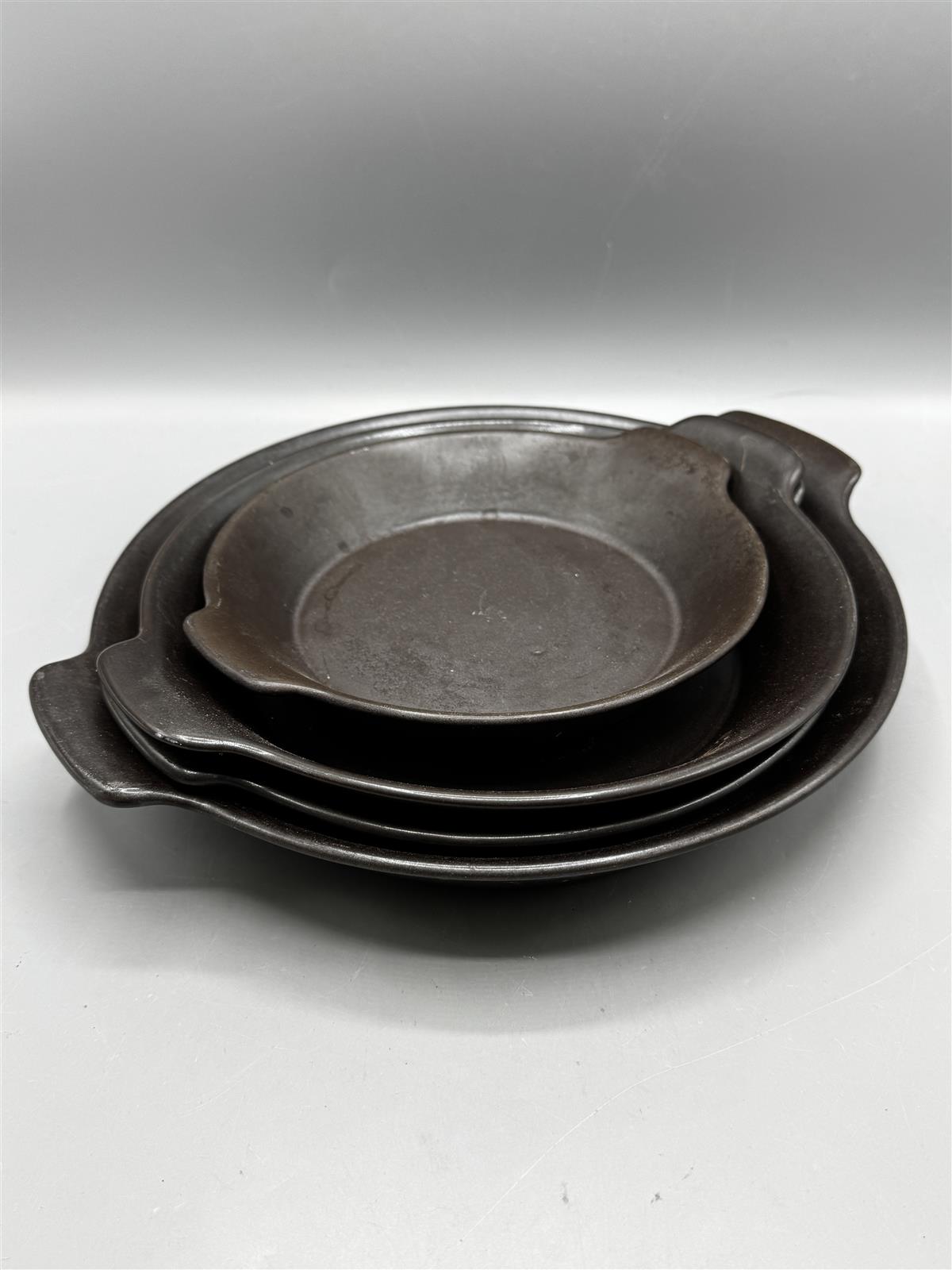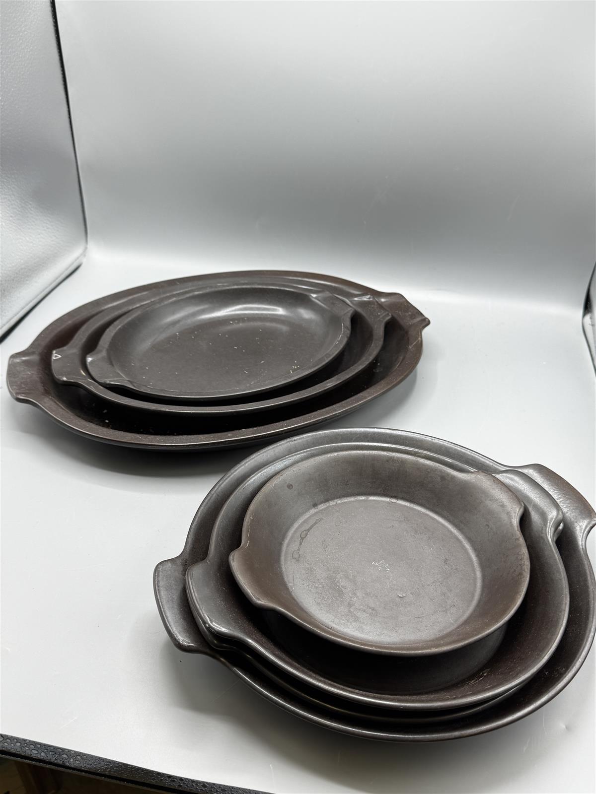 Arabian Liekki sarjan ruskeat uunivuoat, joissa on selkeä ja käytännöllinen muotoilu. Vuoat ovat eri kokoisia ja niissä on kätevät kahvat helpottamaan käsittelyä. Design Ulla Procope. 3kpl ovaali astiaa ja 4kpl pyöreitä.