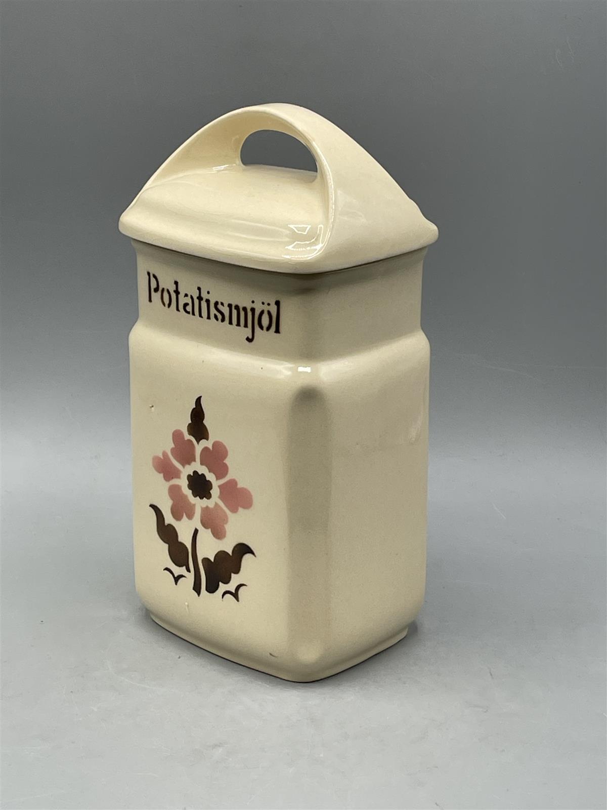Arabia Potatismjöl perunajauhoja maustepurkki, kukkakoriste. Piippuleima.