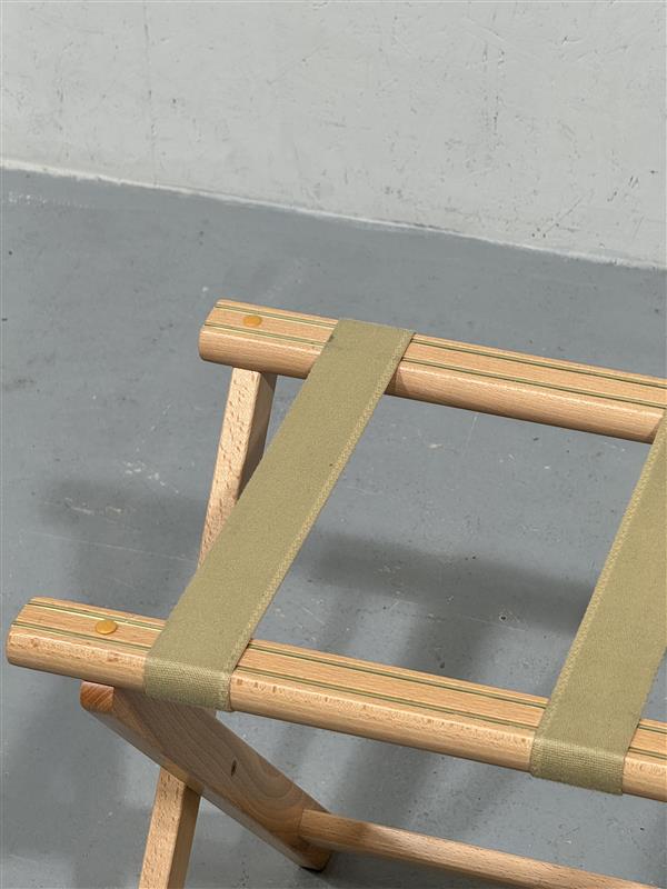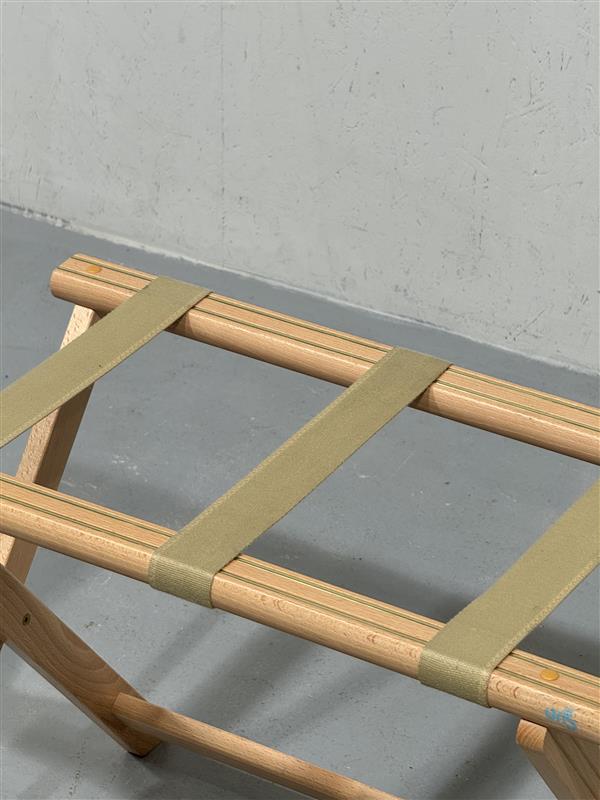 Tyylikäs ja tukeva matkalaukku teline. Puu runko ja keskellä remmit, taitettava ja mahtuu pieneen tilaan säilöön.