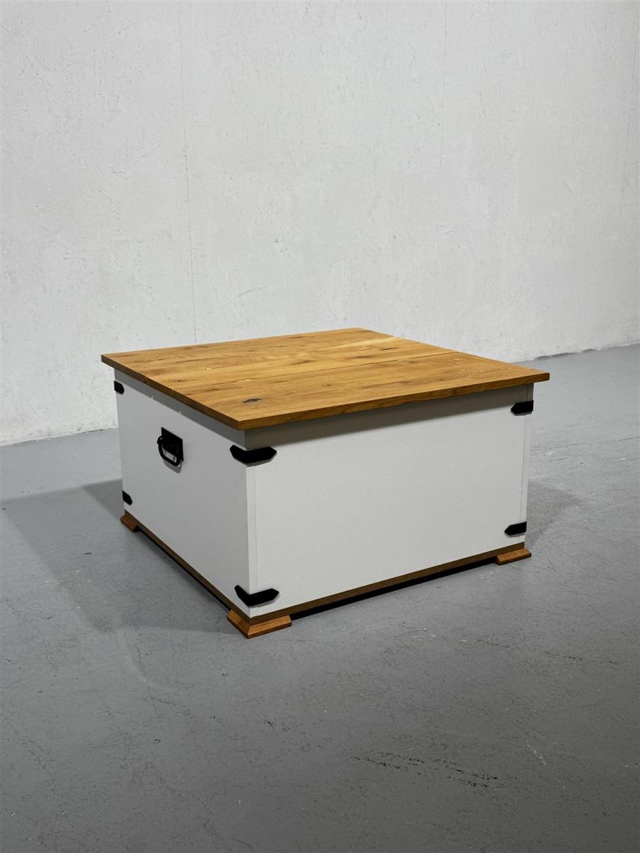 Tyylikäs moderni säilytysarkku sohvapöytä, jossa yhdistyvät puu ja metalli. Arkku on valkoinen, ja siinä on puinen kansi, joka tuo lämpöä ja kontrastia kokonaisuuteen. Metalliset yksityiskohdat kulmissa ja kahvoissa lisäävät kestävyyttä ja toiminnallisuutta.