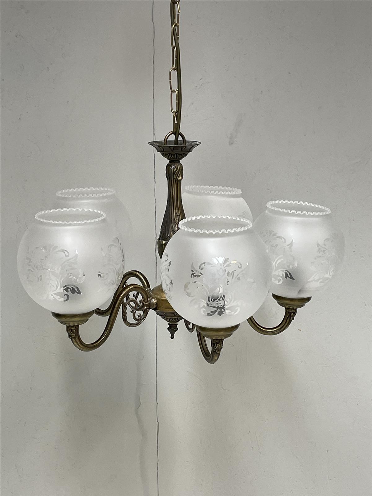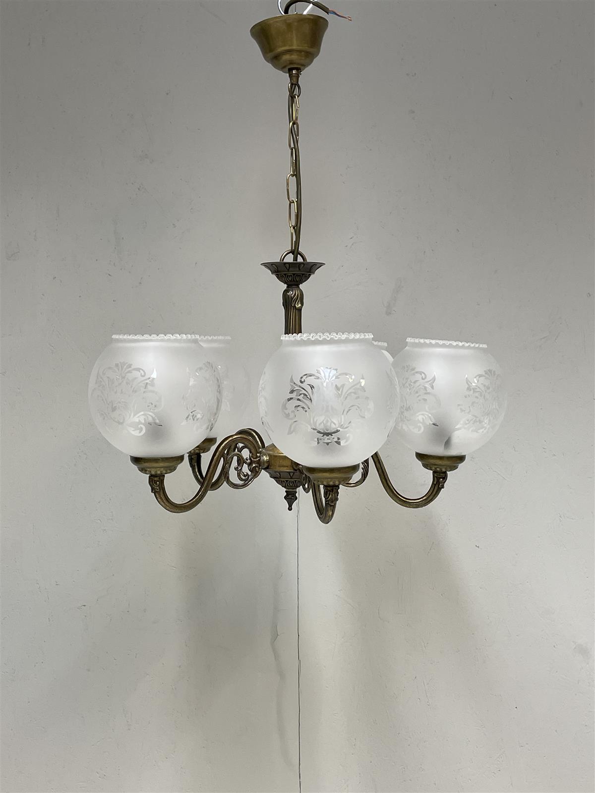 Kattokruunu, jossa on viisi valopistettä lasikuvuilla. ja koristeelliset metalliosat. Valmistaja Armaturhantverk..