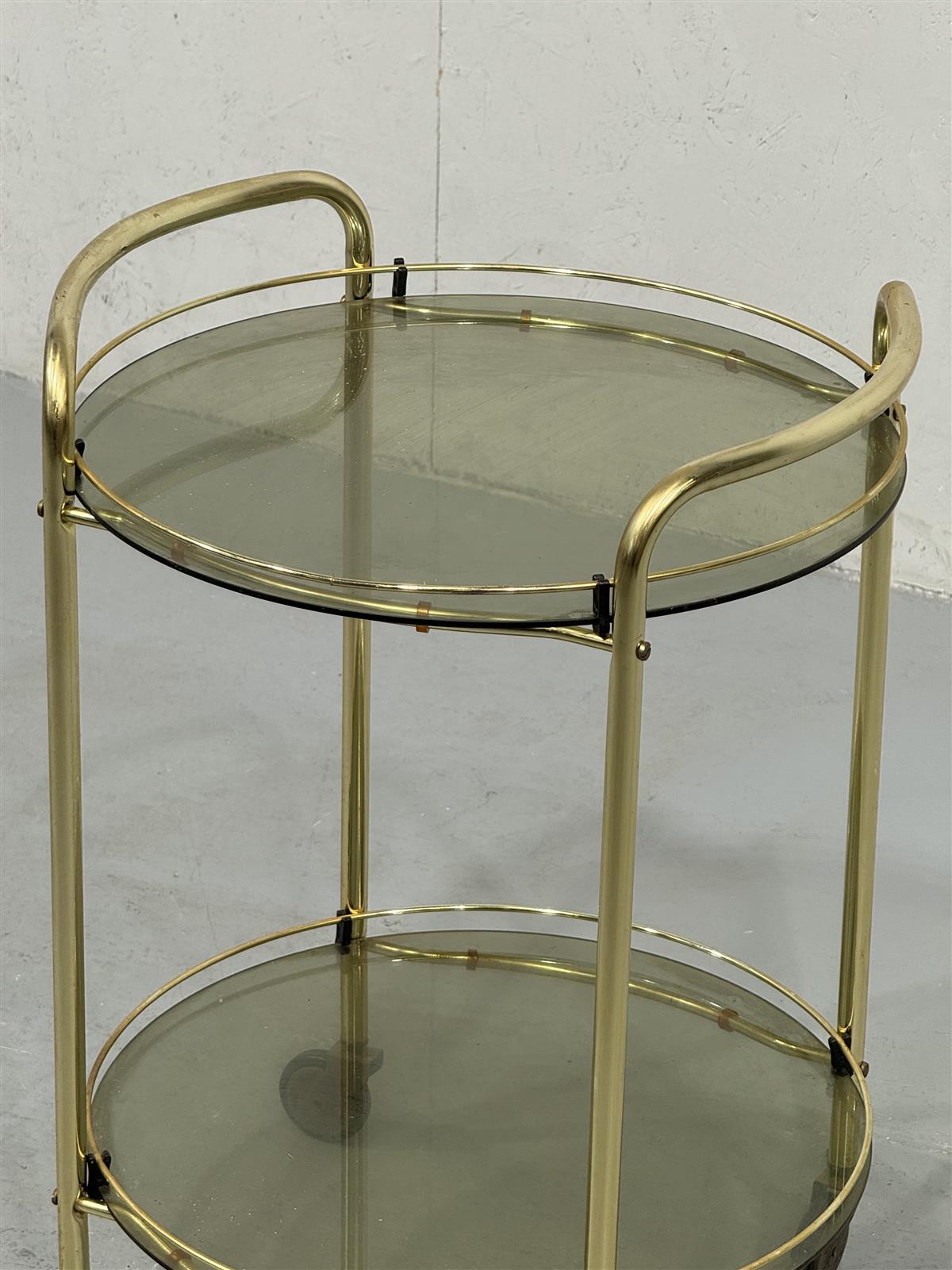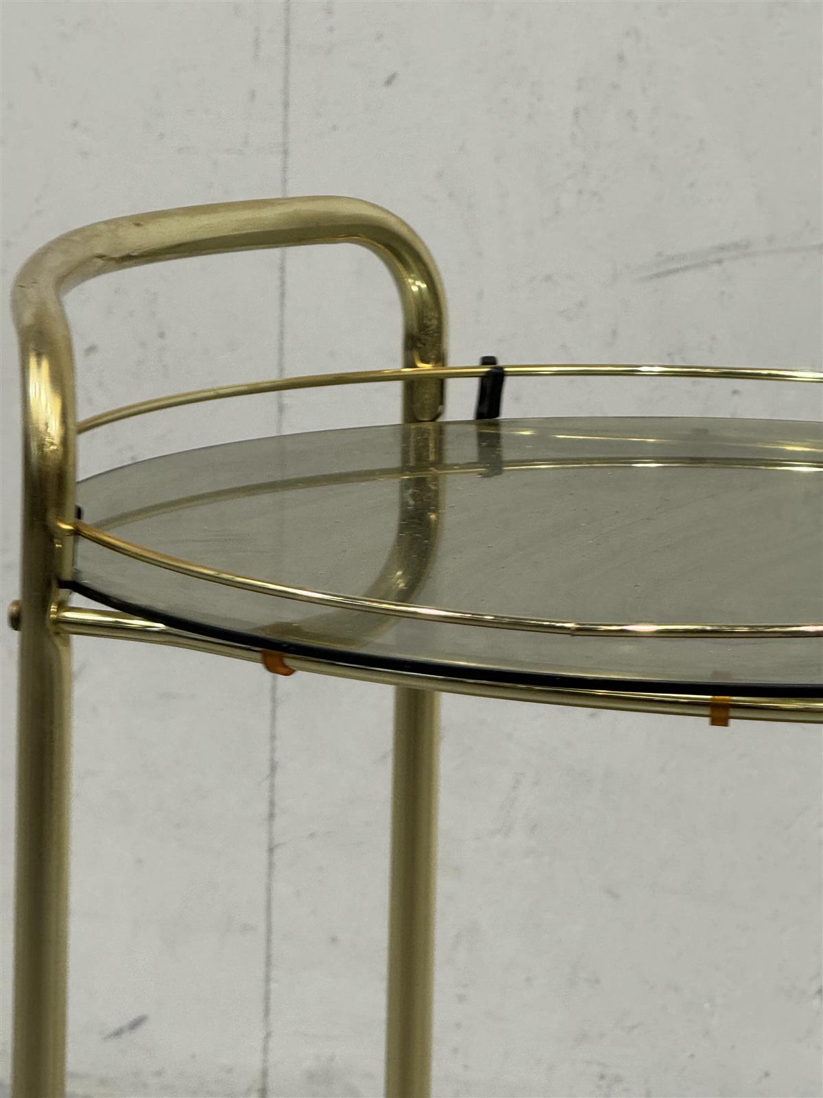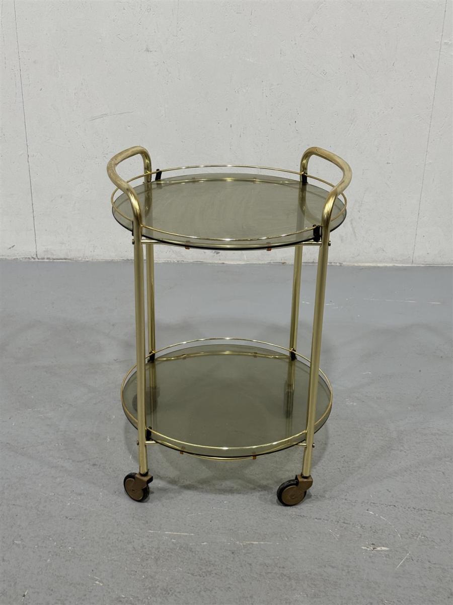 Kaksitasoinen tarjoiluvaunu, jossa messinkinen runko. Pyöreä muotoilu ja kahdet pyörät helpottavat liikuttamista.