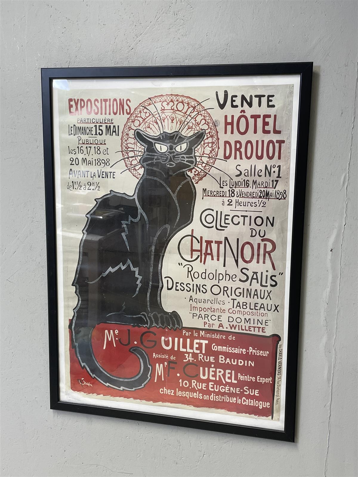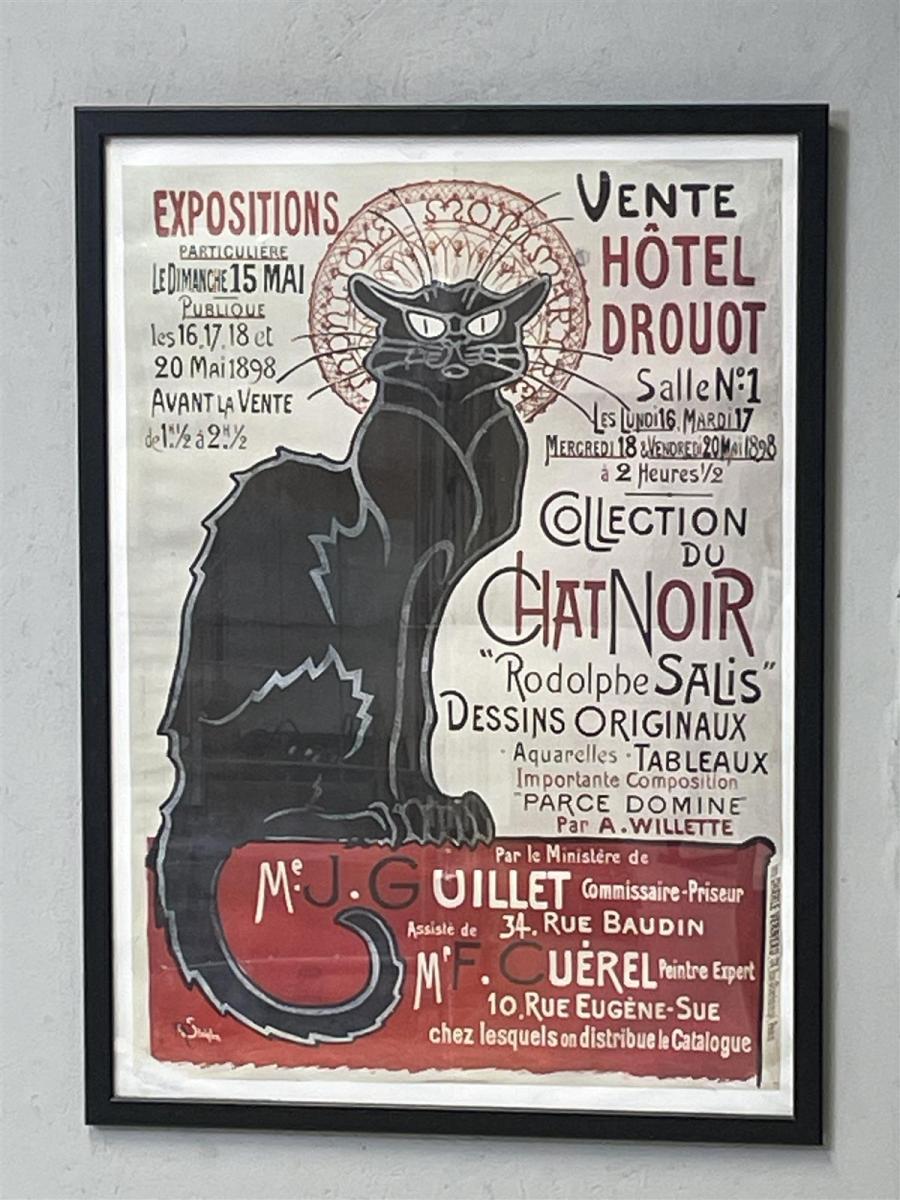 Art Nouveau -tyylinen Chat Noir -juliste, joka on kehystetty mustalla kehyksellä. Julisteessa on ikoninen musta kissa, joka on tunnettu symboli Montmartren kabareesta Pariisissa.
