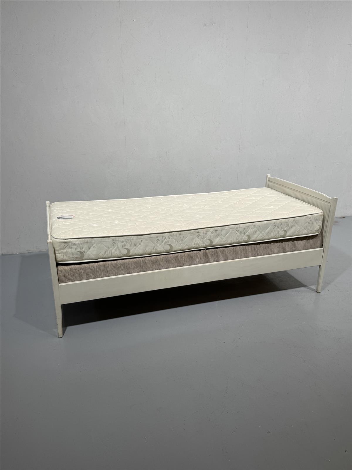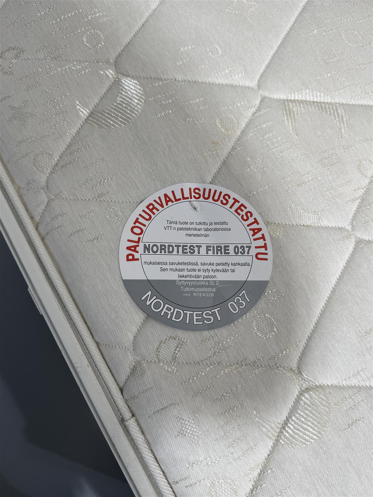 Yksinkertainen valkoinen Askon valmistama sängyn runko, jossa on puinen runko ja päädyt. Mukana tulee Unetar patja 80×200, joka on keskikova ja lisäksi paloturvallinen jousitettu patja 90×200.