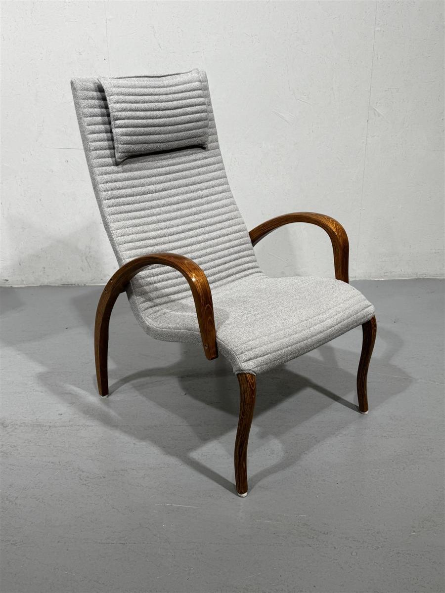 Asko Harlekiini klassikko nojatuoli, jossa on kaarevat puukäsinojat ja harmaa verhoilu. Selkänoja on muotoiltu mukavuutta ajatellen ja tyyli tuo kevyen ilmeen sisustukseen.