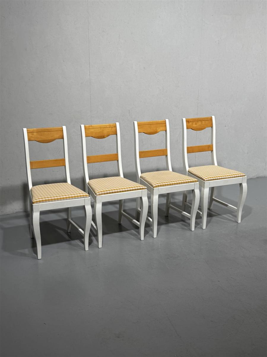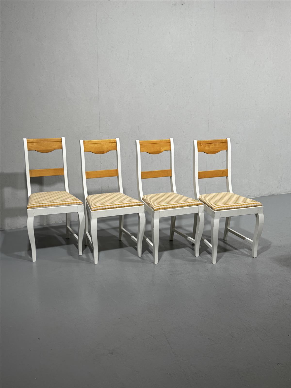 Tyylikkäät Asko-tuolit, joissa on valkoinen runko ja puunväriset selkänojat. Istuinosa on verhoiltu kelta-valkoruudullisella kankaalla, joka tuo mukavaa kontrastia tuolien muotoiluun. Näitä tuoleja on yhteensä neljä kappaletta, ja ne sopivat hyvin ruokapöydän ympärille tai erillisinä istuimina eri tiloihin.