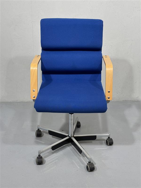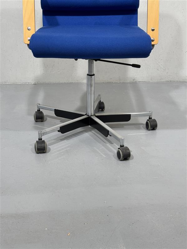 Yrjö Kukkapuro design, Plaano työtuoli siistillä sinisellä kangasverhoilulla. Alla rullat, pumppu toimiva. Puiset kapeat käsinojat hyvässä kunnossa.