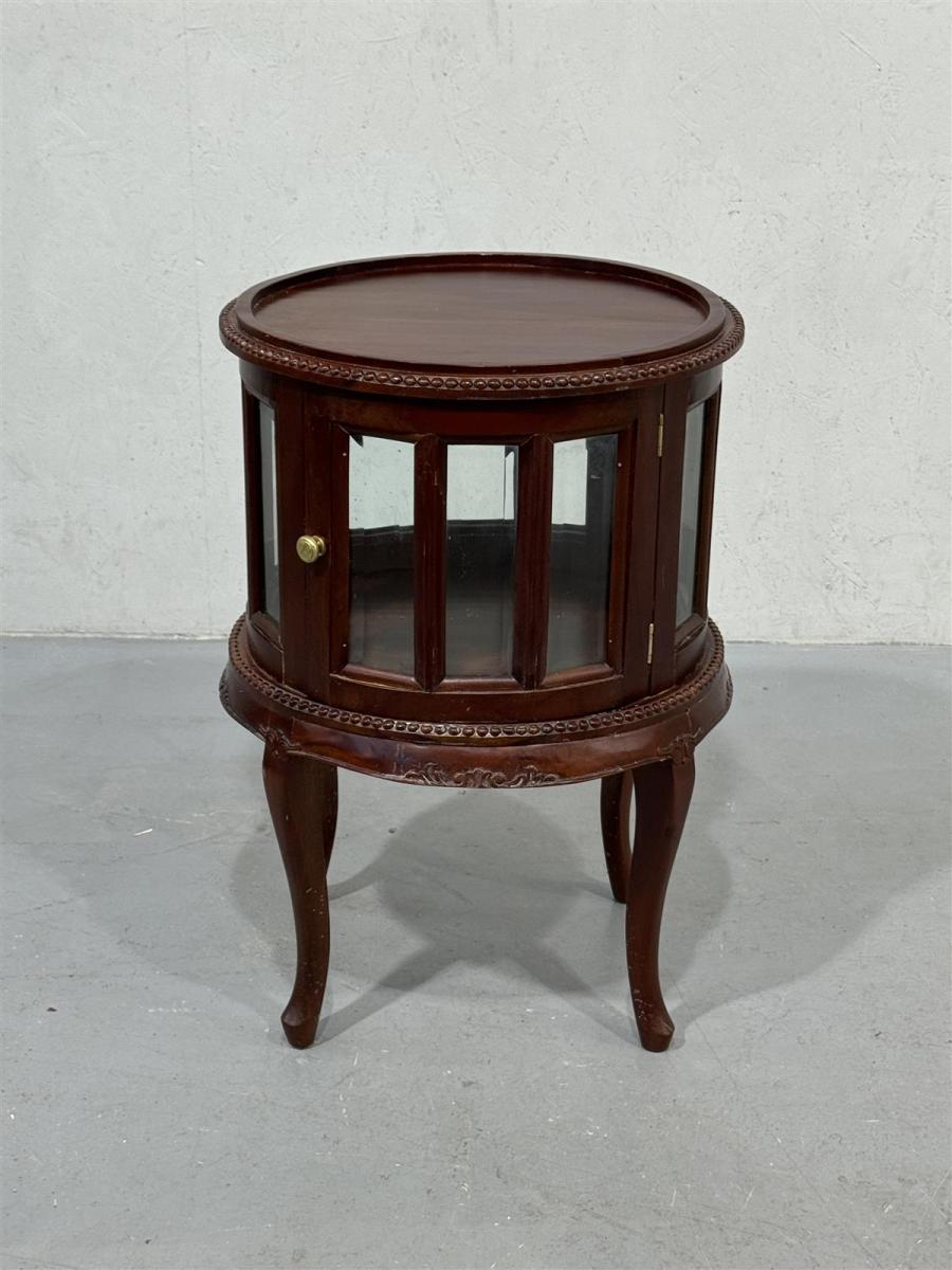 Pyöreä tyylikäs baarikaappi, jossa on lasiovet ja koristeelliset jalat. Pöydän runko on valmistettu tummasta puusta, ja lasipaneelit antavat sille kevyen ilmeen.