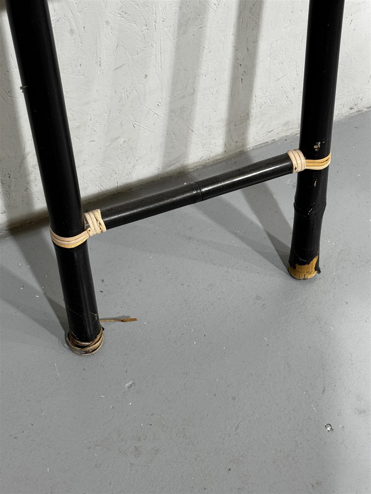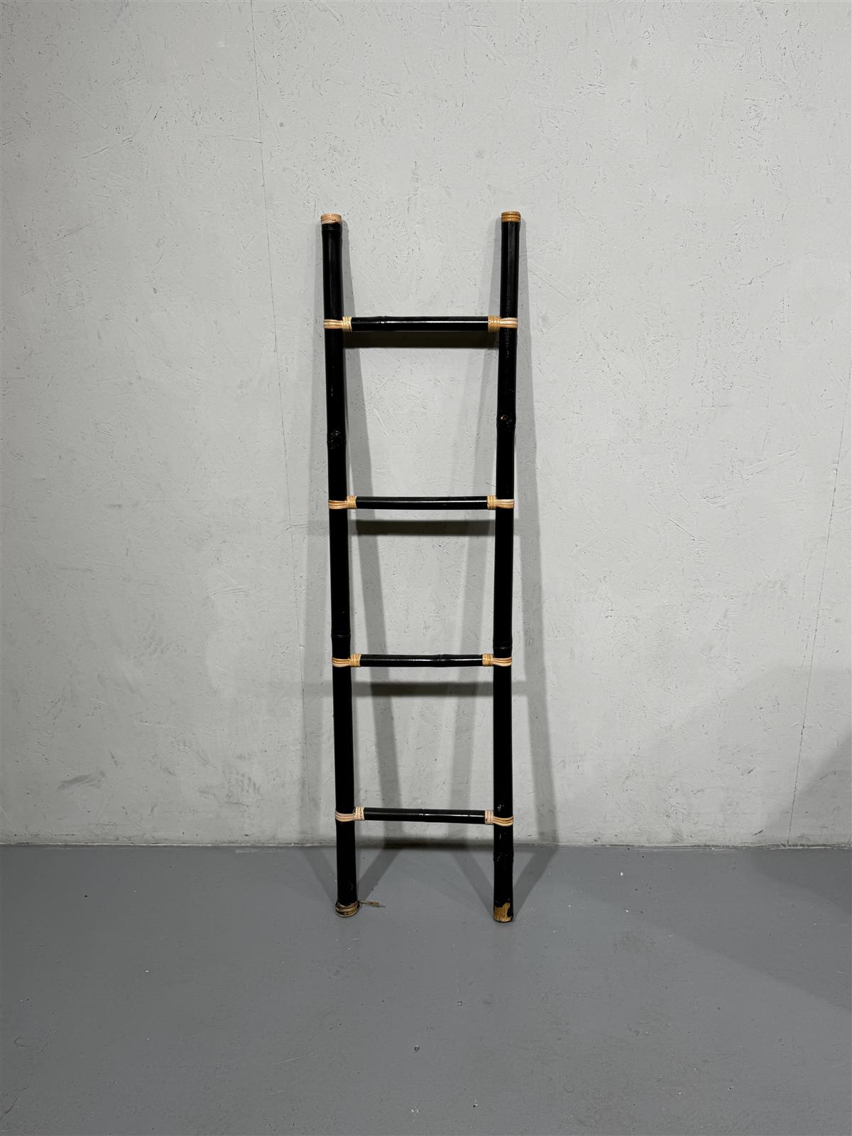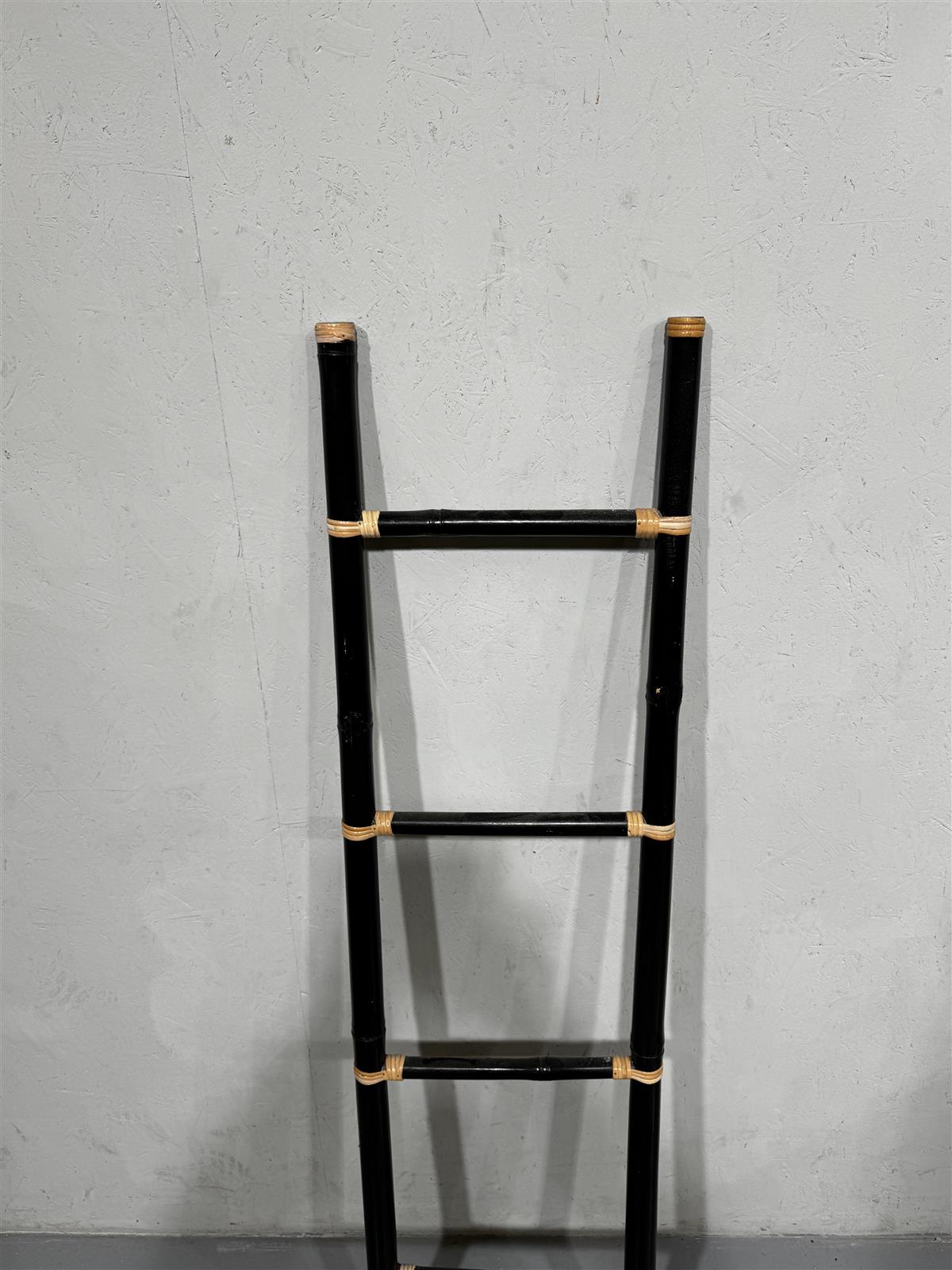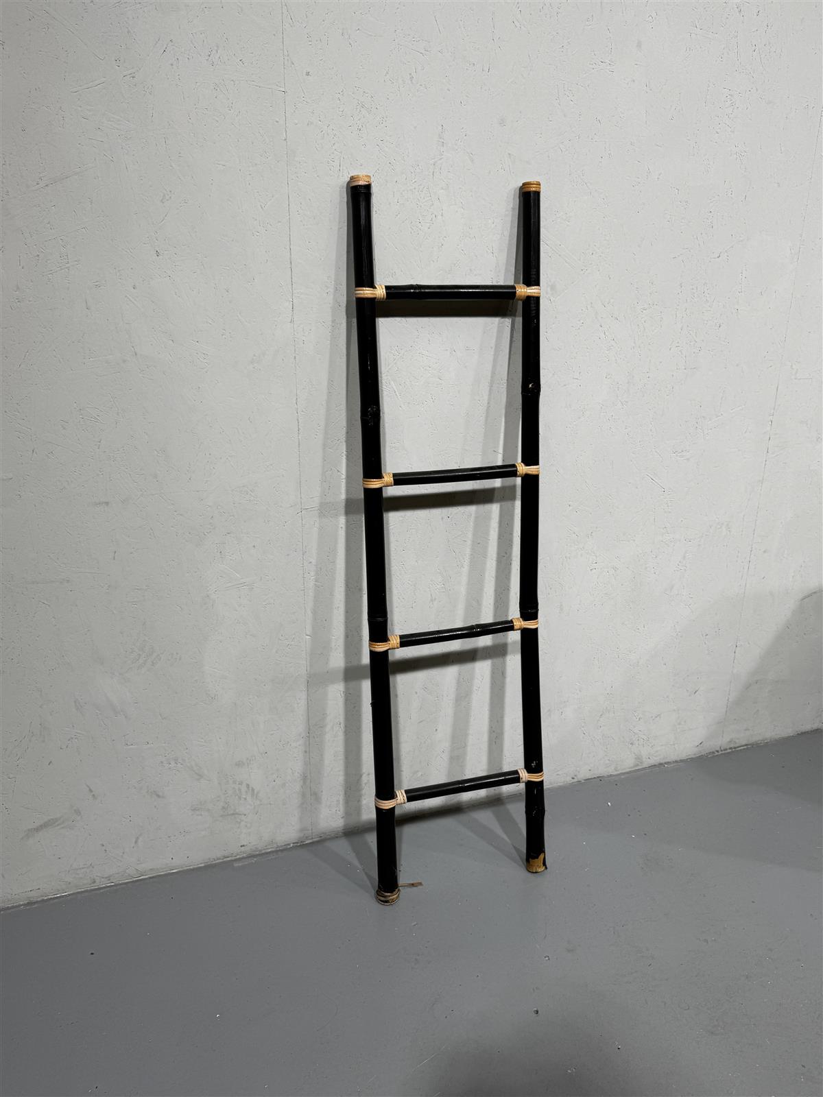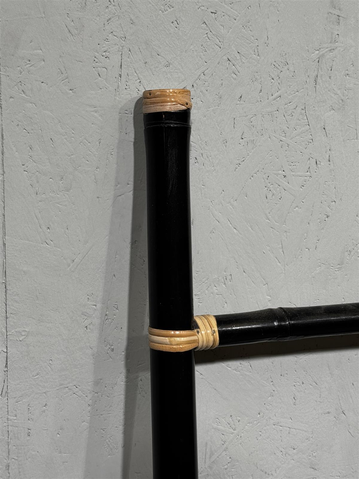Tyylikkäät retrohenkiset bambutikkaat, joissa on musta pintaviimeistely ja rottinkikoristeet. Tikkaat ovat kevyet ja helposti siirrettävät, mikä tekee niistä käytännöllisen lisän sisustukseen tai koristekäyttöön. Hieman pölyä päällä.