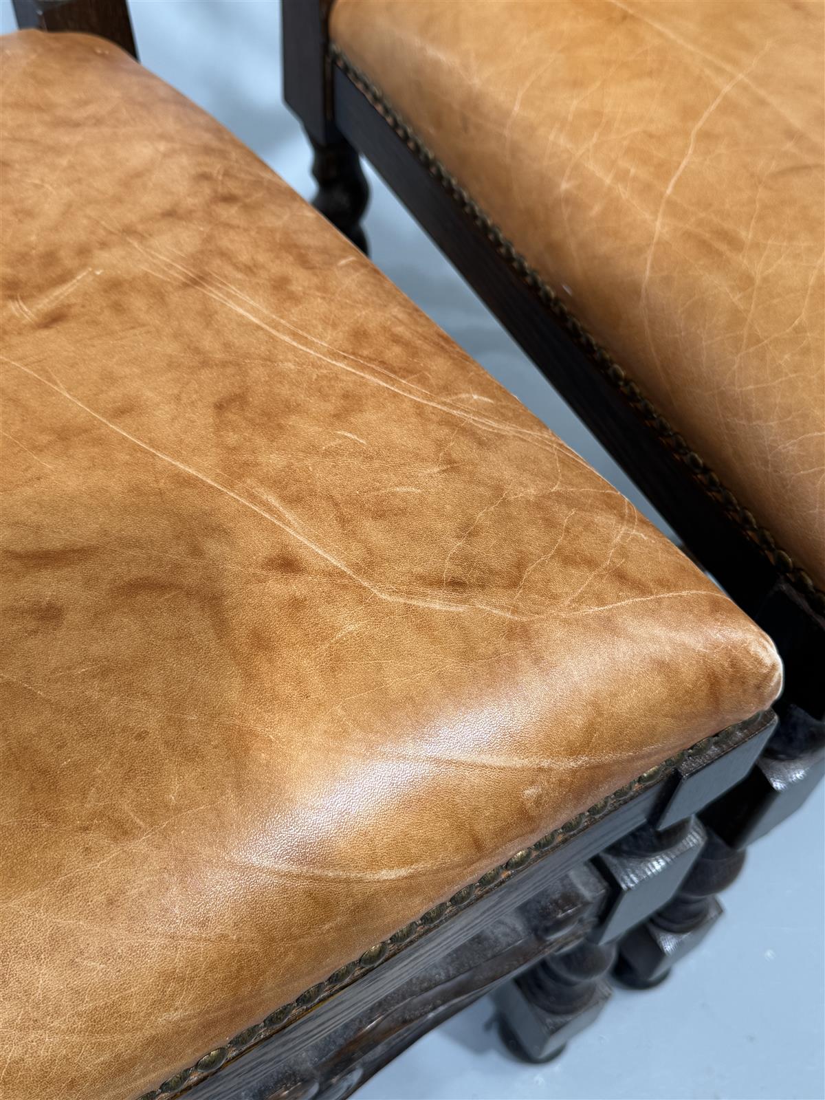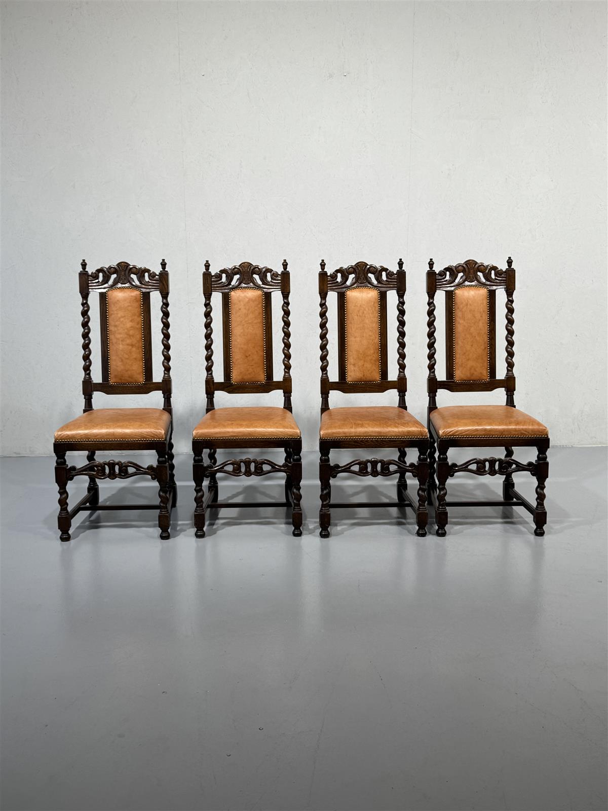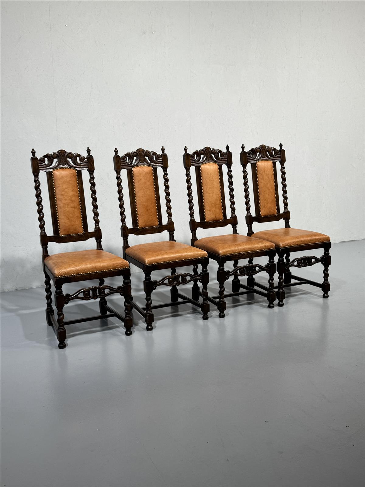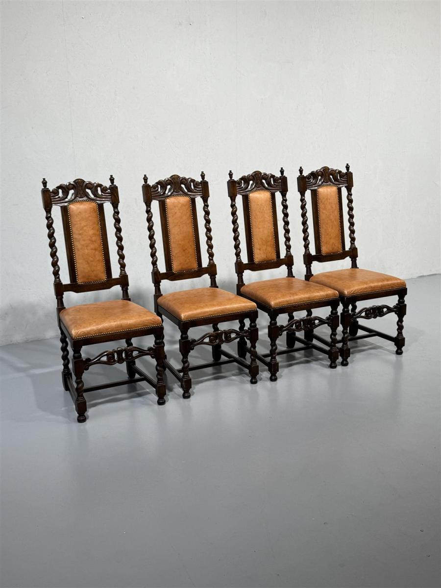 Tyylikkäät barokki ruokatuolit, joissa on koristeelliset kaiverrukset ja kierretyt jalat. Konjakin värinen, patinoitunut nahkaverhoilu tuo tuoleihin arvokkuutta ja mukavuutta. Näitä tuoleja on neljä kappaletta, ja ne sopivat erinomaisesti näyttävään ruokailutilaan. Istuinkorkeus 46cm
