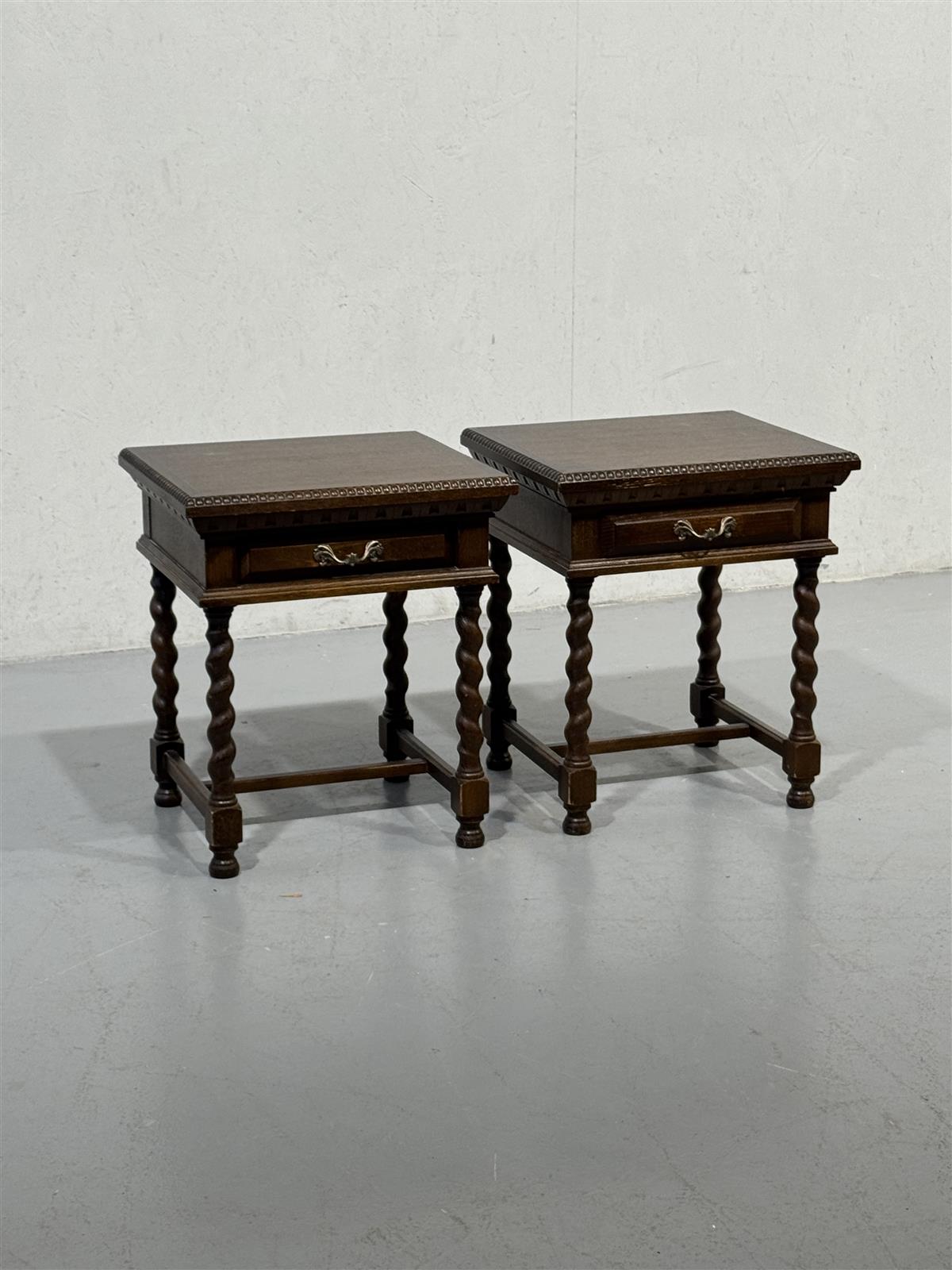 Kaksi barokkityylistä yöpöytää, joissa on koristeelliset jalat ja vetolaatikot. Pöydät ovat ruskeat ja niissä on metalliset vetimet.