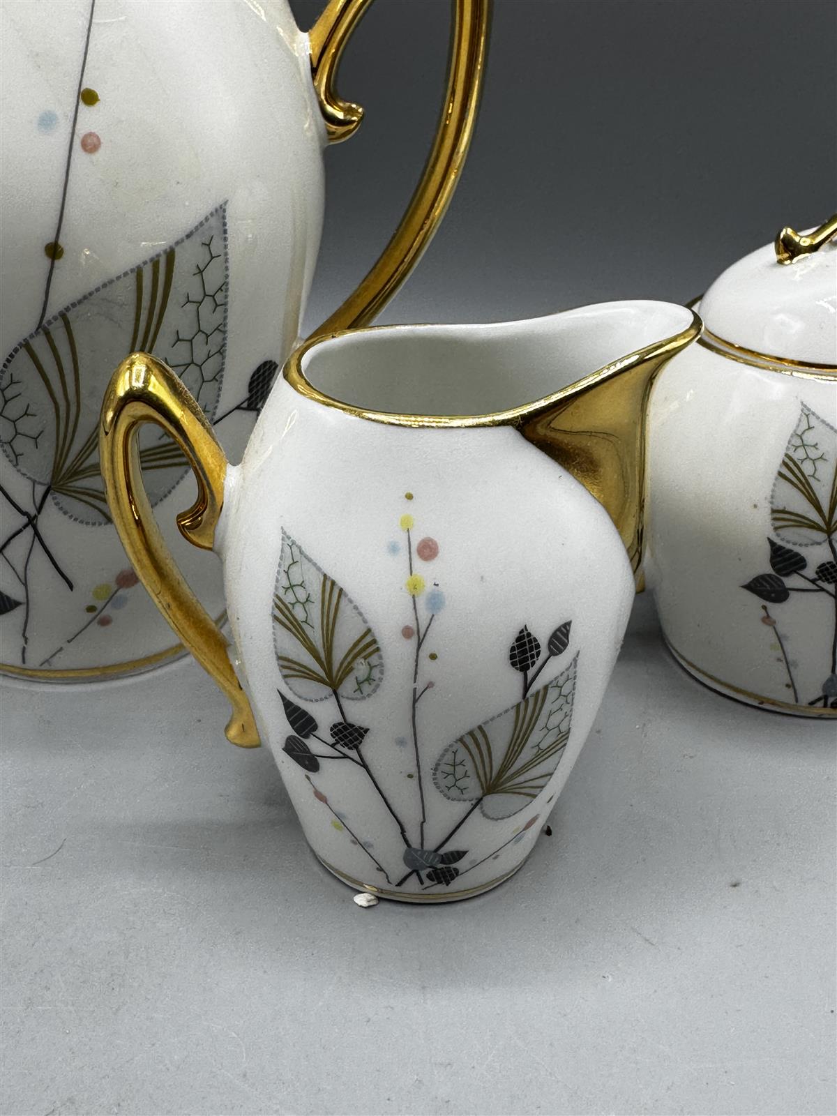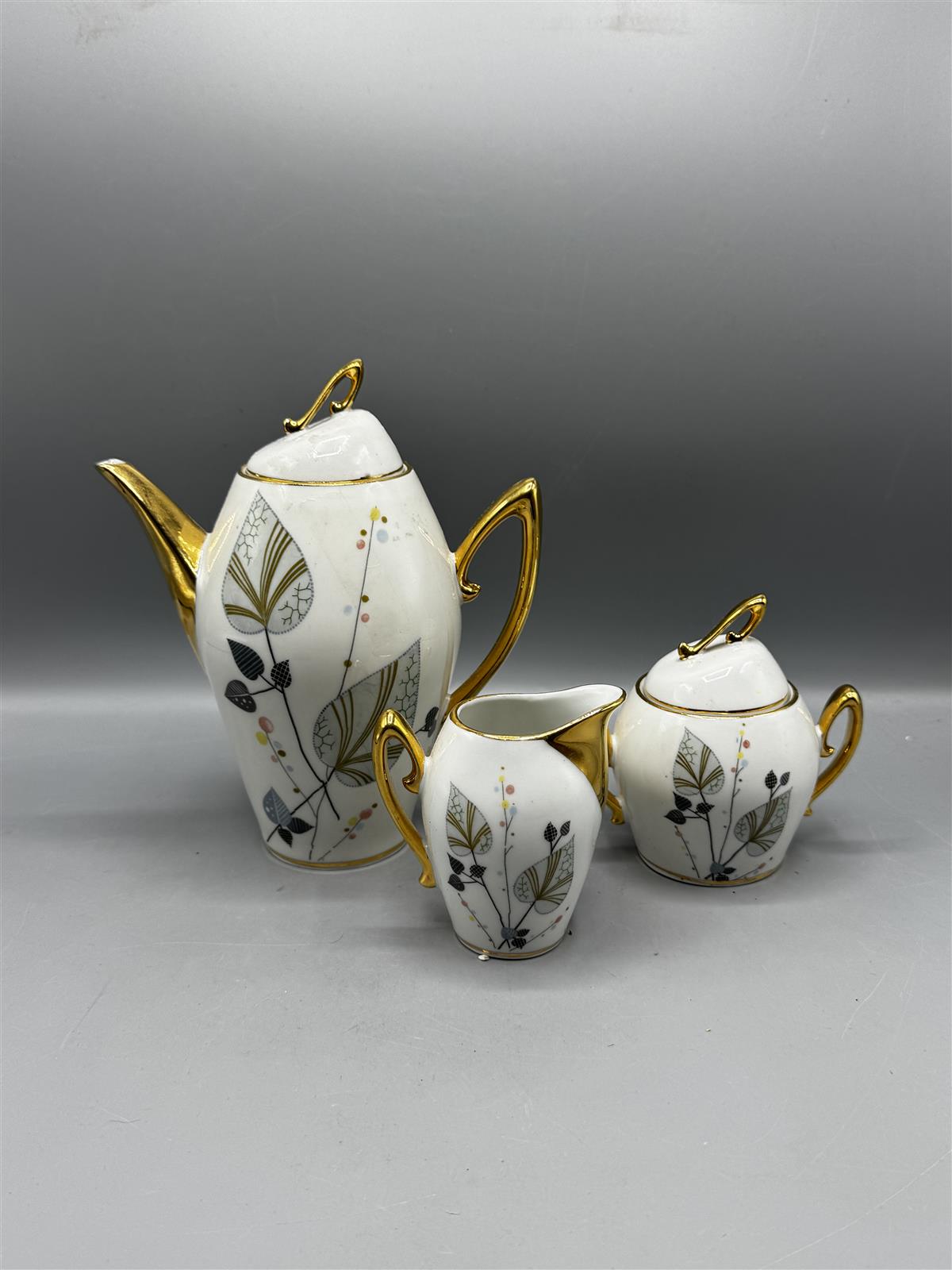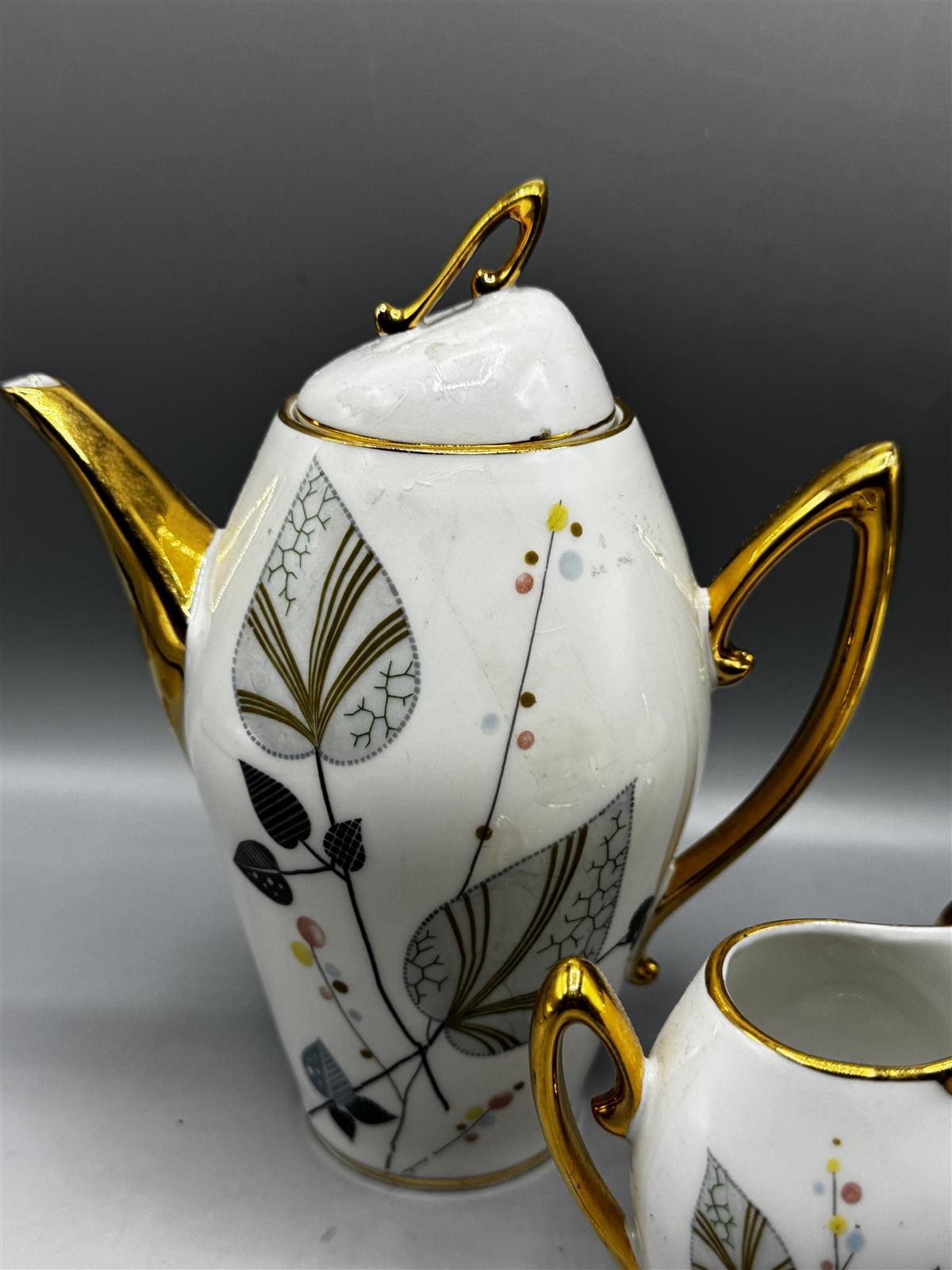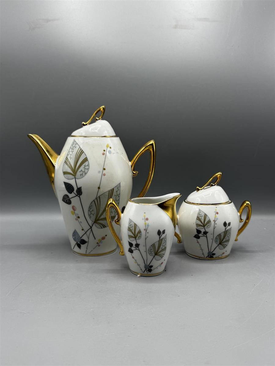 Kolmen osan kahviastiasto, joka sisältää kahvikannun, kermakon ja sokerikon. Astiastossa on kultaiset yksityiskohdat ja lehtikuviointi. Valmistettu Saksassa, Leni Parbus Studio, Bavaria-leimalla varustettuna.