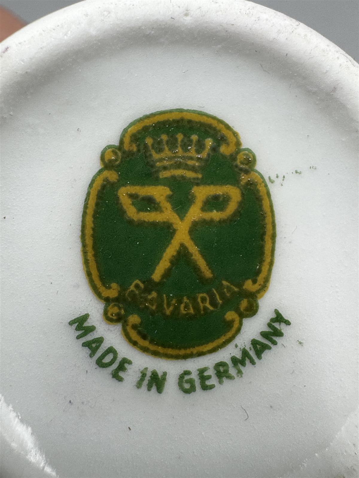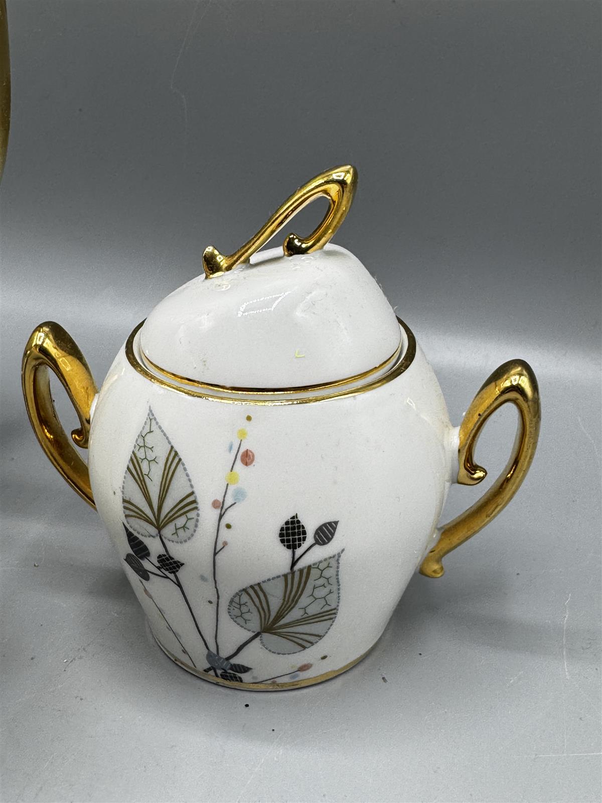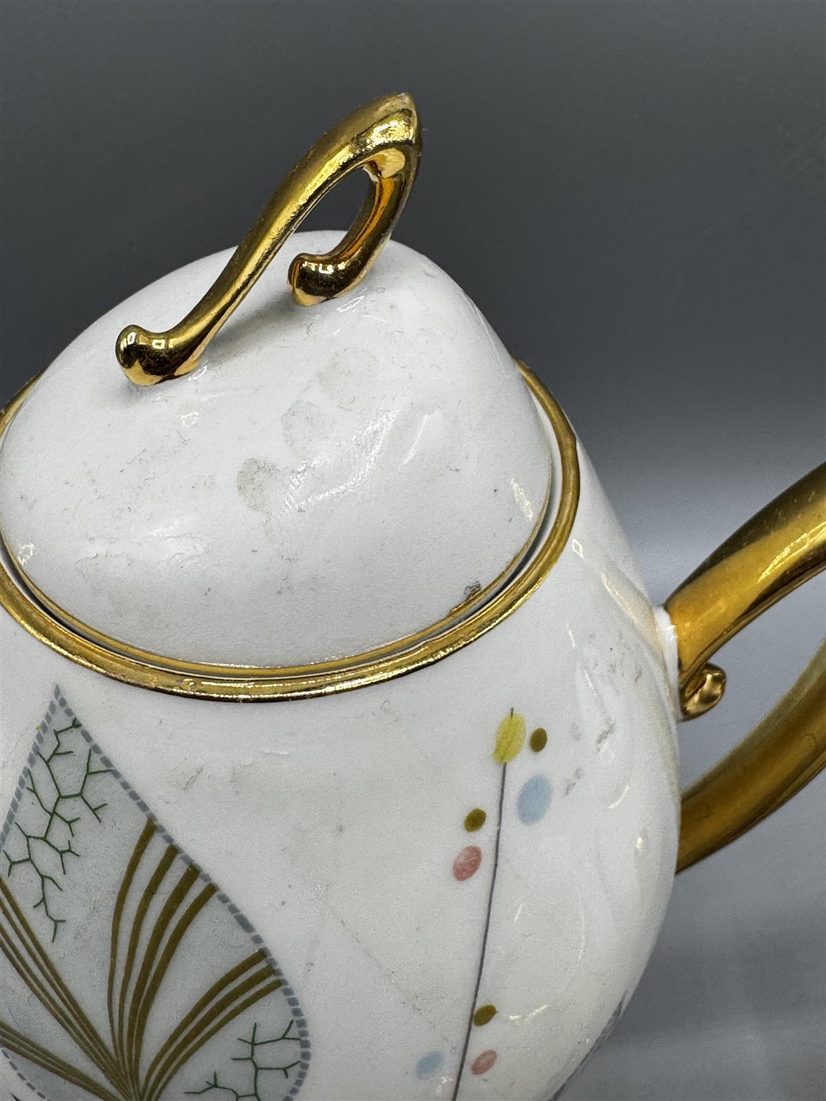 Kolmen osan kahviastiasto, joka sisältää kahvikannun, kermakon ja sokerikon. Astiastossa on kultaiset yksityiskohdat ja lehtikuviointi. Valmistettu Saksassa, Leni Parbus Studio, Bavaria-leimalla varustettuna.
