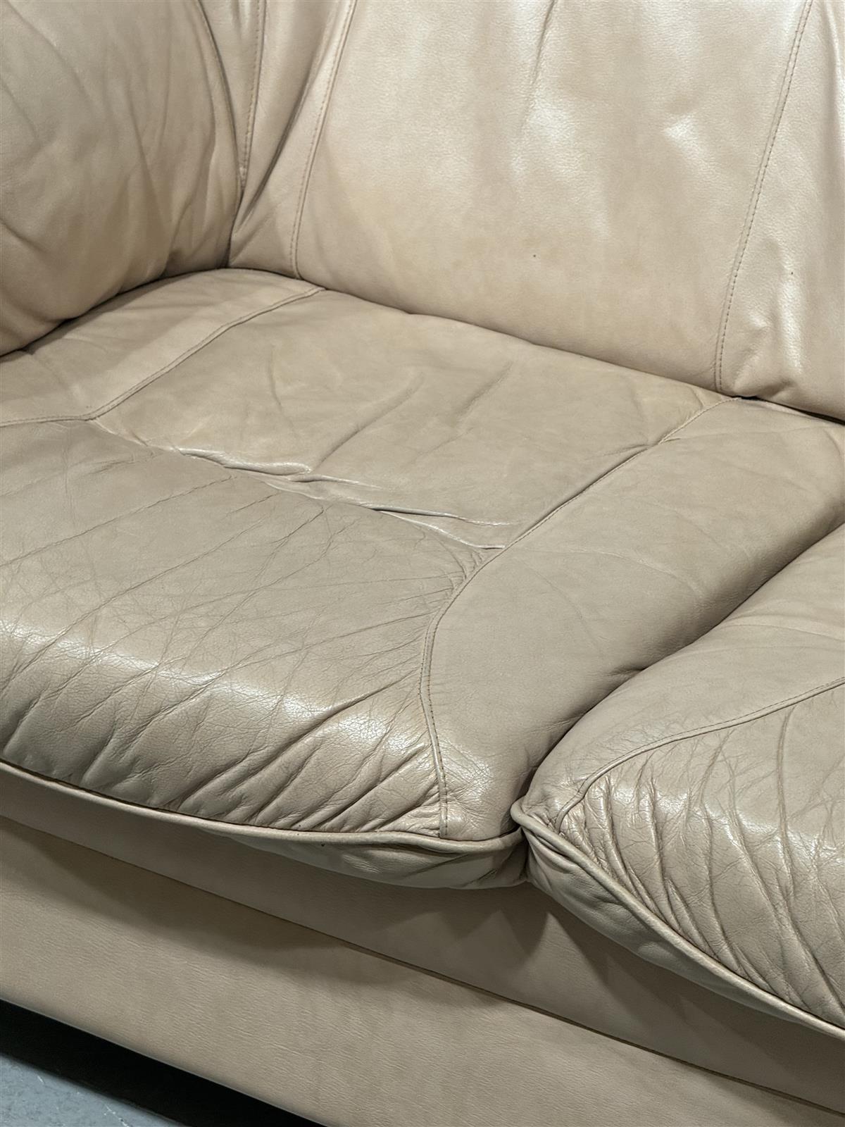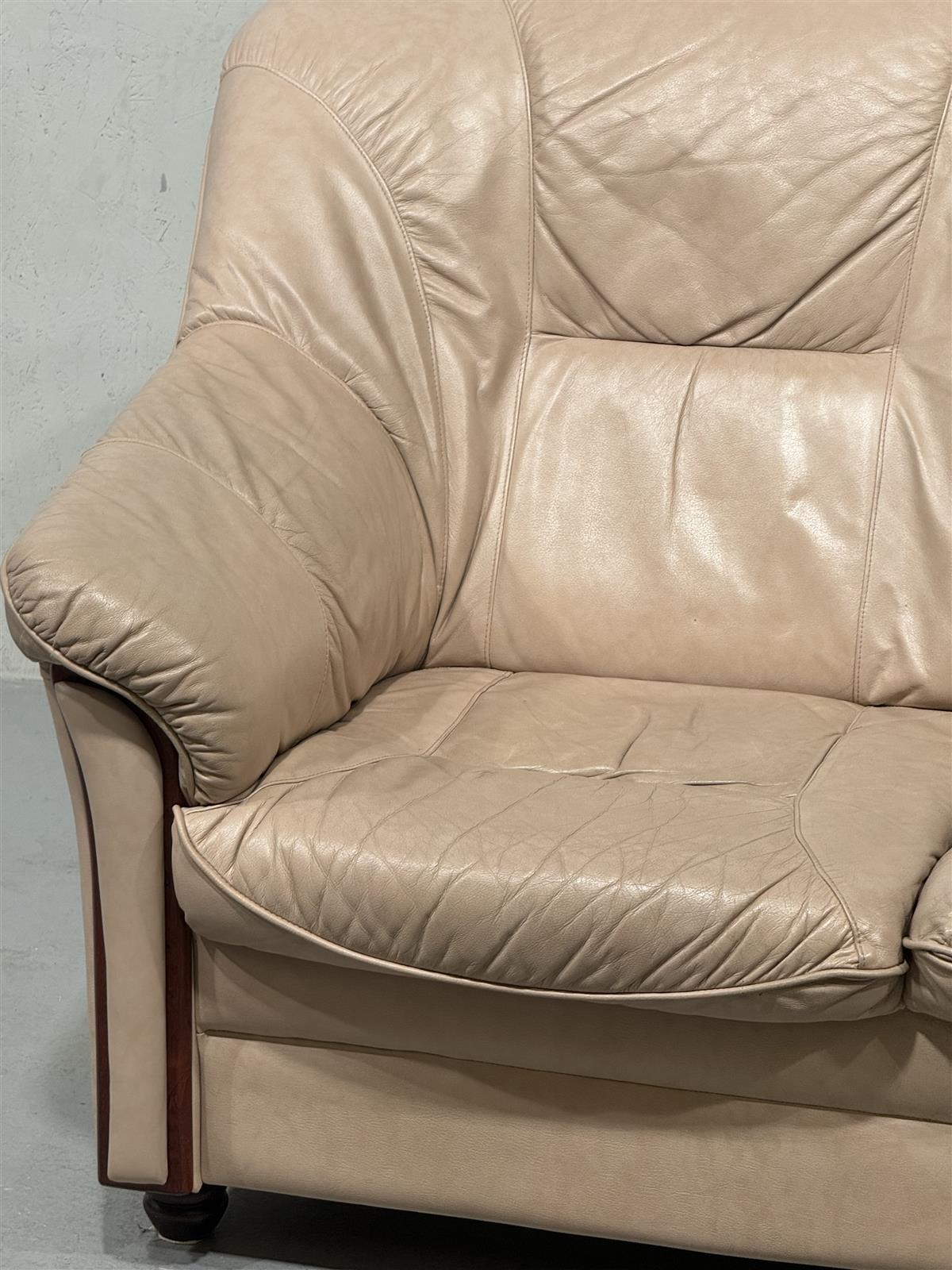 Kaksipaikkainen beige nahkasohva, jossa on pehmeät istuintyynyt ja selkänoja. Sivut on koristeltu tummemmilla yksityiskohdilla.