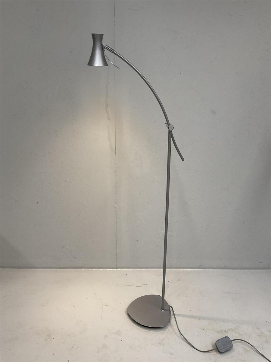 Belid 3-1773 moderni lattiavalaisin/lukulamppu, jossa on kaareva säädettävä varsi ja metallinen säädettävä varjostin. Valaisin on valmistettu metallista ja siinä on himmeä hopeanvärinen pinta.