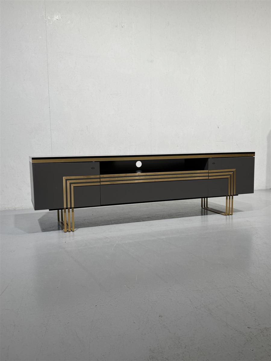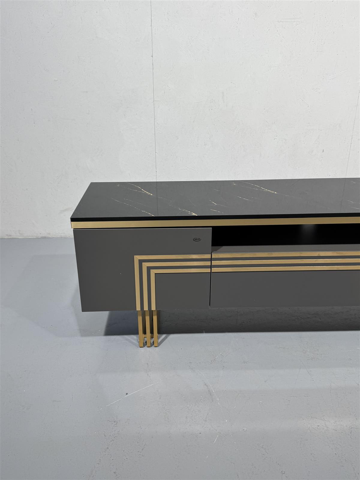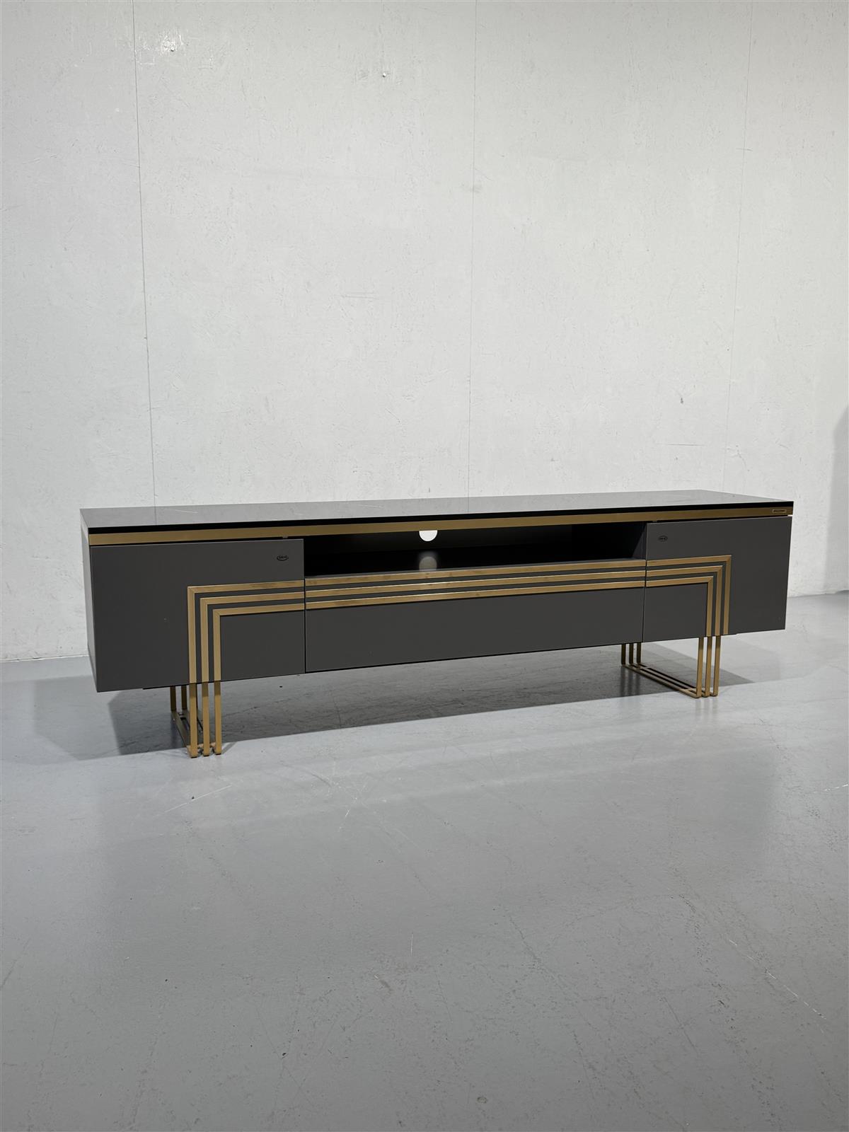 Tyylikäs Bellona Carlino malliston TV-taso, jossa on kultaiset yksityiskohdat ja avoin hylly keskellä. Tason päällä on musta marmorijäljitelmä pinta, jossa on kultaisia juovia.