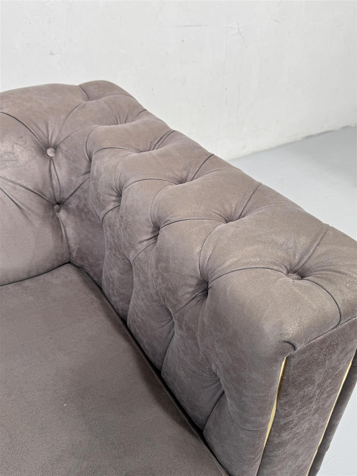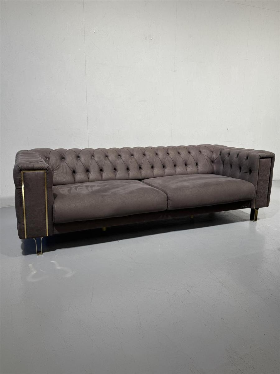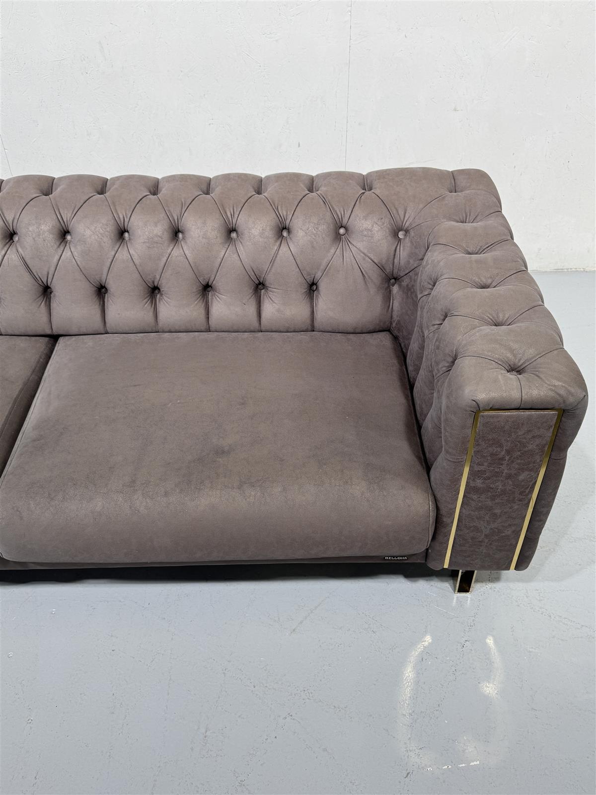 Tyylikäs Bellona Montego malliston harmaa kolmen isuttava sohva, jossa on napitettu selkänoja ja käsinojat. Sohvassa on metalliset jalat ja koristeelliset kultaiset yksityiskohdat.