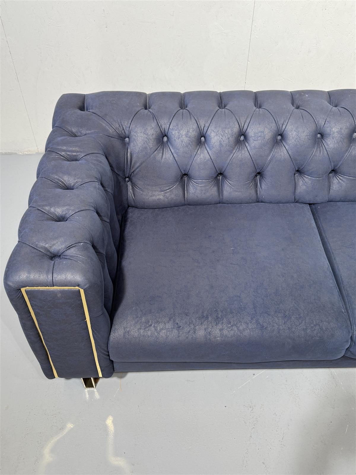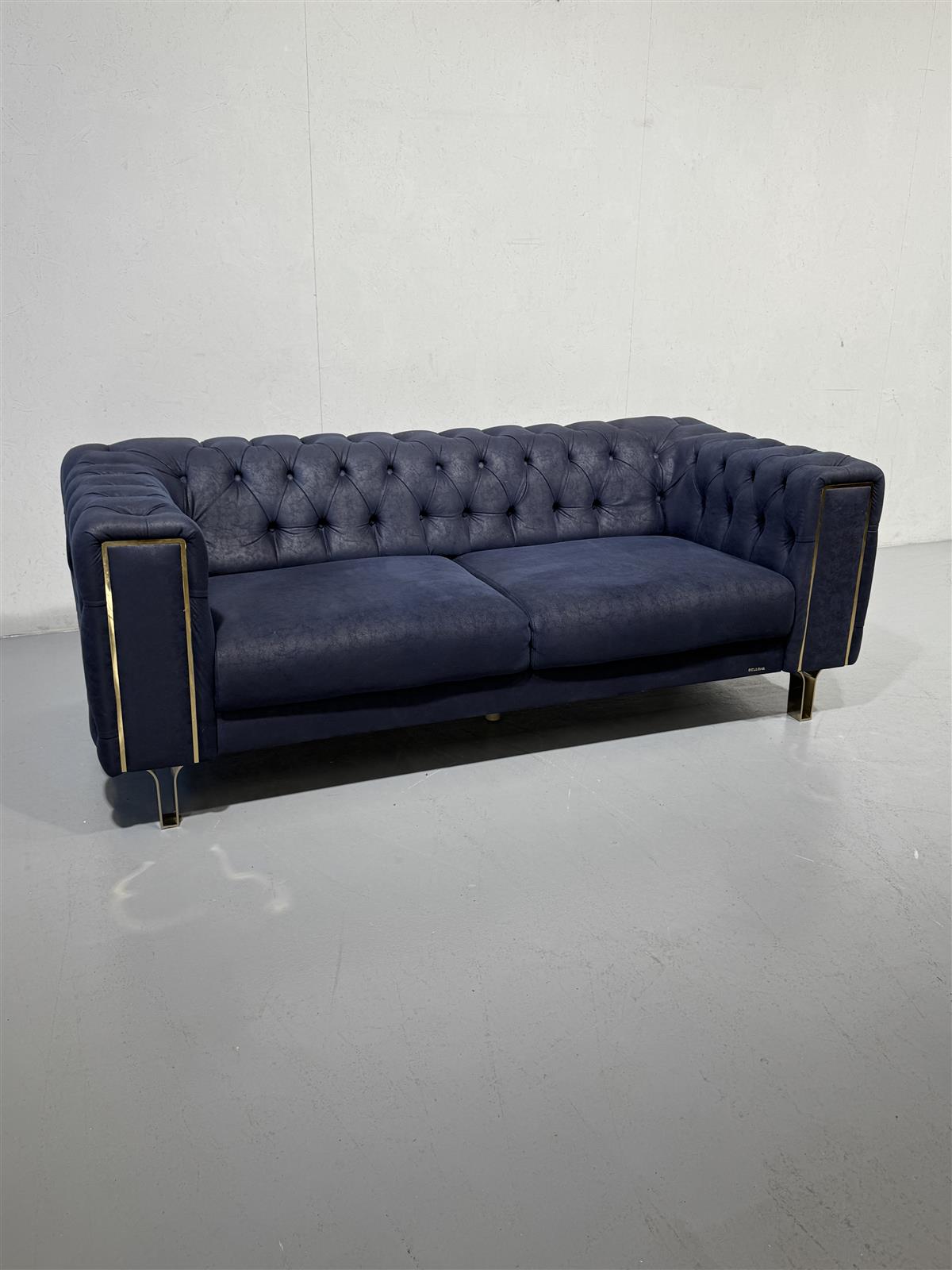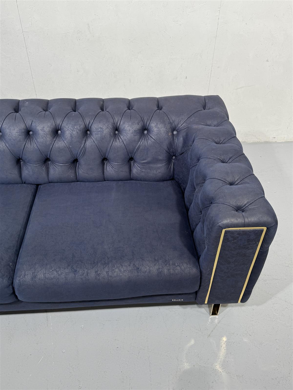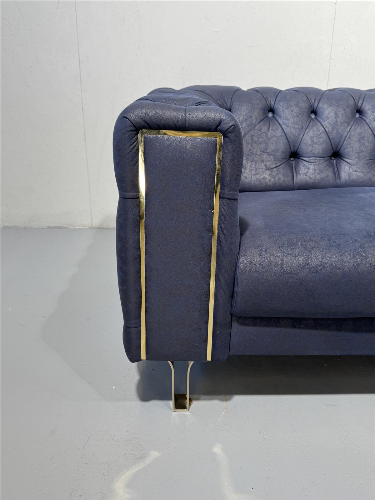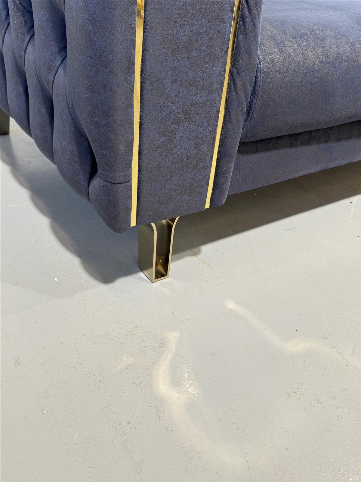 Sininen Bellona Montego sohva, jossa on kultaiset yksityiskohdat ja napitettu selkänoja. Sohvassa on kultaiset metallijalat.