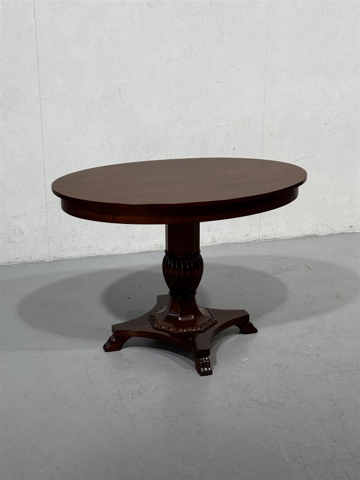 Ovaalin muotoinen, eriomaisessa kunnossa oleva Biedermaier pöytä, jossa on koristeellinen jalka.