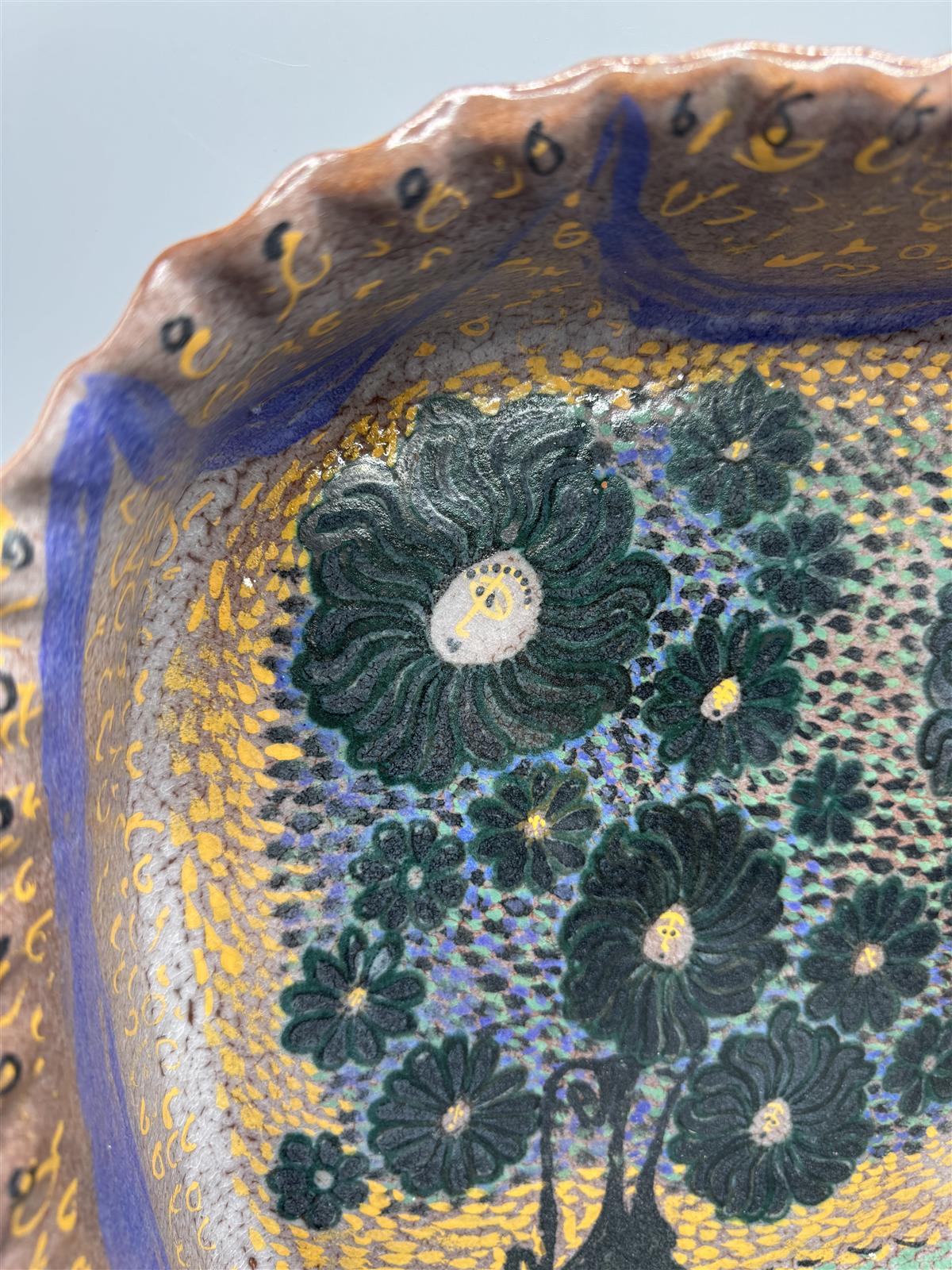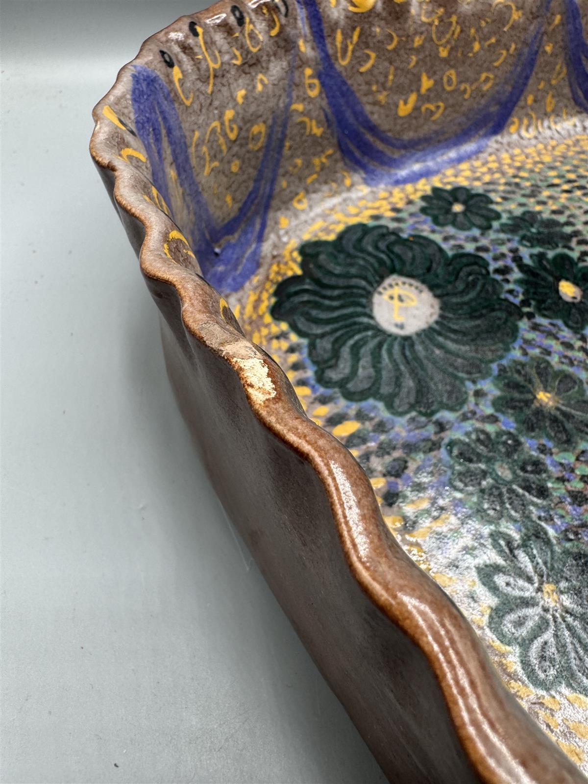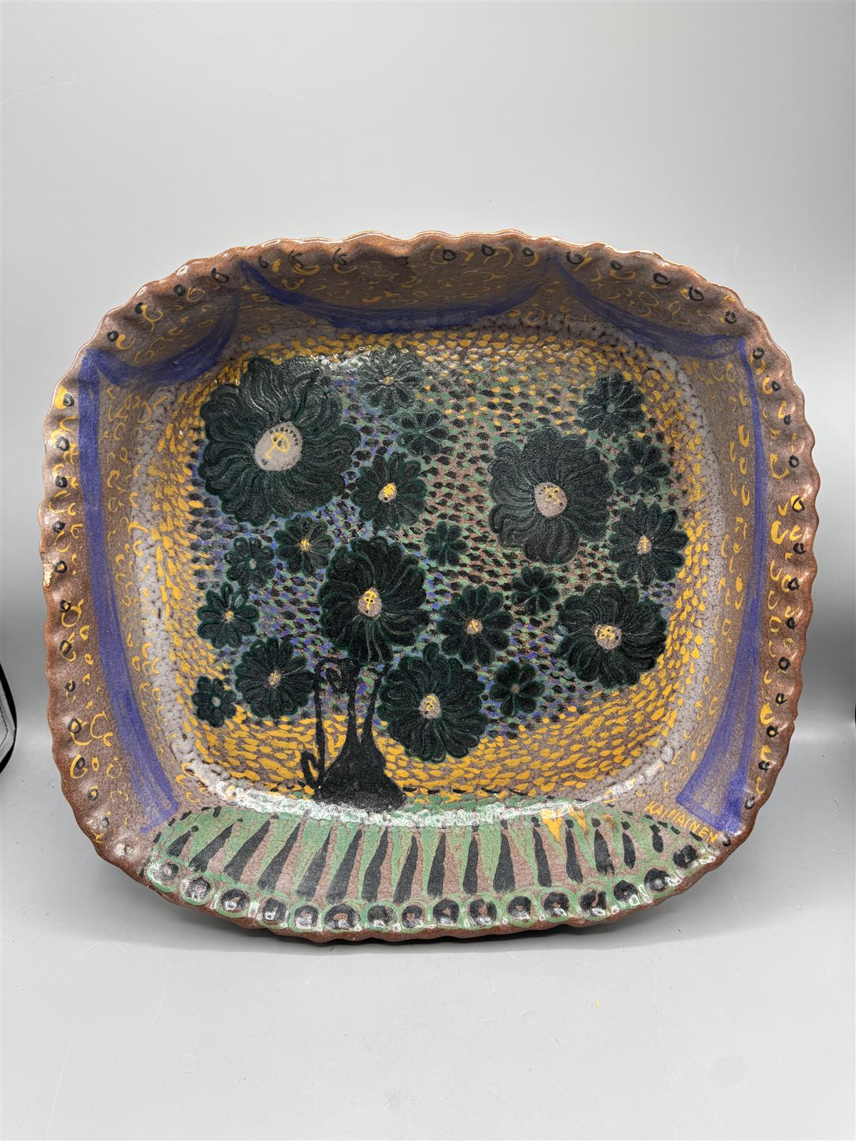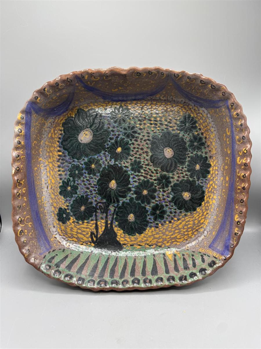 Värikäs, korkeareunainen keramiikkavati, jossa on kukkakuviointi ja aaltoileva rypytetty reuna. Birger Kaipiainen tunnetaan ainutlaatuisista ja taiteellisista keramiikkatöistään, jotka ovat usein koristeellisia ja värikkäitä. Tämä uniikki vati edustaa hänen tunnistettavaa tyyliään, joka yhdistää perinteisiä ja moderneja elementtejä. Arviolta 50 lukua.