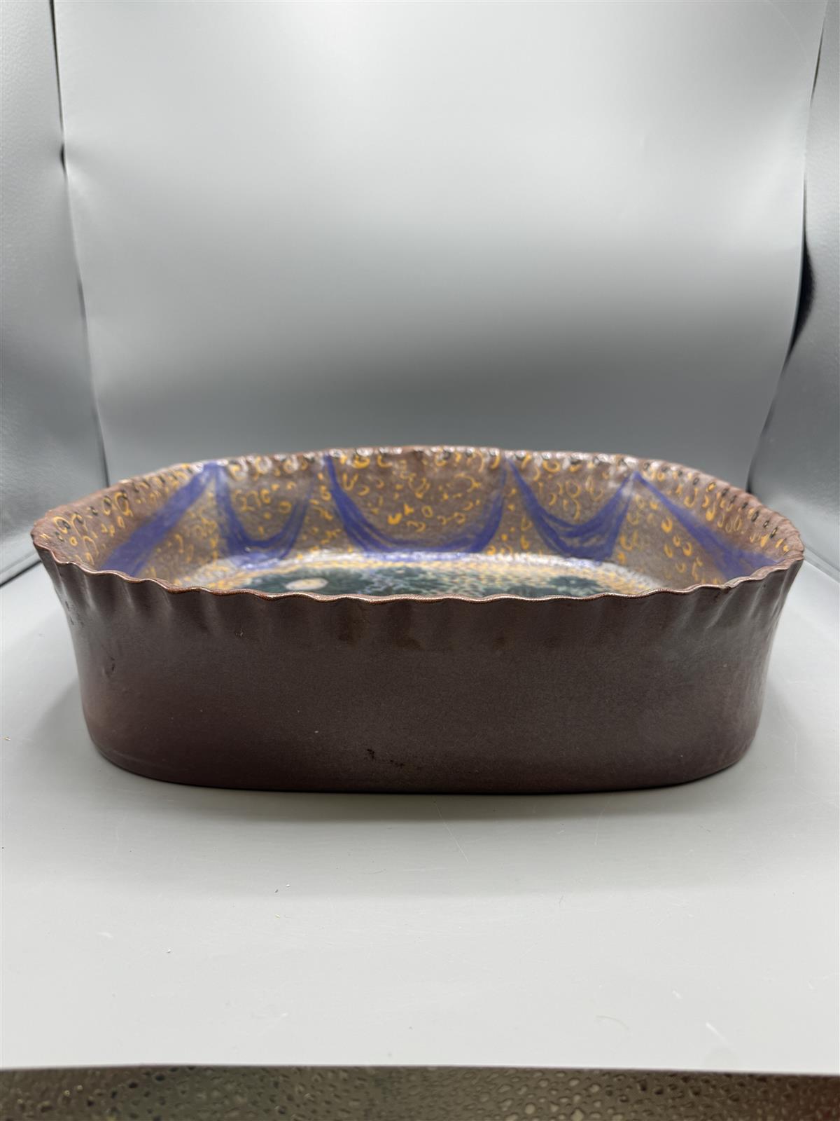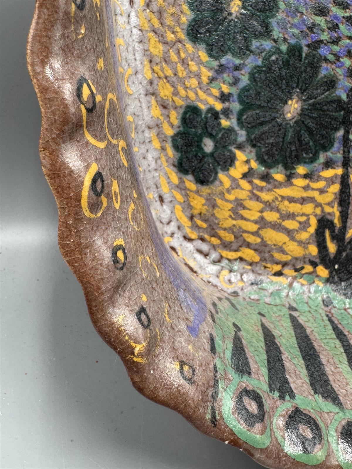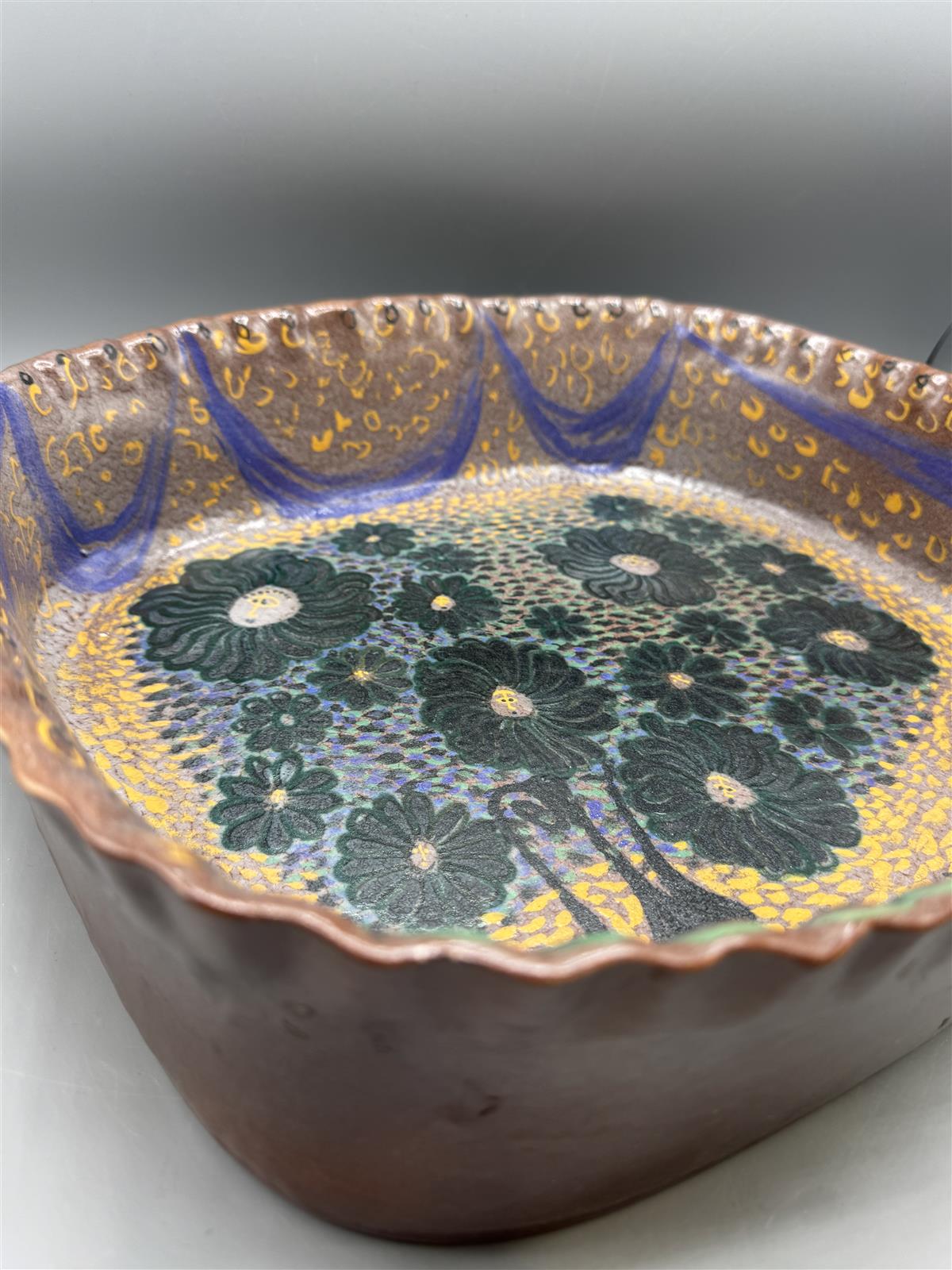 Värikäs, korkeareunainen keramiikkavati, jossa on kukkakuviointi ja aaltoileva rypytetty reuna. Birger Kaipiainen tunnetaan ainutlaatuisista ja taiteellisista keramiikkatöistään, jotka ovat usein koristeellisia ja värikkäitä. Tämä uniikki vati edustaa hänen tunnistettavaa tyyliään, joka yhdistää perinteisiä ja moderneja elementtejä. Arviolta 50 lukua.