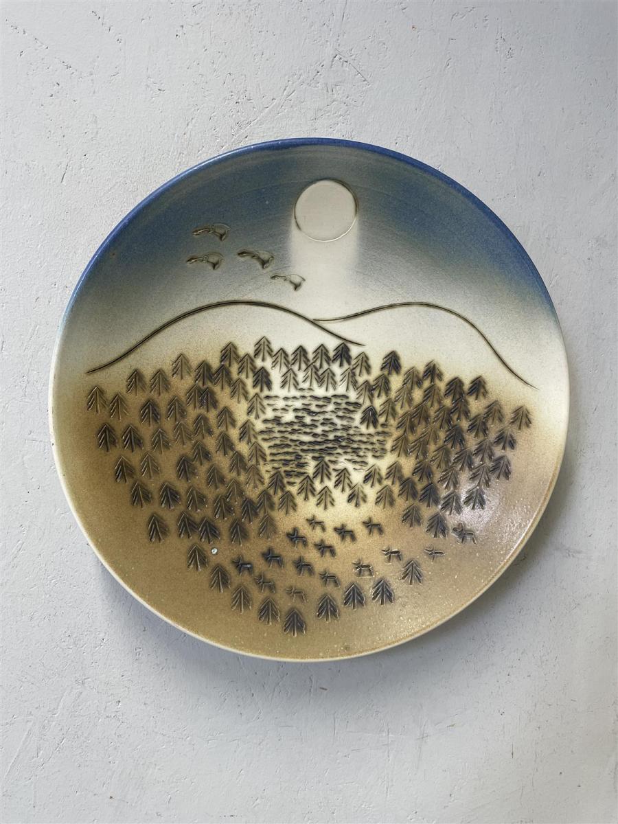 Bjarmia Kuusamo käsintehty koristeellinen iso seinälautanen/vati, jossa on maisemakuvio. Halkaisoja 40cm.