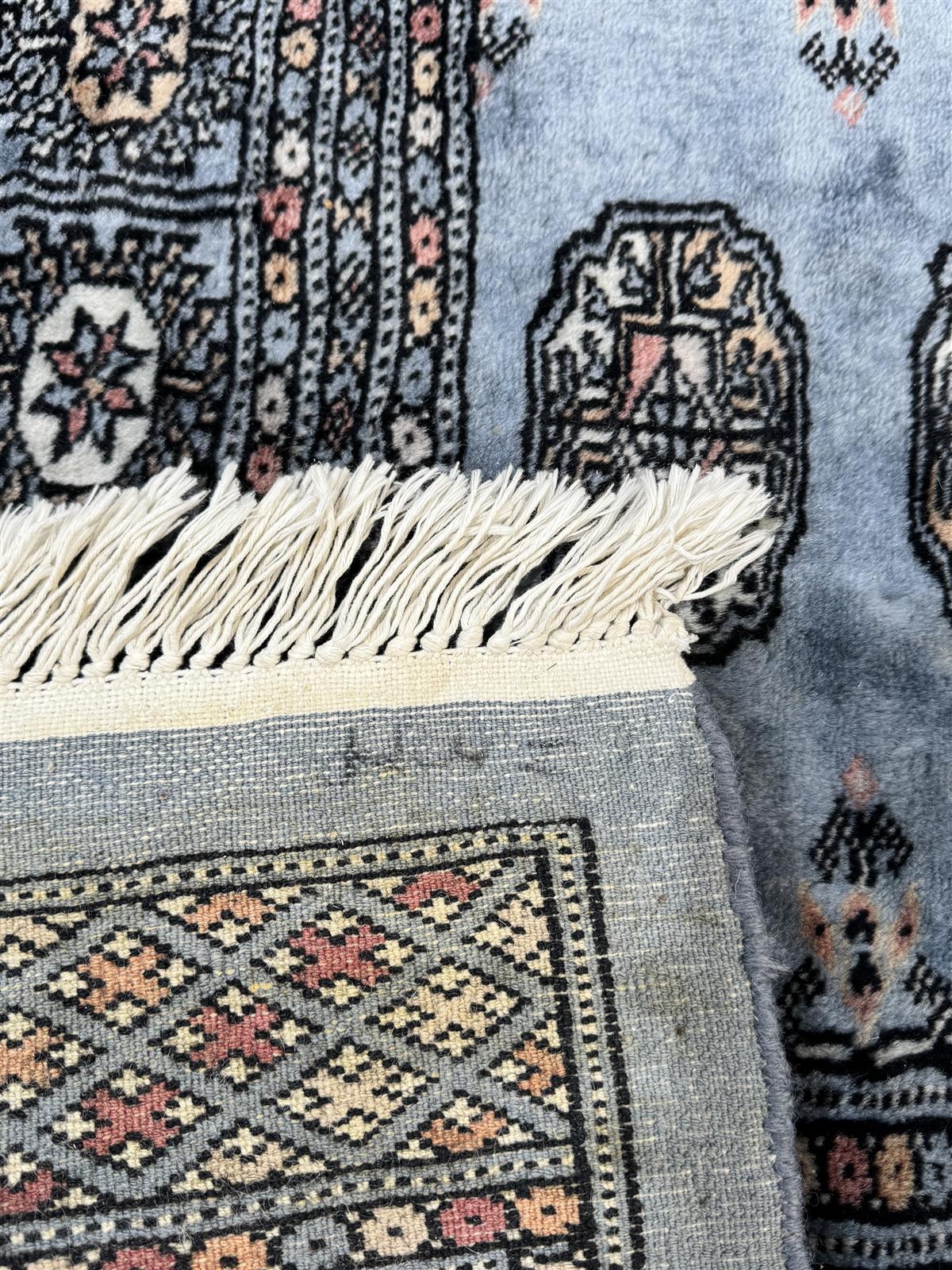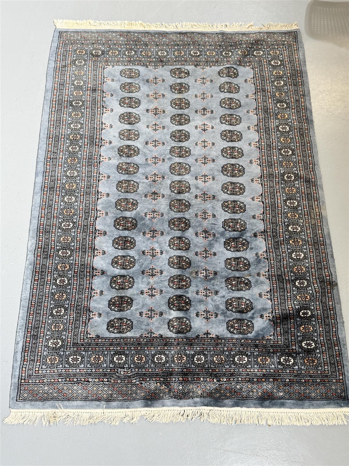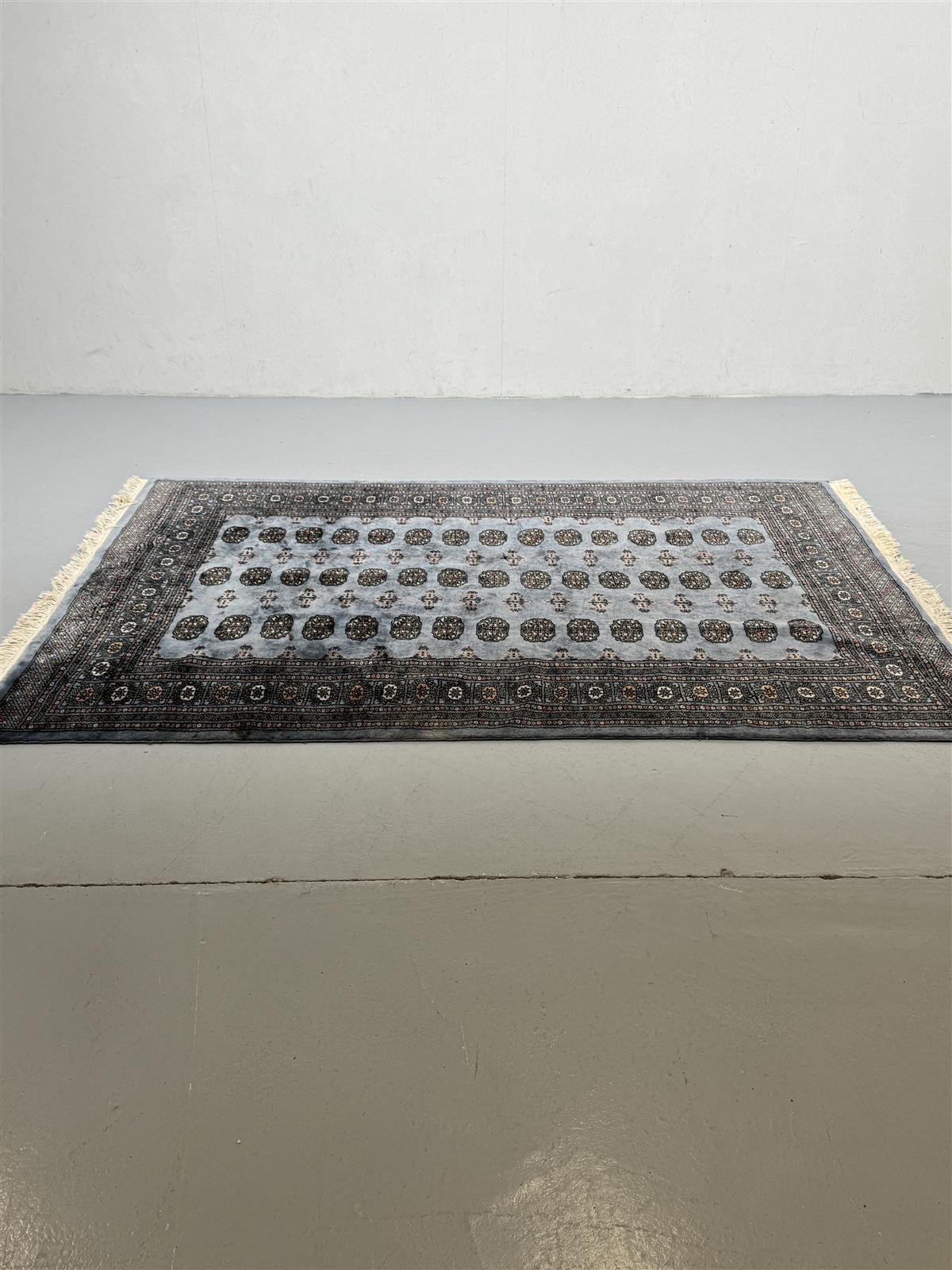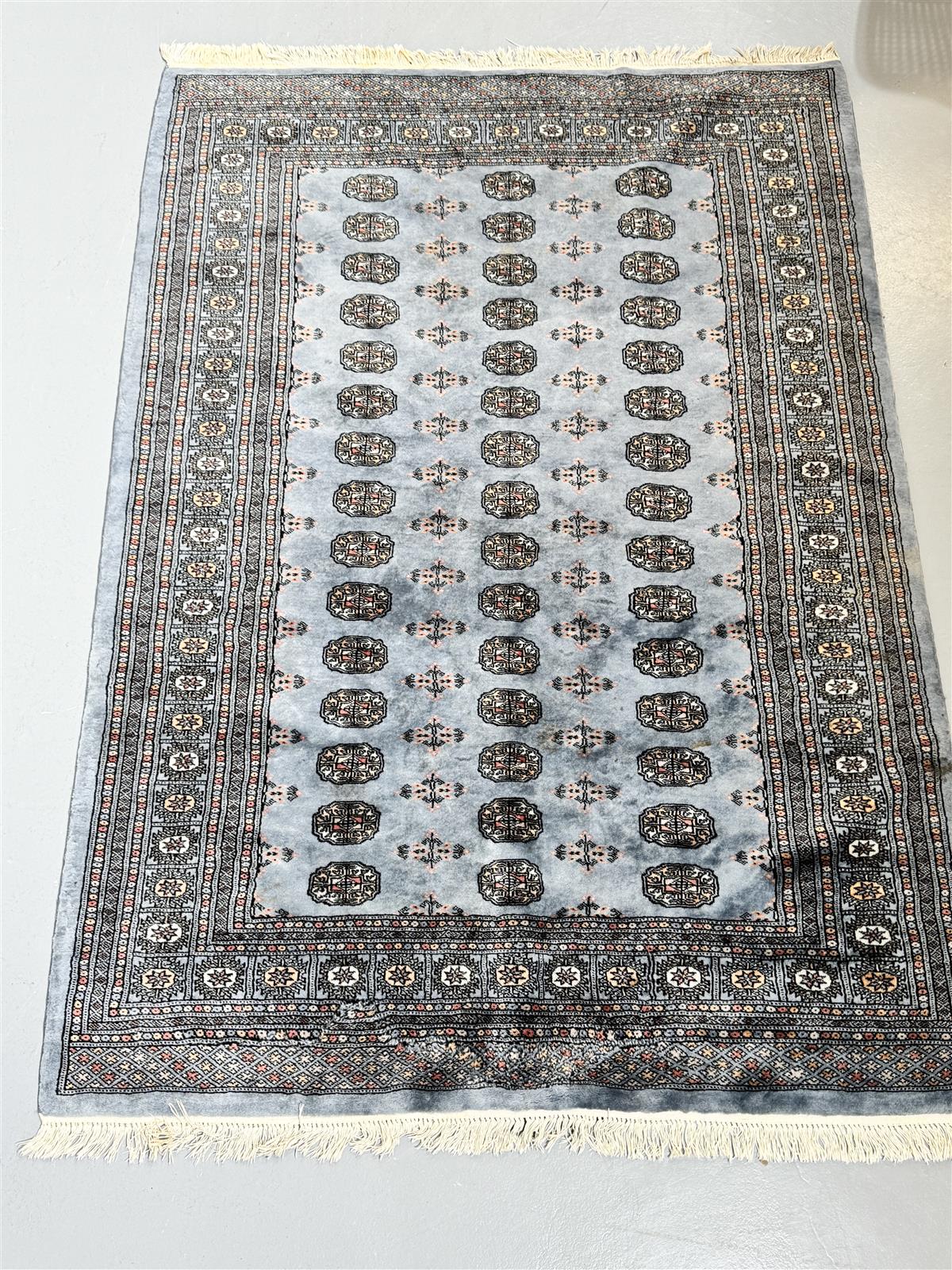 Itämainen Bokhara matto, jossa on monimutkainen geometrinen kuviointi ja hapsut reunoilla. Värimaailma on hillitty, pääosin harmaa-sininen ja musta, pienillä väripilkuilla.